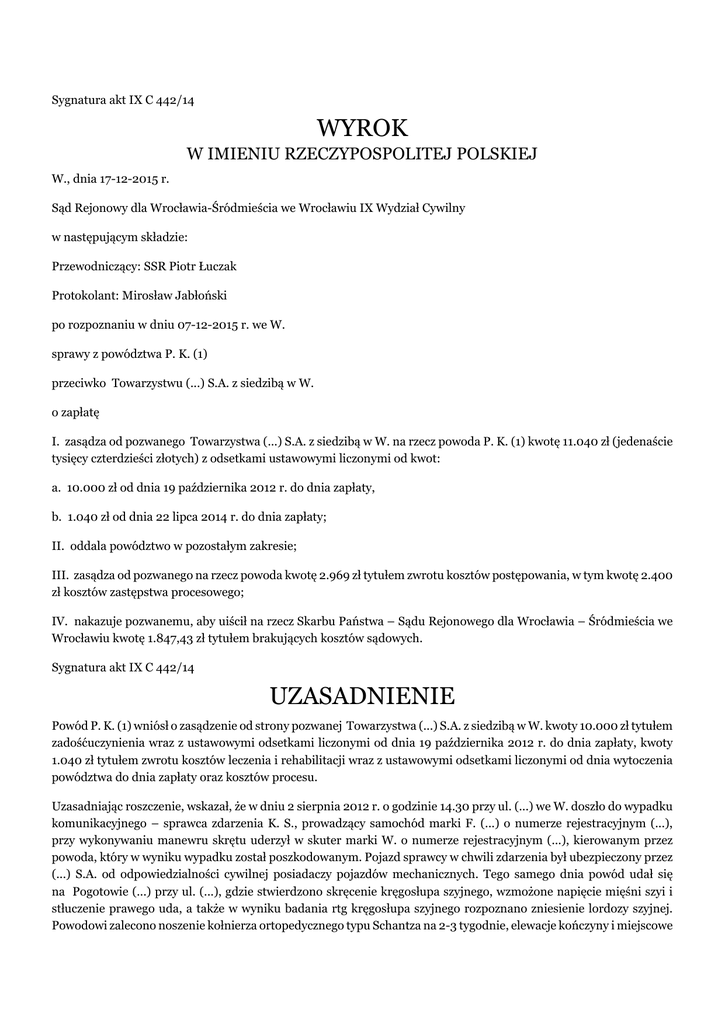Sygnatura akt IX C 442/14 WYROK W IMIENIU RZECZYPOSPOLITEJ POLSKIEJ W., dnia 17-12-2015 r. Sąd Rejonowy dla Wrocławia-Śródmieścia we Wrocławiu IX Wydział Cywilny w następującym składzie: Przewodniczący: SSR Piotr Łuczak Protokolant: Mirosław Jabłoński po rozpoznaniu w dniu 07-12-2015 r. we W. sprawy z powództwa P. K. (1) przeciwko Towarzystwu (...) S.A. z siedzibą w W. o zapłatę I. zasądza od pozwanego Towarzystwa (...) S.A. z siedzibą w W. na rzecz powoda P. K. (1) kwotę 11.040 zł (jedenaście tysięcy czterdzieści złotych) z odsetkami ustawowymi liczonymi od kwot: a. 10.000 zł od dnia 19 października 2012 r. do dnia zapłaty, b. 1.040 zł od dnia 22 lipca 2014 r. do dnia zapłaty; II. oddala powództwo w pozostałym zakresie; III. zasądza od pozwanego na rzecz powoda kwotę 2.969 zł tytułem zwrotu kosztów postępowania, w tym kwotę 2.400 zł kosztów zastępstwa procesowego; IV. nakazuje pozwanemu, aby uiścił na rzecz Skarbu Państwa – Sądu Rejonowego dla Wrocławia – Śródmieścia we Wrocławiu kwotę 1.847,43 zł tytułem brakujących kosztów sądowych. Sygnatura akt IX C 442/14 UZASADNIENIE Powód P. K. (1) wniósł o zasądzenie od strony pozwanej Towarzystwa (...) S.A. z siedzibą w W. kwoty 10.000 zł tytułem zadośćuczynienia wraz z ustawowymi odsetkami liczonymi od dnia 19 października 2012 r. do dnia zapłaty, kwoty 1.040 zł tytułem zwrotu kosztów leczenia i rehabilitacji wraz z ustawowymi odsetkami liczonymi od dnia wytoczenia powództwa do dnia zapłaty oraz kosztów procesu. Uzasadniając roszczenie, wskazał, że w dniu 2 sierpnia 2012 r. o godzinie 14.30 przy ul. (...) we W. doszło do wypadku komunikacyjnego – sprawca zdarzenia K. S., prowadzący samochód marki F. (...) o numerze rejestracyjnym (...), przy wykonywaniu manewru skrętu uderzył w skuter marki W. o numerze rejestracyjnym (...), kierowanym przez powoda, który w wyniku wypadku został poszkodowanym. Pojazd sprawcy w chwili zdarzenia był ubezpieczony przez (...) S.A. od odpowiedzialności cywilnej posiadaczy pojazdów mechanicznych. Tego samego dnia powód udał się na Pogotowie (...) przy ul. (...), gdzie stwierdzono skręcenie kręgosłupa szyjnego, wzmożone napięcie mięśni szyi i stłuczenie prawego uda, a także w wyniku badania rtg kręgosłupa szyjnego rozpoznano zniesienie lordozy szyjnej. Powodowi zalecono noszenie kołnierza ortopedycznego typu Schantza na 2-3 tygodnie, elewacje kończyny i miejscowe okłady. Podczas wizyty kontrolnej w dniu 29 października 2012 r. powód został skierowany na dalsze leczenie specjalistyczne w poradni neurologicznej, ortopedycznej i psychologicznej. U powoda stwierdzono m.in. bolesność wyrostków kolczastych w zakresie C4-C7, znaczne ograniczenie ruchomości kręgosłupa szyjnego we wszystkich zakresach ruchu, bolesność kolana prawego z ograniczeniem ruchomości oraz objawy korzeniowe. Po zakończeniu leczenia orzeczono długotrwały uszczerbek na zdrowiu w wysokości 10% w zakresie neurologicznym, natomiast w zakresie ortopedycznym w wysokości 7%. Powód odbył rehabilitację w postaci serii zabiegów: magnetoterapii, bioptronu, lasera i jonoforezy. Ponadto przedmiotowe zdarzenie miało niekorzystny wpływ na stan psychiczny powoda – ma problemy ze snem i silne lęki przed powtórzeniem się sytuacji. Ze względu na powstałe bóle, zawroty głowy, nudności, drętwienie rąk i palców powód musiał ograniczyć aktywność fizyczną (bieganie, siłownia, gra w piłkę nożną). Dolegliwości bólowe, zmniejszona koncentracja i powracające wspomnienia o zdarzeniu sprawiają, że powód jest podenerwowany i zestresowany, co odbija się negatywnie na relacjach z rodziną i otoczeniem. Powód nie może tak jak przed wypadkiem uczestniczyć w obowiązkach domowych – sprzątaniu, gotowaniu, robieniu zakupów, a także pomagać swojej matce samotnie wychowującej dzieci w opiece nad 12-letnim bratem, z którym często trenował grę w piłkę nożną. Powód mieszka na drugim piętrze w budynku bez windy, a chodzenie po schodach potęguje u niego dolegliwości bólowe. Wypadek negatywnie wpłynął również na wykonywaną przez niego pracę dostawcy posiłków. Po wypadku rozwiązano z nim umowę, a obecnie nie może znaleźć zatrudnienia. U powoda zdiagnozowano pourazowe zaburzenia stresowe. Powód wskazał, że poprzednik prawny strony pozwanej przyznał mu kwotę 800 zł tytułem zadośćuczynienia i kwotę 120 zł tytułem zwrotu kosztów leczenia, które to kwoty są zbyt niskie i nie spełniają funkcji kompensacyjnej, albowiem nie odzwierciedlają zakresu cierpień fizycznych i psychicznych powoda związanych z doznanymi urazami w wyniku wypadku w dniu 2 sierpnia 2012 r. W odpowiedzi na pozew strona pozwana Towarzystwo (...) S.A. z siedzibą w W. wniosła o oddalenie powództwa w całości i zasądzenie na jej rzecz od powoda kosztów procesu. Strona pozwana przyznała, że w związku z podjętym postępowaniem likwidacyjnym wypłaciła powodowi kwotę 800 zł tytułem zadośćuczynienia, która prowadzi do pełnej kompensacji poniesionej przez powoda krzywdy. Wskazała, że dokonując ustalenia wysokości należnego świadczenia, uwzględniła wszystkie okoliczności rzutujące na rozmiar wyrządzonej powodowi krzywdy. W chwili zdarzenia powód miał 19 lat, a zdolności adaptacyjne i regeneracyjne u osób młodszych są o wiele większe. Jednocześnie leczenie powoda przebiegało w sposób prawidłowy, przynosząc zamierzony efekt. Strona pozwana podniosła nadto, że ewentualne odsetki od przyznanej kwoty powinny być zasądzone od dnia wyrokowania. Odnosząc się natomiast do żądania w zakresie zwrotu kosztów leczenia, strona pozwana wskazała, że powód nie udowodnił, że korzystanie z prywatnej opieki medycznej było w jego sytuacji niezbędne, a wydatki na prywatną opiekę medyczną nie zostają w adekwatnym związku przyczynowym ze zdarzeniem wywołującym szkodę. Sąd ustalił nast