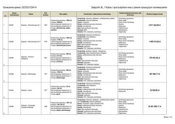 Oznaczenie sprawy: DZ/3321/234/14 Lp. 1 Numer inwentarzowy 002487 002490 Nazwa Budynek - Administracyjny Nr 1 Budynek - Administracyjny Nr 2 Załącznik 3b_1 Wykaz i opis budynków wraz z planem sytuacyjnym rozmieszczenia Rok budowy Opis ogólny Budynek - Archiwum Zakładowe Budynek - Bakteriologia Centralnego ogrzewania. Wody ciepłej. Wody zimnej i kanalizacji. Gazowa. Elektryczna. Teletechniczna. Niskoprądowa. Odgromowa. 2 871 222,90 zł 1976 Powierzchnia zabudowy: 1080 m2. Kubatura: 7100 m2. Ilość kondygnacji nadziemnych: 2. Ilość kondygnacji podziemnych: 1. Funkcja: administracja biurowa. Konstrukcja: mieszana monolityczna. Fundamenty: ława żelbetowa. Ściany: murowane. Stropy: prefabrykowane płyty otworowe. Schody: monolityczne. Dach: płyty korytkowe kryte papą. Elewacja: tradycyjna. Stolarka: PVC, drewniana, aluminiowa. Centralnego ogrzewania. Wody ciepłej. Wody zimnej i kanalizacji. Elektryczna. Teletechniczna. Odgromowa. 1 408 514,00 zł 1981 Powierzchnia zabudowy: 589 m2. Kubatura:2945m2. Ilość kondygnacji nadziemnych: 1. Ilość kondygnacji podziemnych: 0. Funkcja: archiwum. Konstrukcja: podłużna, słupowo - dźwigarowa. Fundamenty: stopy fundamentowe ze ściągami. Ściany: prefabrykowane płyty osłonowe. Stropy: Schody: Dach: płyty panwiowe kryte papą. Elewacja: tradycyjna. Stolarka: PVC, drewniana, stalowa. Centralnego ogrzewania. Wody ciepłej. Wody zimnej i kanalizacji. Elektryczna. Teletechniczna. Odgromowa. 570 491,68 zł 1977 Powierzchnia zabudowy: 268 m2. Kubatura: 1505 m2. Ilość kondygnacji nadziemnych: 1. Ilość kondygnacji podziemnych: 1. Funkcja: bakteriologia. Konstrukcja: mieszana monolityczna. Fundamenty: ława żelbetowa. Ściany: murowane. Stropy: prefabrykowane płyty otworowe. Schody: monolityczne. Dach: płyty korytkowe kryte papą. Elewacja: tradycyjna. Stolarka: PVC, drewniana, aluminiowa. Centralnego ogrzewania. Wody ciepłej. Wody zimnej i kanalizacji. Elektryczna. Teletechniczna. Odgromowa. 581 908,77 zł 1977 Powierzchnia zabudowy: 58 m2. Kubatura: 204 m2. Ilość kondygnacji nadziemnych: 1. Ilość kondygnacji podziemnych: 0. Funkcja: garaż. Konstrukcja: mieszana monolityczna. Fundamenty: ława żelbetowa. Ściany: murowane. Stropy: prefabrykowane płyty otworowe. Schody: monolityczne. Dach: płyty korytkowe kryte papą. Elewacja: tradycyjna. Stolarka: PVC, drewniana, aluminiowa. Centralnego ogrzewania. Elektryczna. 22 544,00 zł 1986 Powierzchnia zabudowy: 7007 m2. Kubatura: 108 150 m2. Ilość kondygnacji nadziemnych: 9. Ilość kondygnacji podziemnych: 1. Funkcja: szpital, administracja. Konstrukcja: mieszana, żelbetowa - prefabrykowany szkielet ram. Fundamenty: skrzynia żelbetowa. Ściany: murowane z cegły i bloczków PGS. Stropy: prefabrykowane płyty otworowe. Schody: monolityczne. Dach: płyty korytkowe kryte papą. Elewacja: systemowe płyty aluminiowe. Stolarka: PVC, drewniana, aluminiowa. Centralnego ogrzewania. Wody ciepłej. Wody zimnej i kanalizacji. Gazowa. Elektryczna. Teletechniczna. Niskoprądowa. Odgromowa. 35 401 080,17 zł 1997 4 002494 Budynek - Garaż 5 002486 6 Budynek - Górnośląski Ośrodek Kardiologii Wartość księgowa brutto Konstrukcja: mieszana, żelbetowa - prefabrykowany szkielet. Fundamenty: skrzynia żelbetowa. Ściany: murowane. Stropy: prefabrykowane płyry otworowe. Schody: monolityczne. Dach: płyty korytkowe kryte papą. Elewacja: BSO. Stolarka: PVC, drewniana, aluminiowa. 3 002488 Rodzaj instalacji technicznej, stan techniczny Powierzchnia zabudowy: 1860 m2. Kubatura: 8860m2. Ilość kondygnacji nadziemnych: 3. Ilość kondygnacji podziemnych: 1. Funkcja: administracja, apteka szpitalna 2 002496 Konstrukcja i rodzaj pokrycia dachowego Strona 1 z 5 Lp. Numer inwentarzowy Nazwa Rok budowy Opis ogólny Konstrukcja i rodzaj pokrycia dachowego Rodzaj instalacji technicznej, stan techniczny Wartość księgowa brutto Powierzchnia zabudowy: 7053 m2. Kubatura: 26 936 m2. Ilość kondygnacji nadziemnych: 9. Ilość kondygnacji podziemnych: 1. Funkcja: hotel. Centralnego ogrzewania. Wody ciepłej. Wody zimnej i kanalizacji. Elektryczna. Teletechniczna. Niskoprądowa. Odgromowa. 4 490 203,60 zł 7 Konstrukcja: mieszana, żelbetowa i murowana. Fundamenty: skrzynia żelbetowa. Ściany: prefabrykowane - wielka płyta. Stropy: prefabrykowane płyty otworowe. Schody: monolityczne. Dach: płyty panwiowe kryte papą. Elewacja: tradycyjna, frag. z płyt trapezowych. Stolarka: PVC, drewniana, aluminiowa. 1977 Powierzchnia zabudowy: 148 m2. Kubatura: 2810 m2. Ilość kondygnacji nadziemnych: 1. Ilość kondygnacji podziemnych: 0. Funkcja: hydroforownia. Centralnego ogrzewania. Wody zimnej i kanalizacji. Elektryczna. Teletechniczna. Odgromowa. 144 092,34 zł 8 Konstrukcja: mieszana żelbetowa i murowana. Fundamenty: ława żelbetowa. Ściany: murowane. Stropy: . Schody: Dach: płyty panwiowe kryte papą. Elewacja: tradycyjna. Stolarka: stalowa. 1978 Powierzchnia zabudowy: 1166 m2. Kubatura: 5025 m2. Ilość kondygnacji nadziemnych: 4. Ilość kondygnacji podziemnych: 0. Funkcja: kotłownia. Centralnego ogrzewania. Wody ciepłej. Wody zimnej i kanalizacji. Gazowa. Elektryczna. Teletechniczna. Odgromowa. 1 377 591,23 zł 9 Konstrukcja: mieszana żelbetowa i murowana. Fundamenty: ława żelbetowa. Ściany: prefabrykowane i tradycyjne. Stropy: monolityczne żelbetowe. Schody: monolityczne. Dach: płyty panwiowe kryte papą. Elewacja: tradycyjna. Stolarka: PVC, drewniana, aluminiowa. Powierzchnia zabudowy: 2021 m2. Kubatura: 14 069 m2. Ilość kondygnacji nadziemnych: 1. Ilość kondygnacji podziemnych: 1. Funkcja: kuchnia. Centralnego ogrzewania. Wody ciepłej. Wody zimnej i kanalizacji. Elektryczna. Teletechniczna. Odgromowa. 3 492 144,61 zł 10 Konstrukcja: mieszana słupowo - ryglowa. Fundamenty: ława żelbetowa. Ściany: prefabrykowane i tradycyjne. Stropy: monolityczne żelbetowe. Schody: monolityczne. Dach: płyty panwiowe kryte papą. Elewacja: tradycyjna. Stolarka: PVC, drewniana, aluminiowa. 1977 P