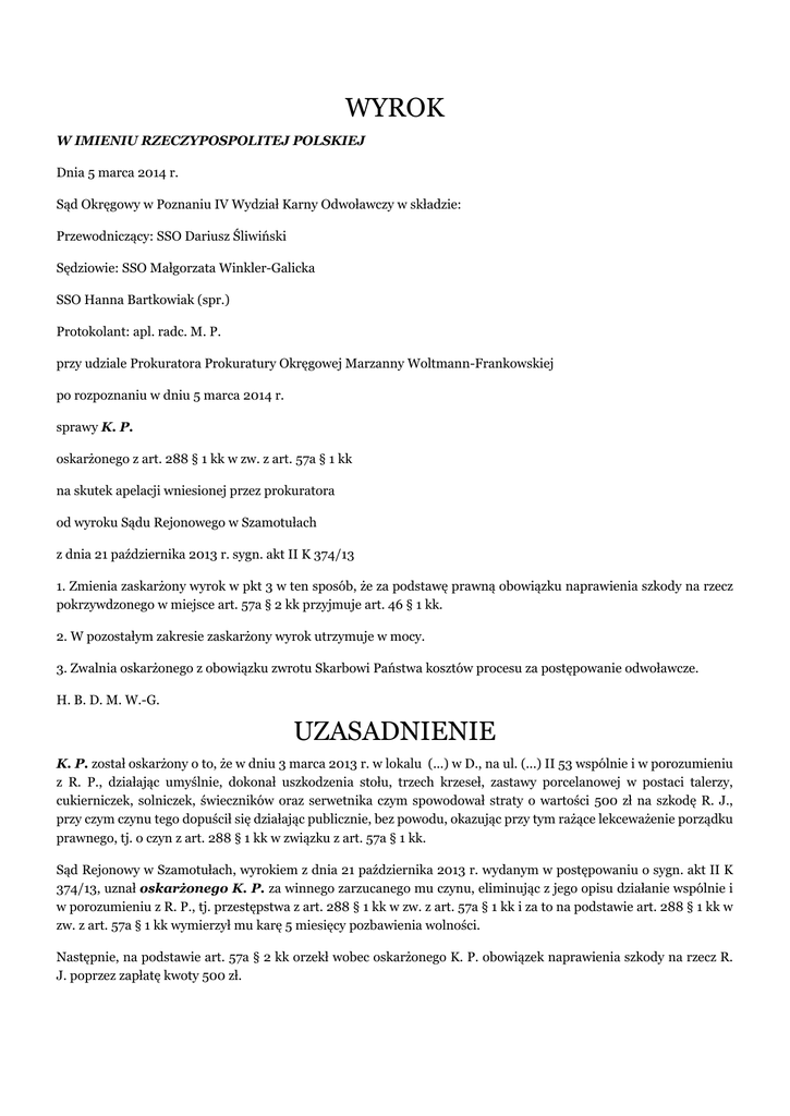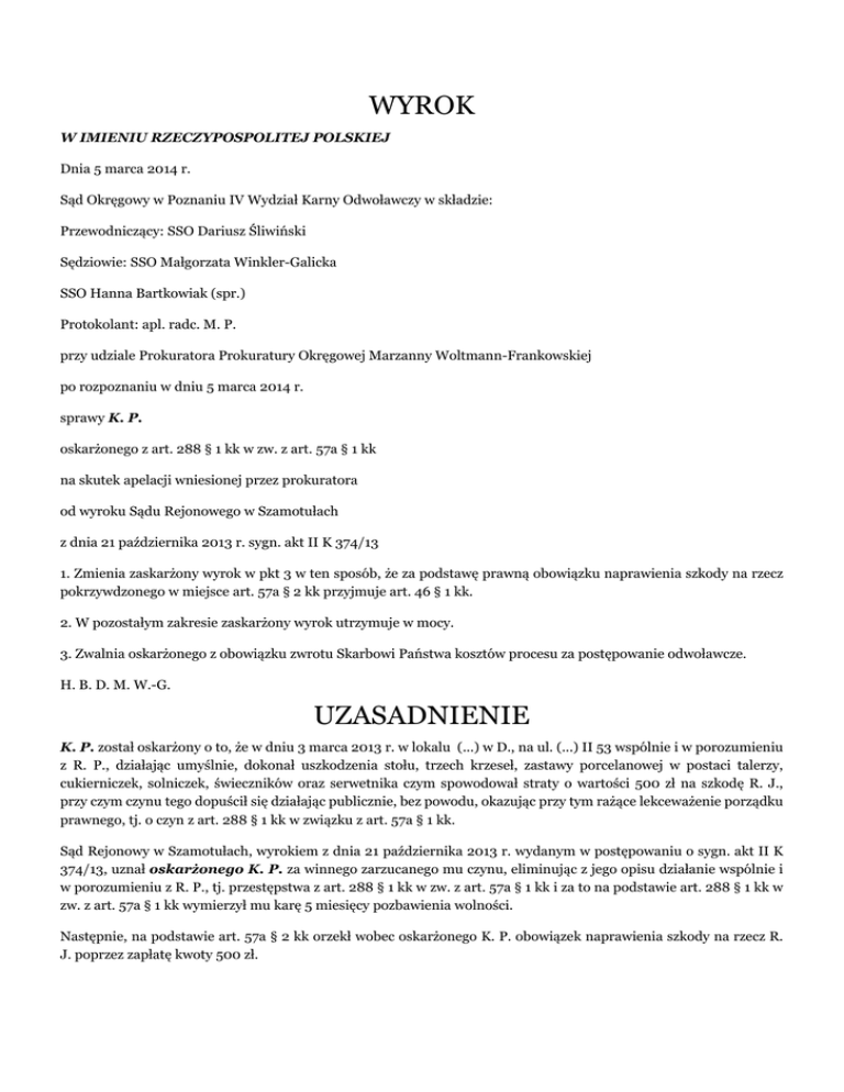 WYROK W IMIENIU RZECZYPOSPOLITEJ POLSKIEJ Dnia 5 marca 2014 r. Sąd Okręgowy w Poznaniu IV Wydział Karny Odwoławczy w składzie: Przewodniczący: SSO Dariusz Śliwiński Sędziowie: SSO Małgorzata Winkler-Galicka SSO Hanna Bartkowiak (spr.) Protokolant: apl. radc. M. P. przy udziale Prokuratora Prokuratury Okręgowej Marzanny Woltmann-Frankowskiej po rozpoznaniu w dniu 5 marca 2014 r. sprawy K. P. oskarżonego z art. 288 § 1 kk w zw. z art. 57a § 1 kk na skutek apelacji wniesionej przez prokuratora od wyroku Sądu Rejonowego w Szamotułach z dnia 21 października 2013 r. sygn. akt II K 374/13 1. Zmienia zaskarżony wyrok w pkt 3 w ten sposób, że za podstawę prawną obowiązku naprawienia szkody na rzecz pokrzywdzonego w miejsce art. 57a § 2 kk przyjmuje art. 46 § 1 kk. 2. W pozostałym zakresie zaskarżony wyrok utrzymuje w mocy. 3. Zwalnia oskarżonego z obowiązku zwrotu Skarbowi Państwa kosztów procesu za postępowanie odwoławcze. H. B. D. M. W.-G. UZASADNIENIE K. P. został oskarżony o to, że w dniu 3 marca 2013 r. w lokalu (...) w D., na ul. (...) II 53 wspólnie i w porozumieniu z R. P., działając umyślnie, dokonał uszkodzenia stołu, trzech krzeseł, zastawy porcelanowej w postaci talerzy, cukierniczek, solniczek, świeczników oraz serwetnika czym spowodował straty o wartości 500 zł na szkodę R. J., przy czym czynu tego dopuścił się działając publicznie, bez powodu, okazując przy tym rażące lekceważenie porządku prawnego, tj. o czyn z art. 288 § 1 kk w związku z art. 57a § 1 kk. Sąd Rejonowy w Szamotułach, wyrokiem z dnia 21 października 2013 r. wydanym w postępowaniu o sygn. akt II K 374/13, uznał oskarżonego K. P. za winnego zarzucanego mu czynu, eliminując z jego opisu działanie wspólnie i w porozumieniu z R. P., tj. przestępstwa z art. 288 § 1 kk w zw. z art. 57a § 1 kk i za to na podstawie art. 288 § 1 kk w zw. z art. 57a § 1 kk wymierzył mu karę 5 miesięcy pozbawienia wolności. Następnie, na podstawie art. 57a § 2 kk orzekł wobec oskarżonego K. P. obowiązek naprawienia szkody na rzecz R. J. poprzez zapłatę kwoty 500 zł. W oparciu natomiast o art. 626 § 1 kpk w zw. art. 633 kpk w zw. z art. 2 ust. 1 pkt. 2 ustawy o opłatach w sprawach karnych obciążył oskarżonego K. P. kosztami postępowania w 1/2 części i wymierzył mu opłatę w kwocie 120 zł, zaś w pozostałej części na podstawie art. 632 pkt 2 kpk kosztami postępowania obciążył Skarb Państwa. Powyższy wyrok, w części rozstrzygającej o obowiązku naprawienia szkody, zaskarżył na niekorzyść oskarżonego, prokurator. Zarzucił on orzeczeniu obrazę prawa materialnego – art. 46 § 1 kk poprzez wskazanie jako podstawy orzeczonego wobec K. P. obowiązku naprawienia szkody art. 57a § 2 kk, podczas gdy prawidłową podstawą orzeczenia wobec wymienionego obowiązku naprawienia szkody powinien być przepis art. 46 § 1 kk. Wywodząc tak, apelujący wniósł o zmianę wyroku w części orzekającej o obowiązku naprawienia szkody, poprzez zastosowanie jako jego podstawy art. 46 § 1 kk, a w pozostałym zakresie pozostawienie wyroku w niezmienionym kształcie. Sąd Okręgowy zważył, co następuje: Apelacja okazała się zasadna i zasługiwała na uwzględnienie. Konsekwencją tego stwierdzenia była zawnioskowana przez prokuratora zmiana zaskarżonego wyroku. Przed przystąpieniem do uzasadnienia powyższego stanowiska należy zaznaczyć, że apelujący nie podważał w żadnej mierze ustaleń poczynionych przez Sąd I instancji odnośnie stanu faktycznego sprawy, uznania winy oskarżonego czy też kwalifikacji prawnej jego czynu. Nie podnosił on także by w trakcie postępowania przed tym Sądem, czy też w jego orzeczeniu, dopuszczono się uchybienia z kategorii tzw. bezwzględnych przesłanek odwoławczych wymienionych w art. 439 i 440 kpk. Takich przesłanek nie stwierdzono również z urzędu. W toku przeprowadzonej kontroli instancyjnej – poza uchybieniem, które wytknięto w środku odwoławczym – nie stwierdzono żadnej innej okoliczności, która mogłaby zostać uznana za względną przesłankę odwoławczą z art. 438 kpk. W opinii Sądu Okręgowego nie uzewnętrzniła się zatem jakakolwiek okoliczność, która przemawiałaby za uchyleniem, bądź zmianą zaskarżonego orzeczenia niezależnie od granic zaskarżenia i podniesionych w apelacji zarzutów. Ponieważ apelacja skarżyła wyrok w części rozstrzygającej o karze, podkreślić trzeba, że Sąd II instancji, będąc zobligowanym treścią art. 447 § 2 kpk, rozważył prawidłowość całego rozstrzygnięcia o karze i środkach karnych, zbadawszy je pod kątem współmierności. Dla właściwego zrelacjonowania działań w tym zakresie zasadnym będzie przypomnienie, że w świetle orzecznictwa Sądu Najwyższego, zarzut niewspółmierności kary (jak i środka karnego), jako zarzut z kategorii ocen, można podnosić wówczas „gdy kara jakkolwiek mieści się w granicach ustawowego zagrożenia, nie uwzględnia w sposób właściwy zarówno okoliczności popełnienia przestępstwa, jak i osobowości sprawcy, innymi słowy – gdy w społecznym odczuciu jest karą niesprawiedliwą” (wyrok SN z 11 kwietnia 1985r. V KRN 178/85, OSNKW 1985/7-8/60). Odnosząc te założenia do realiów niniejszej sprawy, w tym okoliczności przedmiotowo-podmiotowych popełnionego czynu oraz danych osobopoznawczych zebranych o oskarżonym K. P., należało uznać, że kara wymierzona mu za popełniony występek w żadnym razie nie były rażąco niewspółmierna. Trafnie odzwierciedla ona jego winę, istotną szkodliwość społeczną zachowania i oddaje właściwie społeczny sprzeciw dla sprawców tej kategorii przestępstw. Bezbłędnie zostały przy tym wyliczone przez Sąd Rejonowy te elementy działania sprawcy, które świadczyły z jednej strony na korzyść, a drugiej strony na niekorzyść w/wym. Prawidłowymi były też te spostrzeżenia, które organ ten poczynił odnośn