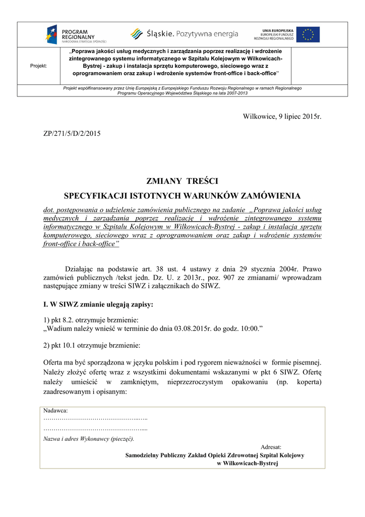 Projekt: „Poprawa jakości usług medycznych i zarządzania poprzez realizację i wdroŜenie zintegrowanego systemu informatycznego w Szpitalu Kolejowym w WilkowicachBystrej - zakup i instalacja sprzętu komputerowego, sieciowego wraz z oprogramowaniem oraz zakup i wdroŜenie systemów front-office i back-office” Projekt współfinansowany przez Unię Europejską z Europejskiego Funduszu Rozwoju Regionalnego w ramach Regionalnego Programu Operacyjnego Województwa Śląskiego na lata 2007-2013 Wilkowice, 9 lipiec 2015r. ZP/271/5/D/2/2015 ZMIANY TREŚCI SPECYFIKACJI ISTOTNYCH WARUNKÓW ZAMÓWIENIA dot. postępowania o udzielenie zamówienia publicznego na zadanie „Poprawa jakości usług medycznych i zarządzania poprzez realizację i wdroŜenie zintegrowanego systemu informatycznego w Szpitalu Kolejowym w Wilkowicach-Bystrej - zakup i instalacja sprzętu komputerowego, sieciowego wraz z oprogramowaniem oraz zakup i wdroŜenie systemów front-office i back-office” Działając na podstawie art. 38 ust. 4 ustawy z dnia 29 stycznia 2004r. Prawo zamówień publicznych /tekst jedn. Dz. U. z 2013r., poz. 907 ze zmianami/ wprowadzam następujące zmiany w treści SIWZ i załącznikach do SIWZ. I. W SIWZ zmianie ulegają zapisy: 1) pkt 8.2. otrzymuje brzmienie: „Wadium naleŜy wnieść w terminie do dnia 03.08.2015r. do godz. 10:00.” 2) pkt 10.1 otrzymuje brzmienie: Oferta ma być sporządzona w języku polskim i pod rygorem niewaŜności w formie pisemnej. NaleŜy złoŜyć ofertę wraz z wszystkimi dokumentami wskazanymi w pkt 6 SIWZ. Ofertę naleŜy umieścić w zamkniętym, nieprzezroczystym opakowaniu (np. koperta) zaadresowanym i opisanym: Nadawca: ………………………………………..….. ………………………………………….... Nazwa i adres Wykonawcy (pieczęć). Adresat: Samodzielny Publiczny Zakład Opieki Zdrowotnej Szpital Kolejowy w Wilkowicach-Bystrej Projekt: „Poprawa jakości usług medycznych i zarządzania poprzez realizację i wdroŜenie zintegrowanego systemu informatycznego w Szpitalu Kolejowym w WilkowicachBystrej - zakup i instalacja sprzętu komputerowego, sieciowego wraz z oprogramowaniem oraz zakup i wdroŜenie systemów front-office i back-office” Projekt współfinansowany przez Unię Europejską z Europejskiego Funduszu Rozwoju Regionalnego w ramach Regionalnego Programu Operacyjnego Województwa Śląskiego na lata 2007-2013 PRZETARG NIEOGRANICZONY OFERTA NA: „Poprawa jakości usług medycznych i zarządzania poprzez realizację i wdroŜenie zintegrowanego systemu informatycznego w Szpitalu Kolejowym w Wilkowicach-Bystrej zakup i instalacja sprzętu komputerowego, sieciowego wraz z oprogramowaniem oraz zakup i wdroŜenie systemów front-office i back-office” !!! Nie otwierać przed terminem otwarcia !!! 03.08.2015r. . godz. 10:15 3) pkt 11.1 otrzymuje brzmienie: „Ofertę naleŜy złoŜyć Zamawiającemu: Samodzielny Publiczny Zakład Opieki Zdrowotnej Szpital Kolejowy w Wilkowicach-Bystrej, ul. śywiecka 19, 43-365 Wilkowice, w terminie do dnia 03.08.2015r. , do godz. 10:00.” 4) pkt 11.3 otrzymuje brzmienie: „Otwarcie ofert nastąpi w Samodzielnym Publicznym Zakładzie Opieki Zdrowotnej Szpital Kolejowy w Wilkowicach-Bystrej, ul. śywiecka 19, 43-365 Wilkowice, dnia 03.08.2015r., godz. 10:15.” II. W załączniku nr 1 do SIWZ – Szczegółowy opis przedmiotu zamówienia zmianie ulegają: 1) W części IV. Zakup i wdroŜenie systemów front-office i back office – wymagania ogólne wykreślono zapisy: a) ”System powinien umoŜliwić obsługę procesów biznesowych realizowanych w szpitalu tzn. powinien: - pokazywać tylko to, co w danym momencie jest najwaŜniejsze, - udostępniać tylko te zadania, które na danym etapie powinny zostać wykonane, - umoŜliwić wprowadzenie tylko tych danych, które są niezbędne,” b) „Musi istnieć moŜliwość obsługi aplikacji wyłącznie przy uŜyciu klawiatury, bez konieczności uŜywania myszki” 2) W części IV. Zakup i wdroŜenie systemów front-office i back office – Oddział zmieniono zapisy: a) „Wyszukiwanie pacjentów na liście wg róŜnych parametrów, w tym: Projekt: „Poprawa jakości usług medycznych i zarządzania poprzez realizację i wdroŜenie zintegrowanego systemu informatycznego w Szpitalu Kolejowym w WilkowicachBystrej - zakup i instalacja sprzętu komputerowego, sieciowego wraz z oprogramowaniem oraz zakup i wdroŜenie systemów front-office i back-office” Projekt współfinansowany przez Unię Europejską z Europejskiego Funduszu Rozwoju Regionalnego w ramach Regionalnego Programu Operacyjnego Województwa Śląskiego na lata 2007-2013 - stan pacjenta - status pacjenta ( przysłany z IP, przebywający na oddziale, skierowany do innej jednostki, na przepustce, uciekinier) - identyfikator pacjenta - lekarz prowadzący - nazwisko i imię - nr księgi głównej - rozpoznanie - płatnik - nr kartoteki i karty pacjenta - zlecenia modyfikowane w ciągu ostatnich X godzin - z aktualnymi zleceniami leków - z przepustkami do zatwierdzenia - zlecenia leków do potwierdzenia - bez opisu historii choroby - daty urodzenia - wyszukanie pacjenta z wykorzystanie kodu paskowego z opaski” b) „Wydruki dokumentów zewnętrznych Oddziału, w tym: - Karta Statystyczna, - Karta ZakaŜenia Szpitalnego, - Karta Nowotworowa, - Karta Zgłoszenia Choroby Zakaźnej, - Karta Zgonu, - Karta TISS28.” c) „Obsługa Ksiąg: - Księga Główna, - Oddziałowa, - Oczekujących, - Zgonów, - Zabiegów - Transfuzji - Raportów Lekarskich - Raportów Pielęgniarskich” 3) W części IV. Zakup i wdroŜenie systemów front-office i back office – Statystyka ruchu chorych zmieniono zapisy: a) „wbudowane wydruki zewnętrzne: - Karta Statystyczna, - Karta Zgonu,” b) „obsługa Ksiąg: - Księga Główna, - Księga Odmów, Projekt: „Poprawa jakości usług medycznych i zarządzania poprzez realizację i wdroŜenie zintegrowanego systemu informatycznego w Szpitalu Kole