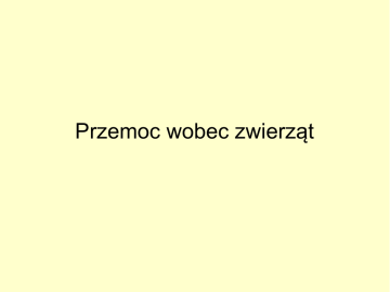 Przemoc wobec zwierząt Każde zwierzę ma pewne prawa, a nieznajomość i lekceważenie tych praw sprowadziłyby człowieka i prowadzą go nadal przeciwko naturze i zwierzętom Uznanie przez gatunek ludzki prawa innych gatunków zwierzęcych do egzystencji stanowi zatem podstawę współistnienia wszystkich istot żywych. Poszanowanie zwierząt przez człowieka wiąże się z poszanowaniem ludzi między sobą. Dlatego już od najmłodszych lat należy człowieka uczyć obserwować, rozumieć,szanować i kochać zwierzęta." Światowa Deklaracja Praw Zwierząt Rodzaje przemocy wobec zwierząt: 1. zranienie lub okaleczenie zwierzęcia, 2. używanie do pracy lub w celach zarobkowych chorego zwierzęcia, 3. bicie zwierząt przedmiotami ostrymi i twardymi lub zaopatrzonymi w urządzenia nastawione na sprawianie bólu, bicie po głowie, dolnej części brzucha, kończynach, 4. używanie uprzęży, pęt, stelarzy, więzów lub innych urządzeń zmuszających zwierzę do przebywania w nienaturalnej pozycji, powodujących ból, uszkodzenia ciała lub śmierć 5. Złośliwe straszenie lub drażnienie zwierząt 6. Utrzymywanie zwierząt w niewłaściwych warunkach bytowania w tym warunkach niechlujstwa oraz w pomieszczeniach nieumżliwiającym im zachowanie naturalnej pozycji. 7. porzucanie zwierzęcia, a w szczególności psa lub kota przez osobę, pod której opieką zwierze pozostaje. 8. Stosowanie okrutnych metod w chowie i hodowli zwierząt Przykłady okrucieństwa wobec zwierząt Nie umieszczono zdjęć ze względu na ich drastyczność Wieszanie zwierząt Przywiązywanie do drzew i pozostawianie Polewanie substancjami chemicznymi Bicie zwierząt różnymi narzędziami Podpalanie Głodzenie Zaniedbywanie Zakopywanie żywych zwierząt Gdzie zgłaszać przypadki przemocy wobec zwierząt? Inspektorat Ogólnopolskiego Towarzystwa Ochrony Zwierząt Komisariat Policji Inspektorat Inspekcji Weterynaryjnej Jednostka Straży Miejskiej Inną organizację zajmującą się ochroną zwierząt Konsekwencje prawne Ustawa z dnia 21 sierpnia 1997 r. o ochronie zwierząt Art. 35. 1. Kto zabija zwierzę z naruszeniem przepisów art. 6 ust. 1, art. 33 lub art. 34 ust. 1-4 albo znęca się nad nim w sposób określony w art. 6 ust. 2, podlega grzywnie, karze ograniczenia wolności albo pozbawienia wolności do roku 2. Jeżeli sprawca czynu określonego w ust. 1 działa ze szczególnych okrucieństwem, podlega grzywnie, karze ograniczenia wolności albo pozbawienia wolności do lat dwóch 5.W razie skazania za przestępstwo określone w ust. 1 lub 2, sąd może orzec nawiązkę w wysokości od 25 zł do 2.500 zł na rzecz Towarzystwa Opieki nad Zwierzętami w Polsce albo na inny cel związany z ochroną zwierząt, wskazany przez sąd. A Ty co możesz zrobić? Nie bądź obojętny.... ALARMUJ