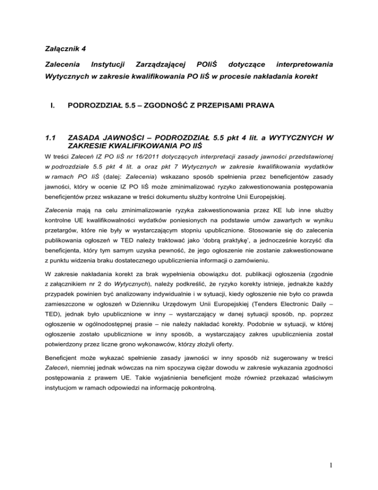 Załącznik 4 Zalecenia Instytucji Zarządzającej POIiŚ dotyczące interpretowania Wytycznych w zakresie kwalifikowania PO IiŚ w procesie nakładania korekt I. 1.1 PODROZDZIAŁ 5.5 – ZGODNOŚĆ Z PRZEPISAMI PRAWA ZASADA JAWNOŚCI – PODROZDZIAŁ 5.5 pkt 4 lit. a WYTYCZNYCH W ZAKRESIE KWALIFIKOWANIA PO IIŚ W treści Zaleceń IZ PO IiŚ nr 16/2011 dotyczących interpretacji zasady jawności przedstawionej w podrozdziale 5.5 pkt 4 lit. a oraz pkt 7 Wytycznych w zakresie kwalifikowania wydatków w ramach PO IiŚ (dalej: Zalecenia) wskazano sposób spełnienia przez beneficjentów zasady jawności, który w ocenie IZ PO IiŚ może zminimalizować ryzyko zakwestionowania postępowania beneficjentów przez wskazane w treści dokumentu służby kontrolne Unii Europejskiej. Zalecenia mają na celu zminimalizowanie ryzyka zakwestionowania przez KE lub inne służby kontrolne UE kwalifikowalności wydatków poniesionych na podstawie umów zawartych w wyniku przetargów, które nie były w wystarczającym stopniu upublicznione. Stosowanie się do zalecenia publikowania ogłoszeń w TED należy traktować jako ‘dobrą praktykę’, a jednocześnie korzyść dla beneficjenta, który tym samym uzyska pewność, że jego ogłoszenie nie zostanie zakwestionowane z punktu widzenia braku dostatecznego upublicznienia informacji o zamówieniu. W zakresie nakładania korekt za brak wypełnienia obowiązku dot. publikacji ogłoszenia (zgodnie z załącznikiem nr 2 do Wytycznych), należy podkreślić, że ryzyko korekty istnieje, jednakże każdy przypadek powinien być analizowany indywidualnie i w sytuacji, kiedy ogłoszenie nie było co prawda zamieszczone w ogłoszeń w Dzienniku Urzędowym Unii Europejskiej (Tenders Electronic Daily – TED), jednak było upublicznione w inny – wystarczający w danej sytuacji sposób, np. poprzez ogłoszenie w ogólnodostępnej prasie – nie należy nakładać korekty. Podobnie w sytuacji, w której ogłoszenie zostało upublicznione w inny sposób, a wystarczający zakres upublicznienia został potwierdzony przez liczne grono wykonawców, którzy złożyli oferty. Beneficjent może wykazać spełnienie zasady jawności w inny sposób niż sugerowany w treści Zaleceń, niemniej jednak wówczas na nim spoczywa ciężar dowodu w zakresie wykazania zgodności postępowania z prawem UE. Takie wyjaśnienia beneficjent może również przekazać właściwym instytucjom w ramach odpowiedzi na informację pokontrolną. 1 1.2 ZASADA EFEKTYWNOŚCI WYDATKU – PODROZDZIAŁ 5.5. pkt 6 lit. a ppkt iii) oraz lit. b ppkt iv) WYTYCZNYCH W ZAKRESIE KWALIFIKOWANIA PO IIŚ Umowy dotyczące zamówień, o których mowa w podrozdziale 5.5. pkt 6 lit. a ppkt iii) oraz lit. b ppkt iv) beneficjent jest zobowiązany zawierać w sposób efektywny, zachowując przy tym formę pisemną, chyba że odrębne przepisy wymagają innej formy szczególnej. Ze względu na szczególne okoliczności zawarcia ww. umów, czyli przesłanki analogiczne do przesłanek, o których mowa w art. 67 oraz art. 134 ust. 6 ustawy Pzp, przeprowadzenie rozeznania rynku może być niemożliwe. Niemniej jednak beneficjent powinien wykazać efektywność wydatku poniesionego na podstawie ww. umów. W takie sytuacji nie należy nakładać korekty za brak rozeznania rynku, zgodnie z załącznikiem nr 2 do Wytycznych. II. KWALIFIKOWALNOŚĆ ROBÓT DODATKOWYCH – PODROZDZIAŁ 6.4.2 WYTYCZNYCH W ZAKRESIE KWALIFIKOWANIA POIiŚ 2.1 PUBLIKACJA OGŁOSZENIA O ZAMIARZE ZAWARCIA UMOWY Zgodnie z pkt 6.4.2.2) lit c) ppkt ii) Wytycznych w zakresie kwalifikowania PO IiŚ oraz pkt 20 Zaleceń IZ PO IiŚ nr 15/2011 dotyczących interpretacji pkt 6.4.2 Wytycznych w zakresie kwalifikowania wydatków w ramach PO IiŚ Roboty dodatkowe oraz inne wydatki wynikające ze zwiększenia wartości zamówień podstawowych albo udzielenia zamówień w trybach niekonkurencyjnych, w przypadku zamówień z wolnej ręki (art. 67 ust. 1 ustawy Pzp), o których mowa w lit. b ppkt ii oraz w przypadku negocjacji bez ogłoszenia (art. 62 ust. 1 albo art. 134 ust. 5 ustawy Pzp), o których mowa w lit. b ppkt ii) Wytycznych w zakresie kwalifikowania PO IiŚ beneficjent powinien zamieścić ogłoszenie o zamiarze zawarcia umowy, o którym mowa odpowiednio w art. 66 ust. 2 ustawy Pzp oraz w art. 62 ust. 2a ustawy Pzp. Obowiązek publikacji ogłoszenia o zamiarze zawarcia umowy, który określa art. 66 ust. 2 ustawy Pzp istnieje również w przypadku zamówień z wolnej ręki udzielanych na podstawie art. 134 ust. 6 ustawy Pzp. W przypadku oceny prawidłowości zamówień udzielanych w ww. trybach niekonkurencyjnych decydujące znaczenie dla rozstrzygnięcia w zakresie kwalifikowalności wydatków powinno mieć stwierdzenie, czy zostały spełnione wszystkie przesłanki ustawowe wymienione w art. 67 ust. 1 oraz art. 134 ust. 6 ustawy Pzp. W sytuacjach, gdy jedynym niedochowanym wymogiem jest brak publikacji ogłoszenia o zamiarze zawarcia umowy istnieje możliwość odstąpienia od nałożenia korekty. W odniesieniu do zamówień udzielanych w trybie z wolnej ręki lub negocjacji bez ogłoszenia, do których nie mają zastosowania przepisy ustawy Prawo zamówień publicznych (np. zamówienia sektorowe udzielane w trybie z wolnej reki, których wartość nie przekracza kwot określonych w przepisach wydanych na podstawie w art. 11 ust. 8 ustawy Pzp), nie istnieje obowiązek publikacji ogłoszenia o dobrowolnej przejrzystości ex-ante. W takiej sytuacji beneficjent zobowiązany jest sporządzić jedynie uzasadnienie faktyczne i prawne. 2 Zaleca się korzystanie z regulacji zawartych w art. 62 ust. 2a oraz art. 66 ust. 2 ustawy Pzp zarówno w kontekście korzyści, jakie opublikowanie ogłoszenia o dobrowolnej przejrzystości ex-ante stwarza dla zamawiającego (zwiększona ochrona umowy przed unieważnieniem, o której mowa w art. 146 ust. 2 1 pkt 1 ustawy Pzp oraz możliwość skrócenia terminów na wniesienie odwołania w przedmiocie zastosowania trybu zamów
