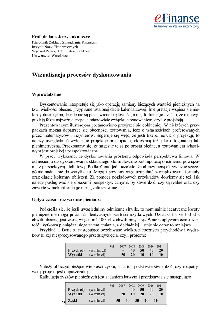 Prof. dr hab. Jerzy Jakubczyc Kierownik Zakładu Zarządzania Finansami Instytut Nauk Ekonomicznych Wydział Prawa, Administracji i Ekonomii Uniwersytet Wrocławski Wizualizacja procesów dyskontowania Wprowadzenie Dyskontowanie interpretuje się jako operację zamiany bieżących wartości pieniężnych na tzw. wielkości obecne, przypisane ustalonej dacie kalendarzowej. Interpretację wspiera się niekiedy ilustracjami, lecz te nie są pozbawione błędów. Najmniej fortunne jest zaś to, że nie uwypuklają faktu najważniejszego, a mianowicie związku z rzutowaniem, czyli z projekcją. Prezentowanym ilustracjom postanowiono przyjrzeć się dokładniej. W niektórych przypadkach można dopatrzeć się obecności rzutowania, lecz o własnościach preferowanych przez matematyków i inżynierów. Sugeruje się więc, że jeśli trzeba mówić o projekcji, to należy uwzględniać wyłącznie projekcję prostopadłą, określaną też jako ortogonalną lub planimetryczną. Przekonamy się, że sugestie te są po prostu błędne, a rzutowaniem właściwym jest projekcja perspektywiczna. W pracy wykazano, że dyskontowaniu prostemu odpowiada perspektywa liniowa. W odniesieniu do dyskontowania składanego sformułowano zaś hipotezę o istnieniu powiązania z perspektywą nieliniową. Podkreślono jednocześnie, że obrazy perspektywiczne szczególnie nadają się do weryfikacji. Mogą i powinny więc uzupełnić skomplikowane formuły oraz długie kolumny obliczeń. Za pomocą poglądowych przykładów dowiemy się też, jak należy posługiwać się obrazami perspektywicznymi, by stwierdzić, czy są realne oraz czy zawarte w nich informacje nie są zafałszowane. Upływ czasu oraz wartość pieniądza Podkreśla się, że jeśli uwzględnimy odmienne chwile, to nominalnie identyczne kwoty pieniężne nie mogą posiadać identycznych wartości użytkowych. Oznacza to, że 100 zł z chwili obecnej jest warte więcej niż 100 zł z chwili przyszłej. Wraz z upływem czasu wartość użytkowa pieniądza ulega zatem zmianie, a dokładniej – staje się coraz to mniejsza. Przykład 1. Dane są następujące oczekiwane wielkości rocznych przychodów i wydatków bliżej niesprecyzowanego przedsięwzięcia, czyli projektu: Rok Przychody Wydatki (w mln. zł) (w mln zł) 2007 2008 – 50 40 20 2009 2010 2011 50 10 40 10 20 10 Należy obliczyć bieżące wielkości zysku, a na ich podstawie stwierdzić, czy rozpatrywany projekt jest dopuszczalny. Kalkulacja zysków pieniężnych jest zadaniem łatwym i przedstawia się następująco: Rok Przychody Wydatki (w mln zł) (w mln zł) 2007 – 50 2008 2009 40 10 50 20 2010 2011 40 20 20 10 w Zyski w w . (w e mln - zł) f i n–50a n30 s 30e .20 c 10 o m Mamy zatem do czynienia z saldowaniem bieżących przychodów oraz wydatków. Jeśli są to wielkości gotówkowe, wówczas straty i zyski można nazwać odpowiednio odpływami oraz dopływami gotówki, a ogólniej – przepływami pieniężnymi, które często zastępuje się określeniem Cash Flow i oznacza się jako CF. Obliczone wielkości CFn, przy czym n = 0; 1; 2; 3; 4; 5; przedstawia się graficznie za pomocą diagramu, który proponuje się nazywać profilem projektu. W rozpatrywanym przypadku profilem jest wykres, który zamieszczono na rys. 1. Zauważmy, że przez dwa kolejne lata mamy do czynienia z identycznymi wielkościami nadwyżki pieniężnej, równej 30 mln (zł). Wielkości nominalne są wprawdzie takie same, lecz czy stanowią identyczną wartość użytkową? Każdy woli przecież dysponować kwotą 30 mln (zł) wcześniej niż później. Tak rozumiane preferencje sprawiają, że chociaż wielkości nominalne są równe, to ich wartości użytkowe są odmienne. Dodajmy, że ekonomiści akceptują tego rodzaju argumentację, a zróżnicowanie w wartościach przypisują tzw. preferencjom zależnym od upływu czasu. O ile zatem gorsza jest kwota 30 mln (zł) z roku następnego? Załóżmy, że inwestor skłonny jest przyjąć, iż każdy rok opóźnienia obniża wartość użytkową kwoty nominalnej o 10% względem roku poprzedniego. W tym miejscu należy jednak uważać. Nie wolno kwoty 30 mln (zł) pomnożyć przez 0,1, a wyniku odjąć od 30 mln (zł). Otrzymana w ten sposób wartość użytkowa, równa 27 mln (zł), jest niepoprawna. W obrachunku poprawnym kwotę 30 mln (zł) należy pomnożyć przez (1/1.1), otrzymując wynik 27.273 mln (zł). Rys. 1. Profil oczekiwanych przepływów pieniężnych. Cash Flow w mln zł 30 30 20 10 1 rok 1 rok 1 rok 1 rok upływ czasu – 50 Źródło: Opracowanie własne. Wielkość równą (1/1.1) nazywa się współczynnikiem dyskontowym, a operację mnożenia współczynnika przez kwotę nominalną określa się jako dyskontowanie po czasie. Rozpatrywane w różnych chwilach wielkości nominalne należy więc zamienić na wartości, które przypisuje się wspólnej chwili początkowej. Przyjmujemy, że chwilą początkową jest data kalendarzowa pojawienia się pierwszego wydatku pieniężnego, czyli kwoty 50 mln (zł). Wartości użytkowe przepływów pieniężnych obliczamy zaś następująco: Odstęp względem chwili początkowej 1 rok 2 lata 3 lata 4 lata Bieżąca wartość nominalna (w mln zł 30 30 20 10 Wielokrotność współczynnika dyskontowego (1/1.1)1 = 0.909091 Wartość użytkowa w chwili początkowej (w mln zł) 30×0.909091 = 27.273 2 30×0.826446 = 24.793 3 20×0.751315 = 15.026 4 10×0.683013 = 6.830 (1/1.1) = 0.826446 (1/1.1) = 0.751315 (1/1.1) = 0.683013 w w w . e - f i n a n s e . c o m Zauważmy, że posłużono się określeniem wielokrotności współczynnika dyskontowego. Oznacza to, że w wyrażeniu (1/1.1)n wykładnikiem jest zwykła liczba, której nie należy mylić z upływem czasu pomierzonym w latach. Nie wolno więc stwierdzać, że np. n = 4 lata. Niestety, tego rodzaju błąd jest popełniany wręcz nagminnie, a współczynnikowi dyskontowemu przypisuje się rolę pozbawioną sensu. Rys. 2. Profil zdyskontowany