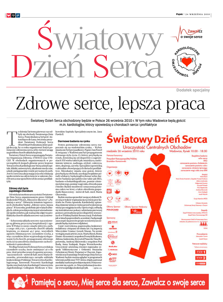 Piątek | 24 września 2010 ◊ rp .pl Światowy Dzień Serca Dodatek specjalny Zdrowe serce, lepsza praca Światowy Dzień Serca obchodzony będzie w Polsce 26 września 2010 r. W tym roku Wadowice będą gościć m.in. kardiologów, którzy opowiedzą o chorobach serca i profilaktyce T o dziesięć lat temu pierwszy raz odbyły się obchody Światowego Dnia Serca. Pomysłodawcą był prof. Antoni Bayes de Luna, ówczesny prezydent Światowej Federacji Serca (Word Heart Federation), który podjął decyzję, by co roku organizować festyn poświęconyzdrowemu sercu, żeby zwrócić uwagę na problem chorób układu krążenia. Światowy Dzień Serca wspomagają Światowa Organizacja Zdrowia, UNESCO oraz UNICEF. W obchodach organizowanych w poszczególnych krajach głównie przez krajowe Towarzystwa Kardiologiczne biorą udział szpitale, kliniki, uniwersytety, akademie medyczne, szkoły pielęgniarskie i wiele prywatnych osób. Jest to coroczna akcja mająca na celu edukację społeczeństw na całym świecie w zakresie chorób serca oraz sposobów ich leczenia i profilaktyki. Zdrowy styl życia zapobiega chorobom Od wielu lat mottem uroczystości Światowego Dnia Serca organizowanym przez Oddział Krakowski PTK jest „Miej serce dla serca” i „Pamiętaj o sercu”. Głównym tematem tegorocznych obchodów będzie „Zdrowe serce, lepsza praca”. W tym roku, podobnie jak w latach ubiegłych, celem przedsięwzięcia jest uświadomienie społeczeństwu, jak ważną rolę odgrywa profilaktyka chorób układu sercowo-naczyniowego. – Schorzenia układu sercowo-naczyniowego są główną przyczyną hospitalizacji i zgonów. W Polsce w 2005 r. zmarło 368,3 tys. osób, z czego 168,3 tys. z powodu chorób układu krążenia, co stanowi 45,7 proc. wszystkich zgonów. Eliminacja tzw. czynników ryzyka, a więc czynników, które wyprzedzają występowanie tych chorób, propagowanie zdrowego stylu życia umożliwia zmniejszenie zachorowalności i umieralności. Według Światowej Federacji Serca redukcja czynników ryzyka, może zmniejszyć aż o 80 proc. ilość przedwczesnych zgonów sercowo-naczyniowych – mówi dr hab. med. Maria Olszowska, przewodnicząca zarządu oddziału krakowskiego Polskiego Towarzystwa Kardiologicznego, kierownik Pracowni Kardiologii Społecznej Instytutu Kardiologii Uniwersytetu Jagiellońskiego Collegium Medicum w Kra- kowskim Szpitalu Specjalistycznym im. Jana Pawła II. Darmowe badania na rynku Festyn poświęcony zdrowemu sercu rozpocznie się na wadowickim rynku. – Wybór miasta nie był przypadkowy. Papież Jan Paweł II związany z Wadowicami był propagatorem zdrowego stylu życia. Ci, którzy przybędą na rynek, dowiedzą się od ekspertów o zagrożeniach XXI wieku takich jak: miażdżyca, nadciśnienie tętnicze, nadwaga, otyłość, cukrzyca, stres, depresja, używki. Specjaliści opowiedzą o aktualnie obowiązujących dietach i profilaktyce. Mieszkańcy miasta oraz goście, którzy przybędą na obchody, uzyskają bezpłatne porady u lekarzy, będą mogli wykonać sobie darmowe badania specjalistyczne takie jak EKG, badanie echokardiograficzne, pomiar ciśnienia tętniczego, pomiar wagi ciała, obwodu pasa i bioder. Będzie możliwość oznaczenia poziomu cukru we krwi, a także określenia gospodarki tłuszczowej – mówi dr hab. med. Maria Olszowska. Będzie można sprawdzić swoją wydolność fizyczną w trakcie wspinania się na wieżę przy kościele św. Piotra Apostoła. Kardiolodzy sprawdzą ciśnienie tętnicze i tętno przed wyjściem na wieżę i po osiągnięciu celu. Oprócz tego, odbędą się instruktażowe pokazy udzielania pierwszej pomocy, prowadzone przez ekspertów zrzeszonych w Polskiej Radzie Resuscytacji. Podobnie jak w latach poprzednich, uczestnicy będą mogli zaszczepić się przeciw grypie sezonowej (szczepionki będą częściowo odpłatne). Część rozrywkową poprowadzą krakowscy redaktorzy związani od ośmiu lat z tą imprezą Mieczysław Czuma i Leszek Mazan. Na scenie wystąpią znani artyści, m.in. Marta Bizoń, Roma Doniec-Krzemień z zespołem Promyki Krakowa, Aldona Jankowska, Krzysztof Piasecki, Nina Repetowska, Andrzej Sikorowski z zespołem Pod Budą, Anna Szałapak, Bogna Wernichowska. Uroczystość uświetnią również regionalne zespoły folklorystyczne i Orkiestra Strażacka Ochotniczej Straży Pożarnej w Choczni. Zapowiedzi oraz transmisję Światowego Dnia Serca z Wadowic będzie można oglądać w programach telewizji publicznej TVP, która objęła patronat medialny nad tym przedsięwzięciem. Festyn rozpocznie się o godz. 10. Więcej informacji na stronie www.szpitaljp2.krakow.pl/ptk. —oprac. e.u. Piątek | 24 września 2010 Światowy Dzień Serca rp .pl ◊ By biło jak najdłużej ROZMOWA | prof. Piotr Podolec, przewodniczący Komisji Zdrowia Polskiego Towarzystwa Kardiologicznego ◊: Trwa ósma edycja ogólnopolskiej akcji profilaktyczno-edukacyjnej Servier dla Serca pod hasłem „Mamo, tato dbajmy o serce!”. Czemu ma ona służyć? Piotr Podolec: Tegoroczna edycja akcji Servier dla Serca koncentruje się na uświadomieniu Polakom, jak ważne są nie tylko regularne badania umożliwiające wczesną diagnozę, ale również zdrowe zachowania eliminujące ryzyko wystąpienia chorób układu sercowo-naczyniowego. „Mamo, tato, dbajmy o serce! – tym hasłem organizatorzy chcą zachęcić do wspólnego rodzinnego zatroszczenia się o serce. Wystarczy zmienić szkodliwy styl życia, stosować odpowiednią dietę i uprawiać aktywność fizyczną. Przy okazji obchodów Światowego Dnia Serca po raz kolejny należy podkreślić, że niestety choroby układu sercowo-naczyniowego są w naszym kraju poważnym problemem. Stanowią najczęstszą przyczynę zgonów i inwalidztwa, a to oznacza, że Polacy nie dbają o swoje serca. Wciąż za mało się ruszamy, nieodpowiednio się odżywiamy, palimy papierosy. Dlatego coraz częściej obserwuje się konsekwencje takich zachowań. Co więce