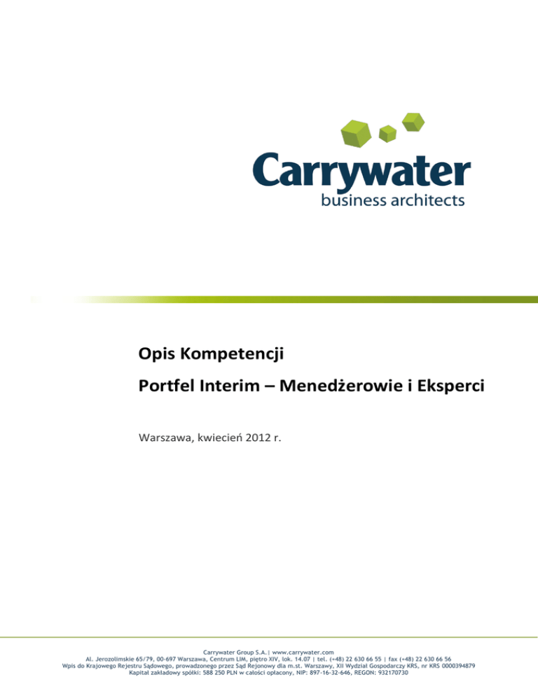 Opis Kompetencji Portfel Interim – Menedżerowie i Eksperci Warszawa, kwiecień 2012 r. Carrywater Group S.A.| www.carrywater.com Al. Jerozolimskie 65/79, 00-697 Warszawa, Centrum LIM, piętro XIV, lok. 14.07 | tel. (+48) 22 630 66 55 | fax (+48) 22 630 66 56 Wpis do Krajowego Rejestru Sądowego, prowadzonego przez Sąd Rejonowy dla m.st. Warszawy, XII Wydział Gospodarczy KRS, nr KRS 0000394879 Kapitał zakładowy spółki: 588 250 PLN w całości opłacony, NIP: 897-16-32-646, REGON: 932170730 Spis treści: 1 2 3 4 5 6 7 8 9 10 11 12 13 14 15 16 17 18 19 20 21 22 23 24 25 26 27 28 Kierownik projektu ..............................................................................................................................3 Zastępca kierownika projektu .............................................................................................................3 Kierownik projektu wysokiego ryzyka .................................................................................................3 Kierownik programu ............................................................................................................................4 Kierownik portfela projektów .............................................................................................................4 Menedżer zarządzania ryzykiem w projekcie......................................................................................4 Menedżer zarządzania jakością w projekcie .......................................................................................5 Specjalista ds. zarządzania projektami - koordynator zarządzania harmonogramem ........................5 Specjalista ds. zarządzania projektami - koordynator zarządzania zakresem .....................................5 Specjalista ds. zarządzania projektami - koordynator zarządzania budżetem ....................................5 Specjalista ds. zarządzania projektami - koordynator zarządzania ryzykiem......................................6 Specjalista ds. zarządzania projektami - koordynator zarządzania jakością .......................................6 Specjalista ds. zarządzania projektami - koordynator zarządzania komunikacją................................6 Specjalista ds. zarządzania projektami - koordynator zarządzania zasobami ludzkimi ......................7 Specjalista ds. zarządzania projektami - koordynator zarządzania zakupami i dostawcami ..............7 Kierownik wsparcia administracyjnego projektu/programu...............................................................7 Asystent wsparcia administracyjnego projektu ..................................................................................8 Menedżer testów IT (IT Test Manager) ...............................................................................................8 Audytor bezpieczeństwa systemów IT ................................................................................................9 Analityk bezpieczeństwa systemów IT ................................................................................................9 Analityk Biznesowy ..............................................................................................................................9 Analityk Procesów .............................................................................................................................10 Architekt Systemów IT.......................................................................................................................10 Konsultant ds. wdrożenia systemu ERP ............................................................................................10 Konsultant ds. wdrożenia systemu CRM ...........................................................................................11 Konsultant ds. wdrożenia systemu paszportyzacji ............................................................................11 Konsultant ds. wdrożenia systemu billingowego ..............................................................................12 Konsultant ds. wdrożenia systemu Business Intelligence .................................................................12 © 2012 by Carrywater Group S.A.)| www.carrywater.com 2 1 Kierownik projektu Zarządzanie projektem zgodnie z zakresem obowiązków i odpowiedzialności zdefiniowanym przez Klienta oraz z metodyką zarządzania projektami stosowaną w jego organizacji. Wykorzystanie: Kompetencja potrzebna organizacji, która nie zatrudnia kierowników projektów, ocenia, że jej zasoby są zbyt mało doświadczone lub zamierza ograniczyć ryzyko niepowodzenia projektu powierzając tę rolę doświadczonej osobie spoza własnej organizacji. Zagadnienia: ZARZĄDZANIE ZMIANĄ / PROJEKTAMI WDROŻENIA SYSTEMÓW IT I ZMIANY BIZNESOWEJ 2 Zastępca kierownika projektu Zarządzanie projektem w roli osoby wspierającej Kierownika Projektu (tzw. Shadow Project Manager) zgodnie z zakresem obowiązków i odpowiedzialności zdefiniowanym przez Klienta oraz z metodyką zarządzania projektami stosowaną w jego organizacji. Wykorzystanie: Kompetencja potrzebna organizacji, która planuje powierzyć rolę Kierownika Projektu osobie z własnej organizacji, która dopiero zdobywa doświadczenie. Przydzielenie roli Zastępcy Kierownika Projektu doświadczonej osobie spoza organizacji pozwala skrócić proces uczenia się oraz zminimalizować ryzyko w prowadzonym aktualnie projekcie. Zagadnienia: ZARZĄDZANIE ZMIANĄ / PROJEKTAMI WDROŻENIA SYSTEMÓW IT I ZMIANY BIZNESOWEJ 3 Kierownik projektu wysokiego ryzyka Zarządzanie projektem wysokiego ryzyka zgodnie z zakresem obowiązków i odpowiedzialności zdefiniowanym przez Klienta oraz z metodyką zarządzania projektami stosowaną w jego organizacji. Wykorzystanie: Kompetencja potrzebna organizacji, która chce ograniczyć ryzyko niepowodzenia projektu powierzając rolę kierownika projektu osobie spoza organizacji, która posiada duże doświadczenie i s