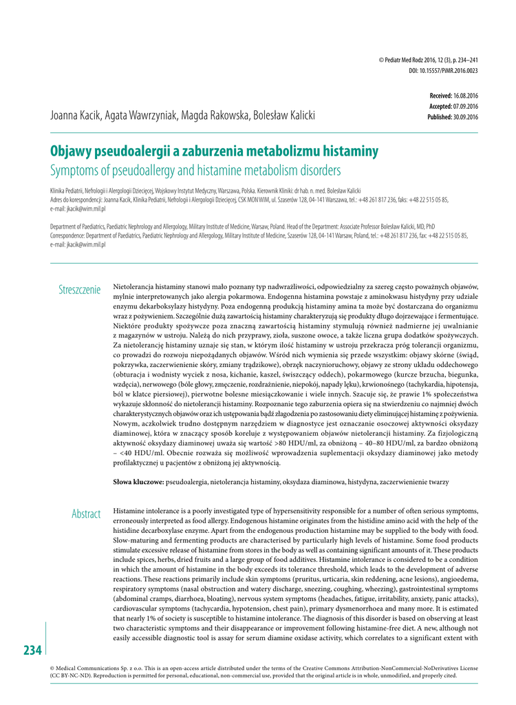 © Pediatr Med Rodz 2016, 12 (3), p. 234–241 DOI: 10.15557/PiMR.2016.0023 Joanna Kacik, Agata Wawrzyniak, Magda Rakowska, Bolesław Kalicki Received: 16.08.2016 Accepted: 07.09.2016 Published: 30.09.2016 Objawy pseudoalergii a zaburzenia metabolizmu histaminy Symptoms of pseudoallergy and histamine metabolism disorders Klinika Pediatrii, Nefrologii i Alergologii Dziecięcej, Wojskowy Instytut Medyczny, Warszawa, Polska. Kierownik Kliniki: dr hab. n. med. Bolesław Kalicki Adres do korespondencji: Joanna Kacik, Klinika Pediatrii, Nefrologii i Alergologii Dziecięcej, CSK MON WIM, ul. Szaserów 128, 04-141 Warszawa, tel.: +48 261 817 236, faks: +48 22 515 05 85, e-mail: [email protected] Department of Paediatrics, Paediatric Nephrology and Allergology, Military Institute of Medicine, Warsaw, Poland. Head of the Department: Associate Professor Bolesław Kalicki, MD, PhD Correspondence: Department of Paediatrics, Paediatric Nephrology and Allergology, Military Institute of Medicine, Szaserów 128, 04-141 Warsaw, Poland, tel.: +48 261 817 236, fax: +48 22 515 05 85, e-mail: [email protected] Streszczenie Nietolerancja histaminy stanowi mało poznany typ nadwrażliwości, odpowiedzialny za szereg często poważnych objawów, mylnie interpretowanych jako alergia pokarmowa. Endogenna histamina powstaje z aminokwasu histydyny przy udziale enzymu dekarboksylazy histydyny. Poza endogenną produkcją histaminy amina ta może być dostarczana do organizmu wraz z pożywieniem. Szczególnie dużą zawartością histaminy charakteryzują się produkty długo dojrzewające i fermentujące. Niektóre produkty spożywcze poza znaczną zawartością histaminy stymulują również nadmierne jej uwalnianie z magazynów w ustroju. Należą do nich przyprawy, zioła, suszone owoce, a także liczna grupa dodatków spożywczych. Za nietolerancję histaminy uznaje się stan, w którym ilość histaminy w ustroju przekracza próg tolerancji organizmu, co prowadzi do rozwoju niepożądanych objawów. Wśród nich wymienia się przede wszystkim: objawy skórne (świąd, pokrzywka, zaczerwienienie skóry, zmiany trądzikowe), obrzęk naczynioruchowy, objawy ze strony układu oddechowego (obturacja i wodnisty wyciek z nosa, kichanie, kaszel, świszczący oddech), pokarmowego (kurcze brzucha, biegunka, wzdęcia), nerwowego (bóle głowy, zmęczenie, rozdrażnienie, niepokój, napady lęku), krwionośnego (tachykardia, hipotensja, ból w klatce piersiowej), pierwotne bolesne miesiączkowanie i wiele innych. Szacuje się, że prawie 1% społeczeństwa wykazuje skłonność do nietolerancji histaminy. Rozpoznanie tego zaburzenia opiera się na stwierdzeniu co najmniej dwóch charakterystycznych objawów oraz ich ustępowania bądź złagodzenia po zastosowaniu diety eliminującej histaminę z pożywienia. Nowym, aczkolwiek trudno dostępnym narzędziem w diagnostyce jest oznaczanie osoczowej aktywności oksydazy diaminowej, która w znaczący sposób koreluje z występowaniem objawów nietolerancji histaminy. Za fizjologiczną aktywność oksydazy diaminowej uważa się wartość >80 HDU/ml, za obniżoną – 40–80 HDU/ml, za bardzo obniżoną – <40 HDU/ml. Obecnie rozważa się możliwość wprowadzenia suplementacji oksydazy diaminowej jako metody profilaktycznej u pacjentów z obniżoną jej aktywnością. Słowa kluczowe: pseudoalergia, nietolerancja histaminy, oksydaza diaminowa, histydyna, zaczerwienienie twarzy Abstract 234 Histamine intolerance is a poorly investigated type of hypersensitivity responsible for a number of often serious symptoms, erroneously interpreted as food allergy. Endogenous histamine originates from the histidine amino acid with the help of the histidine decarboxylase enzyme. Apart from the endogenous production histamine may be supplied to the body with food. Slow-maturing and fermenting products are characterised by particularly high levels of histamine. Some food products stimulate excessive release of histamine from stores in the body as well as containing significant amounts of it. These products include spices, herbs, dried fruits and a large group of food additives. Histamine intolerance is considered to be a condition in which the amount of histamine in the body exceeds its tolerance threshold, which leads to the development of adverse reactions. These reactions primarily include skin symptoms (pruritus, urticaria, skin reddening, acne lesions), angioedema, respiratory symptoms (nasal obstruction and watery discharge, sneezing, coughing, wheezing), gastrointestinal symptoms (abdominal cramps, diarrhoea, bloating), nervous system symptoms (headaches, fatigue, irritability, anxiety, panic attacks), cardiovascular symptoms (tachycardia, hypotension, chest pain), primary dysmenorrhoea and many more. It is estimated that nearly 1% of society is susceptible to histamine intolerance. The diagnosis of this disorder is based on observing at least two characteristic symptoms and their disappearance or improvement following histamine-free diet. A new, although not easily accessible diagnostic tool is assay for serum diamine oxidase activity, which correlates to a significant extent with © Medical Communications Sp. z o.o. This is an open-access article distributed under the terms of the Creative Commons Attribution-NonCommercial-NoDerivatives License (CC BY-NC-ND). Reproduction is permitted for personal, educational, non-commercial use, provided that the original article is in whole, unmodified, and properly cited. Objawy pseudoalergii a zaburzenia metabolizmu histaminy / Symptoms of pseudoallergy and histamine metabolism disorders symptoms of histamine intolerance. Normal activity of diamine oxidase is considered to be the amount of >80 HDU/mL, decreased activity – 40–80 HDU/mL and severely decreased activity – <40 HDU/mL. Currently the option of diamine oxidase supplementation is being considered as prevention for patients with the decreased activity of this substance. Key words: p