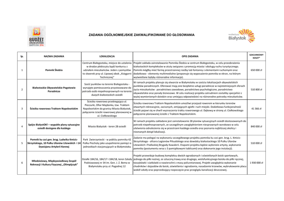 ZADANIA OGÓLNOMIEJSKIE ZAKWALIFIKOWANE DO GŁOSOWANIA lp. NAZWA ZADANIA LOKALIZACJA 1 Pomnik Śledzia Centrum Białegostoku, miejsce do ustalenia w drodze plebiscytu bądź konkursu z udziałem mieszkańców. Jeden z pomysłów to skwerek przy ul. Lipowej obok ,,Księgarni Technicznej” 2 Białostockie Obywatelskie Pogotowie Poradnicze Sześć punktów na terenie Białegostoku wynajęte pomieszczenia przystosowane do potrzeb osób niepełnosprawnych na terenie dużych białostockich osiedli 3 Ścieżka rowerowa Traktem Napoleońskim Ścieżka rowerowa przebiegająca ul. Pieczurki, Ofiar Majdanka, tzw. Traktem Napoleońskim do granicy Miasta Białystok, połączenie ścieżki rowerowej planowanej w ul. Ciołkowskiego 4 Spójrz BiałystOK! – wypukłe plany sytuacyjne osiedli dostępne dla każdego Miasto Białystok - teren 28 osiedli 5 6 u z OPIS ZADANIA u n Projekt zakłada zainstalowanie Pomnika Śledzia w centrum Białegostoku, w celu przeobrażenia i białostockich kompleksów w atuty związane z promocją miasta i obsługą ruchu turystycznego. e Pomnik mógłby mieć formę przestrzennej rzeźby lub fontanny z elementami ruchomymi oraz d dodatkowo - elementy multimedialne (proponuje się wyposażenie pomnika w ekran, na którym o wyświetlane byłyby różnorodne informacje). t n W ramach projektu planuje się otwarcie w Białymstoku w sześciu lokalizacjach obywatelskich i punktów poradniczych. Oferować mają one bezpłatne usługi poradnicze w najistotniejszych sferach e życia mieszkańców: poradnictwo zawodowe, poradnictwo psychologiczne, poradnictwo d obywatelskie oraz porady biznesowe. W celu realizacji projektu zatrudnieni zostaliby specjaliści z o wyżej wymienionych dziedzin oraz umiejący odpowiedzieć na różnorodne potrzeby mieszkańców. t n iŚcieżka rowerowa Traktem Napoleońskim umożliwi przejazd rowerem w kierunku terenów eotwartych rekreacyjnie, zacisznych, omijających zgiełk i ruch miejski. Dodatkowa funkcjonalność dścieżki pojawi się w chwili wyznaczenia traktu rowerowego ul. Dębową w stronę ul. Ciołkowskiego opołączenie planowanej ścieżki z Traktem Napoleońskim. t n W ramach projektu zakładane jest zainstalowanie 28 planów sytuacyjnych osiedli dostosowanych do i potrzeb niepełnosprawnych, ze szczególnym uwzględnieniem niesprawnych wzrokowo w celu e ułatwienia odnalezienia się w przestrzeni każdego osiedla oraz poznania najbliższej okolicy i d nieznanych dotąd lokalizacji. o Zadanie ma polegać na wykonaniu szczegółowego projektu pomnika ku czci gen. bryg. L. KmicicPomnik ku czci gen. bryg. Ludwika KmicicPark Zwierzyniecki - w pobliżu pomnika 42 Skrzyńskiego - oficera Legionów Piłsudskiego oraz dowódcy białostockiego 10 Pułku Ułanów Skrzyńskiego, 10 Pułku Ułanów Litewskich i 14 Pułku Piechoty jako uzupełnienie pamięci o Litewskich i Podlaskiej Brygady Kawalerii. Etapami projektu będzie wyłonieie artysty, wykonanie Dywizjonu Artylerii Konnej jednostkach stacjonujących w Białymstoku pomnika (postumentu wraz z 3 pamiątkowymi tablicami) oraz dokonanie jego instalacji). n iProjekt przewiduje budowę kompleksu dwóch ogrodzonych i oświetlonych boisk sportowych, Działki 184/16, 184/17 i 184/18, teren Szkoły ejednego do piłki nożnej, ze sztuczną trawą oraz drugiego, wielofunkcyjnego boiska do piłki ręcznej, Młodzieżowy, Międzyosiedlowy Zespół Podstawowej nr 34 im. Gen. J. Z. Bema w dkoszykówki i siatkówki o nawierzchni z masy poliuretanowej. Projekt uwzględnia wykonanie Rekreacji i Kultury Fizycznej ,,Olimpijczyk” Białymstoku przy ul. Pogodnej 12 ochodników i dojazdów do boisk, oświetlenia i ogrodzenia, nasadzenie krzewów, wybrukowanie placu twokół szkoły oraz poprzedzający rozpoczęcie prac przeglądu kanalizacji deszczowej. y SZACUNKOWY KOSZT* 650 000 zł 510 800 zł 41 366 zł 840 000 zł 510 000 zł 1 930 000 zł 7 8 Białostocki Ośrodek Wschodnich Sztuk Walki Rowerzysto! Bezpieczniej z kamizelką 9 Centrum Animacji Kultury ,,Wierzbowa” 10 Wykonanie i ustawienie ,,Krzyża Katyńskiego” w bliskości istniejącego Pomnika Katyńskiego na skraju Parku Zwierzynieckiego 11 Remont ulic na osiedlu Starosielce 12 Budowa nawierzchni ulic: Bagiennej i Ustronnej 13 Budowa Centrum Aktywności Wielopokoleniowej funkcjonującego przy Szkole Podstawowej nr 47 w Białymstoku 14 15 Magazyn nr 10 lub magazyn nr 12 (piętro i piwnica), ul. Węglowa Miasto Białystok Projekt zakłada zmianę sposobu użytkowania części jednego z magazynów wojskowych przez stworzenie 4-5 sal treningowych oraz zaplecza sanitarno-technicznego - szatnia, prysznice, sanitariaty, pomieszczenia administracji, magazyny. n Projekt zadania polega na zakupie i bezpłatnej dystrybucji 10 000 kamizelek odblaskowych z logo i Białegostoku. Kamizelki przeznaczone będą dla przedkszkolaków, uczniów szkół podstawowych, e gimnazjalnych, ponadgimnazjalnych i innych, a także rowerzystów, uczestników ruchu drogowego. d W ramach projektu zrealizowana ma zostać dobudowa sali widowiskowo-teatralnej do VII LO, która ma być miejscem koncertów młodzieżowych, warsztatów i spektakli teatralnych, konkursów i VII Liceum Ogólnokształcące w Białymstoku festiwali. Dodatkowo powstać ma uliczna galeria zdjęć i prac plastycznych, która ma uatrakcyjnić przy ulicy Wierzbowej 7 przestrzeń miejską wzdłuż odcinka ulicy Wierzbowej. Ponadto wyremontowana ma zostać istniejąca sala lustrzana, która wymaga wymiany podłogi, montażu wentylacji oraz wyposażenia w pianino. W sąsiedztwie istniejącego Pomnika Katyńskiego - na terenie zielonym między posadzonymi 3 dębami pamięci Projekt polega na wykonaniu i ustawieniu krzyża, wkomponowanie go w otoczenie, by powstał kompleks pamięci Katynia. Krzyż miałby zostać wykonany z granitu z wkomponowanym krzyżem wykonanym z mosiądzu. n Projekt polega na wykonaniu około 400 metrów bieżących jezdni z polbruku wraz z chodnikami po ul. Nowosielska na odcinku od ul. Zbigni