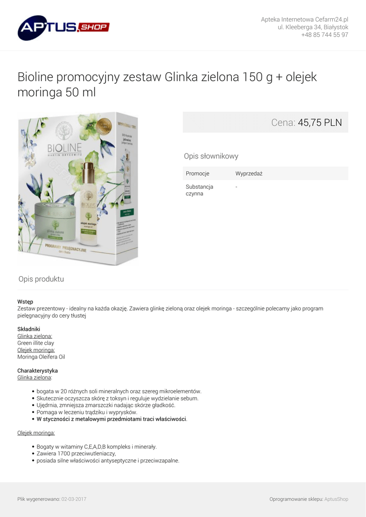 Apteka Internetowa Cefarm24.pl ul. Kleeberga 34, Białystok +48 85 744 55 97 Bioline promocyjny zestaw Glinka zielona 150 g + olejek moringa 50 ml Cena: 45,75 PLN Opis słownikowy Promocje Wyprzedaż Substancja czynna - Opis produktu Wstęp Zestaw prezentowy - idealny na każda okazję. Zawiera glinkę zieloną oraz olejek moringa - szczególnie polecamy jako program pielęgnacyjny do cery tłustej Składniki Glinka zielona: Green illite clay Olejek moringa: Moringa Oleifera Oil Charakterystyka Glinka zielona: bogata w 20 różnych soli mineralnych oraz szereg mikroelementów. Skutecznie oczyszcza skórę z toksyn i reguluje wydzielanie sebum. Ujędrnia, zmniejsza zmarszczki nadając skórze gładkość. Pomaga w leczeniu trądziku i wyprysków. W styczności z metalowymi przedmiotami traci właściwości. Olejek moringa: Bogaty w witaminy C,E,A,D,B kompleks i minerały. Zawiera 1700 przeciwutleniaczy, posiada silne właściwości antyseptyczne i przeciwzapalne. Plik wygenerowano: 02-03-2017 Oprogramowanie sklepu: AptusShop Apteka Internetowa Cefarm24.pl ul. Kleeberga 34, Białystok +48 85 744 55 97 Zawiera 4 razy więcej kolagenu niż olej z marchwi. Odmładza, odżywia, nawilża, zwalcza wolne rodniki. Idealny jako odżywka do włosów i skóry głowy. Zapobiega wypadaniu włosów wzmacniając ich cebulki. Stymuluje wzrost i regenerację komórek dzięki zawartości cytokininy (hormony roślinne). Odbudowuje kolagen oraz opóźnia procesy starzenia się skóry. Cera normalna, sucha, dojrzała, tłusta, zmarszczki, drobne linie, rozszerzone pory, trądzik Stosowanie Glinka zielona: jako maseczka do twarzy i ciała. Glinkę łączymy z wodą lub hydrolatem, gotową maseczkę nakładamy na twarz lub ciało na około 10 - 15 minut. Po tym czasie dokładnie spłukujemy, tonizujemy i nawilżamy. Olejek moringa: Twarz: nanieść niewielką ilość olejku na oczyszczoną skórę twarzy. Ciało: nakładać na wilgotną skórę. Włosy: można stosować zarówno przed jak i po myciu. Przed umyciem jako odżywka regenerująca - nakładamy olejek na nieumyte włosy i robimy kompres z ręcznika, po minimum 30 minutach należy umyć włosy. Po umyciu: stosujemy jako serum przed stylizacją - nanieść niewielką ilość na wilgotne włosy Plik wygenerowano: 02-03-2017 Powered by TCPDF (www.tcpdf.org) Oprogramowanie sklepu: AptusShop