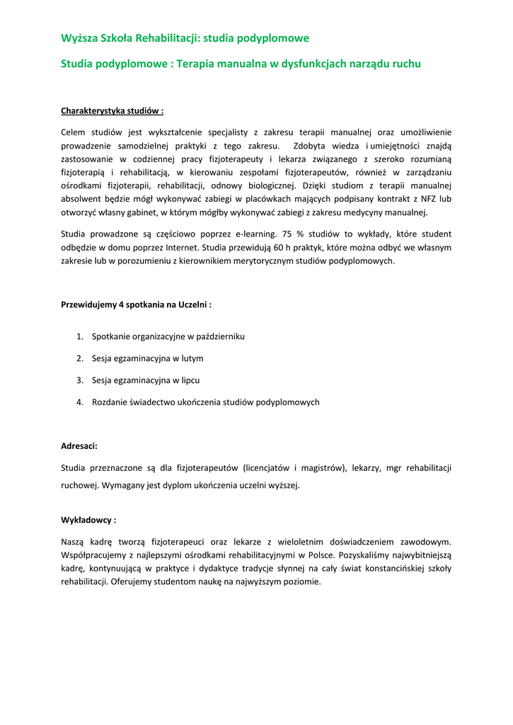 Wyższa Szkoła Rehabilitacji: studia podyplomowe Studia podyplomowe : Terapia manualna w dysfunkcjach narządu ruchu Charakterystyka studiów : Celem studiów jest wykształcenie specjalisty z zakresu terapii manualnej oraz umożliwienie prowadzenie samodzielnej praktyki z tego zakresu. Zdobyta wiedza i umiejętności znajdą zastosowanie w codziennej pracy fizjoterapeuty i lekarza związanego z szeroko rozumianą fizjoterapią i rehabilitacją, w kierowaniu zespołami fizjoterapeutów, również w zarządzaniu ośrodkami fizjoterapii, rehabilitacji, odnowy biologicznej. Dzięki studiom z terapii manualnej absolwent będzie mógł wykonywać zabiegi w placówkach mających podpisany kontrakt z NFZ lub otworzyć własny gabinet, w którym mógłby wykonywać zabiegi z zakresu medycyny manualnej. Studia prowadzone są częściowo poprzez e-learning. 75 % studiów to wykłady, które student odbędzie w domu poprzez Internet. Studia przewidują 60 h praktyk, które można odbyć we własnym zakresie lub w porozumieniu z kierownikiem merytorycznym studiów podyplomowych. Przewidujemy 4 spotkania na Uczelni : 1. Spotkanie organizacyjne w październiku 2. Sesja egzaminacyjna w lutym 3. Sesja egzaminacyjna w lipcu 4. Rozdanie świadectwo ukończenia studiów podyplomowych Adresaci: Studia przeznaczone są dla fizjoterapeutów (licencjatów i magistrów), lekarzy, mgr rehabilitacji ruchowej. Wymagany jest dyplom ukończenia uczelni wyższej. Wykładowcy : Naszą kadrę tworzą fizjoterapeuci oraz lekarze z wieloletnim doświadczeniem zawodowym. Współpracujemy z najlepszymi ośrodkami rehabilitacyjnymi w Polsce. Pozyskaliśmy najwybitniejszą kadrę, kontynuującą w praktyce i dydaktyce tradycje słynnej na cały świat konstancińskiej szkoły rehabilitacji. Oferujemy studentom naukę na najwyższym poziomie. Na naszej uczelni wykładają najbardziej znani lekarze i specjaliści w dziedzinie rehabilitacji i fizjoterapii, m.in.: o o o o o o o o o o o o o o o o o o o o o prof. zw. dr hab. n.med. Jerzy Kiwerski prof. dr hab. n.med. Krystyna Księżopolska-Orłowska prof. zw. dr hab. n.med. Jan Haftek prof. zw. dr hab. n.med. Ryszard Piotrowicz prof. dr hab. n.med. Anna Doboszyńska dr hab. n.med. Wojciech Mikuła dr hab. Janusz Bronarski dr n.med. Paweł Baranowski dr n.med. Adam Ogonowski dr Marek Łyp dr Romuald Kaczorowski dr Iwona Stanisławska dr Hanna Lewandowska dr Sławomir Grzeszczyk dr Ryszard Kaczor dr Justyna Karbownik-Kopacz dr Katarzyna Kiwerska-Jagodzińska dr Janusz Kołakowski dr Piotr Tederko dr Krzysztof Wasiak dr Lidia Zając Kierownik studiów: Kierownik merytoryczny: dr Marek Łyp Pełnomocnik Dziekana ds. studiów podyplomowych, kursów i szkoleń: mgr Gabriela Nowińska [email protected] 604217400 Zasady naboru: Studenci przyjmowani są według kolejności zgłoszeń Warunki przyjęcia: 1. Warunkiem koniecznym do zapisania się na Uczelnię jest rejestracja online 2. Złożenie wymaganych dokumentów w ciągu 14 dni od momentu zalogowania się Wymagane dokumenty: 1. 2. 3. 4. 5. 6. 7. 8. Karta ewidencyjna drukowana po zakończeniu rekrutacji online Podanie Dyplom ukończenia studiów lub odpis Kserokopia dowodu wniesienia wpisowego oraz opłaty rekrutacyjnej Cztery fotografie o wymiarze 37x52 bez nakrycia głowy, na jasnym tle Kserokopia dowodu osobistego Deklaracja płatności Dwa egzemplarze umowy o warunkach płatności liczba miejsc: 30 W przypadku zebrania się grupy poniżej 15 osób studia mogą zostać odwołane ( opłata rekrutacyjna i wpisowe podlegają zwrotowi ) lub koszty studiów mogą ulec podwyższeniu po wcześniejszej konsultacji telefonicznej z każdym kandydatem. Opłaty : Wpisowe: 100 zł Opłata rekrutacyjna: 50zł Opłata za cały rok studiów: 5000zł Opłata za semestr: 2800zł 10 rat : 620 zł płatne od 15 października do 15 lipca Program ramowy : Czas trwania studiów :2 semestry Ilość godzin : 256 h w tym 90h praktyk i ćwiczeń SEMESTR I ILOŚĆ GODZIN FORMA ZALICZENIA Anatomia funkcjonalna i palpacyjna jako podstawa wykorzystywania technik manualnych - wykłady elearning 20 EGZ Diagnostyka kliniczna niezbędna dla prawidłowego planowania i zastosowania terapii manualnejwykłady e- learning 20 EGZ Diagnostyka obrazowa niezbędna dla prawidłowego planowania i zastosowania terapii manualnej wykłady e-learning 20 ZAL Techniki stosowane w terapii manualnej- wykłady e-learning 10 ZAL 30 + 10 EGZ 6 ZAL PRZEDMIOT Terapia manualna w schorzeniach i dysfunkcjach kręgosłupa - wykłady elearning Terapia manualna w medycynie sportowej – wykłady e-learning Razem w 1 semestrze : 116 h II Terapia manualna w schorzeniach i dysfunkcji stawów obwodowych kończyn górnych - wykłady e-learning 15 + 10 EGZ Terapia manualna w schorzeniach i dysfunkcji stawów obwodowych kończyn dolnych - wykłady e-learning 15 + 10 EGZ Zastosowanie terapii manualnej w wybranych przypadkach klinicznych – praktyki kliniczne 60 ZAL Techniki mięśniowo-powięziowe wykłady e-learning 15 ZAL Terapia punktów spustowych wykłady e-learning 15 ZAL RAZEM W 2 SEMESTRZE : 140h Podczas całego toku studiów mogą się Państwo z nami kontaktować : W sprawach formalnych związanych z tokiem studiów : mgr inż. Cezary Dytman W sprawach merytorycznych związanych z programem nauczania oraz organizacją zajęć: mgr Gabriela Nowińska, [email protected], 604 217 400 W sprawach finansowych: mgr Gabriela Nowińska, [email protected] , 604 217 400
