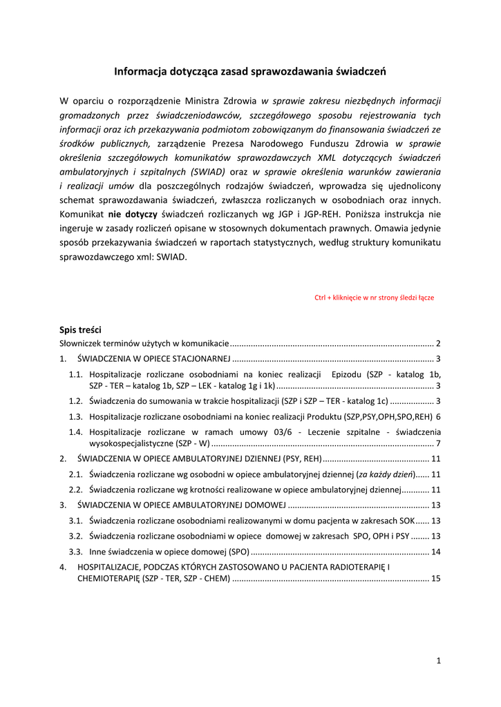 Informacja dotycząca zasad sprawozdawania świadczeń W oparciu o rozporządzenie Ministra Zdrowia w sprawie zakresu niezbędnych informacji gromadzonych przez świadczeniodawców, szczegółowego sposobu rejestrowania tych informacji oraz ich przekazywania podmiotom zobowiązanym do finansowania świadczeń ze środków publicznych, zarządzenie Prezesa Narodowego Funduszu Zdrowia w sprawie określenia szczegółowych komunikatów sprawozdawczych XML dotyczących świadczeń ambulatoryjnych i szpitalnych (SWIAD) oraz w sprawie określenia warunków zawierania i realizacji umów dla poszczególnych rodzajów świadczeń, wprowadza się ujednolicony schemat sprawozdawania świadczeń, zwłaszcza rozliczanych w osobodniach oraz innych. Komunikat nie dotyczy świadczeń rozliczanych wg JGP i JGP-REH. Poniższa instrukcja nie ingeruje w zasady rozliczeń opisane w stosownych dokumentach prawnych. Omawia jedynie sposób przekazywania świadczeń w raportach statystycznych, według struktury komunikatu sprawozdawczego xml: SWIAD. Ctrl + kliknięcie w nr strony śledzi łącze Spis treści Słowniczek terminów użytych w komunikacie ........................................................................................ 2 1. ŚWIADCZENIA W OPIECE STACJONARNEJ ....................................................................................... 3 1.1. Hospitalizacje rozliczane osobodniami na koniec realizacji Epizodu (SZP - katalog 1b, SZP - TER – katalog 1b, SZP – LEK - katalog 1g i 1k) .................................................................... 3 1.2. Świadczenia do sumowania w trakcie hospitalizacji (SZP i SZP – TER - katalog 1c) ................... 3 1.3. Hospitalizacje rozliczane osobodniami na koniec realizacji Produktu (SZP,PSY,OPH,SPO,REH) 6 1.4. Hospitalizacje rozliczane w ramach umowy 03/6 - Leczenie szpitalne - świadczenia wysokospecjalistyczne (SZP - W) ................................................................................................ 7 2. ŚWIADCZENIA W OPIECE AMBULATORYJNEJ DZIENNEJ (PSY, REH) .............................................. 11 2.1. Świadczenia rozliczane wg osobodni w opiece ambulatoryjnej dziennej (za każdy dzień)...... 11 2.2. Świadczenia rozliczane wg krotności realizowane w opiece ambulatoryjnej dziennej............ 11 3. ŚWIADCZENIA W OPIECE AMBULATORYJNEJ DOMOWEJ ............................................................. 13 3.1. Świadczenia rozliczane osobodniami realizowanymi w domu pacjenta w zakresach SOK ...... 13 3.2. Świadczenia rozliczane osobodniami w opiece domowej w zakresach SPO, OPH i PSY ........ 13 3.3. Inne świadczenia w opiece domowej (SPO) ............................................................................. 14 4. HOSPITALIZACJE, PODCZAS KTÓRYCH ZASTOSOWANO U PACJENTA RADIOTERAPIĘ I CHEMIOTERAPIĘ (SZP - TER, SZP - CHEM) ..................................................................................... 15 1 Słowniczek terminów użytych w komunikacie: Komunikat xml – SWIAD - szczegółowy komunikat sprawozdawczy tworzony przy użyciu języka XML, stosowany do wymiany informacji między świadczeniodawcami a Narodowym Funduszem Zdrowia, dotyczący świadczeń ambulatoryjnych i szpitalnych; Tryb realizacji świadczenia / wg SWIAD: typ zestawu świadczeń - pomocniczy atrybut techniczny pozwalający na lepszą weryfikację poprawności struktury przekazanego komunikatu w zależności od rodzaju świadczeń przekazywanych w sprawozdaniu (S – dla świadczeń opieki stacjonarnej A – dla świadczeń ambulatoryjnych (w tym m.in. dziennych i domowych); Epizod / wg SWIAD: zestaw świadczeń - obejmuje dane umożliwiając grupowanie kontaktów (świadczeń), niezbędny dla tych przypadków, gdy ze względu na przyjęte zasady sprawozdawczości muszą być one przekazywane równocześnie np. na podstawie jednego skierowania jak hospitalizacja, turnus, cykl, proces diagnostyczny, proces terapeutyczny itp. dla świadczeń S wymaga dodatkowo przekazania danych o hospitalizacji; Kontakt / wg SWIAD: świadczenie - obejmuje dane umożliwiając grupowanie świadczeń jednostkowych, udzielonych w ramach działania określonej komórki organizacyjnej (np. pobyt na oddziale) lub okresu czasu udzielania świadczenia (np. okres sprawozdawczy, tydzień kalendarzowy itp.); Produkt / wg SWIAD: pozycja rozliczeniowa – zrealizowane świadczenie jednostkowe wykazane do rozliczenia; Typy umów: SZP - 03/1 - Leczenie szpitalne - oddziały szpitalne SZP - CHEM – 03/3 - Leczenie szpitalne - chemioterapia SZP – LEK – 03/2 i 03/5 - Leczenie szpitalne - programy zdrowotne (lekowe) SZP – TER – 03/4 - Leczenie szpitalne - teleradioterapia, brachyterapia, terapia izotopowa SZP - W - 03/6 - Leczenie szpitalne - świadczenia wysokospecjalistyczne PSY - 04/1 - Opieka psychiatryczna i leczenie uzależnień REH - 05/1 - Rehabilitacja lecznicza SOK - 11 - Świadczenia zdrowotne kontraktowane odrębnie SPO - 14/1 - Świadczenia pielęgnacyjne i opiekuńcze OPH - 15/1 - Opieka paliatywna i hospicyjna 2 1. ŚWIADCZENIA W OPIECE STACJONARNEJ 1.1. Hospitalizacje rozliczane osobodniami na koniec realizacji Epizodu (SZP - katalog 1b, SZP-TER - katalog 1b, SZP-LEK - katalog 1g i 1k) Dotyczy przede wszystkim hospitalizacji w lecznictwie szpitalnym z umów: SZP (katalog 1b – np. świadczenia jednostkowe: 5.52.01.0001360, 5.52.01.0001424, 5.52.01.0001440, 5.52.01.0001470, 5.52.01.0001499), SZP-RAD (katalog 1b – np. świadczenia jednostkowe: 5.52.01.0001424, 5.52.01.0001440, 5.52.01.0001470, 5.52.01.0001499) SZP-LEK (katalog 1g – np. świadczenia jednostkowe: 5.08.06.0000001, 5.08.06.0000002, katalog 1k – np. świadczenia jednostkowe: 5.08.07.0000001, 5.08.07.0000002). Świadczenia jednostkowe są wykazywane w raporcie statystycznym i rozliczane według zasad obowiązujących na dzień końca realizacji Epizodu (po zakończeniu hospitalizacji). Dzień rozpoczęcia i dzień zakończenia sprawozdawanej pozycji rozlic