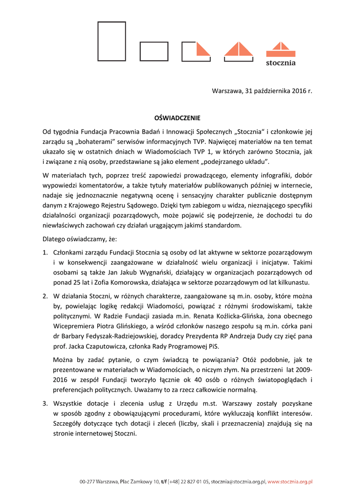 Warszawa, 31 października 2016 r. OŚWIADCZENIE Od tygodnia Fundacja Pracownia Badań i Innowacji Społecznych „Stocznia“ i członkowie jej zarządu są „bohaterami” serwisów informacyjnych TVP. Najwięcej materiałów na ten temat ukazało się w ostatnich dniach w Wiadomościach TVP 1, w których zarówno Stocznia, jak i związane z nią osoby, przedstawiane są jako element „podejrzanego układu”. W materiałach tych, poprzez treść zapowiedzi prowadzącego, elementy infografiki, dobór wypowiedzi komentatorów, a także tytuły materiałów publikowanych później w internecie, nadaje się jednoznacznie negatywną ocenę i sensacyjny charakter publicznie dostępnym danym z Krajowego Rejestru Sądowego. Dzięki tym zabiegom u widza, nieznającego specyfiki działalności organizacji pozarządowych, może pojawić się podejrzenie, że dochodzi tu do niewłaściwych zachowań czy działań urągającym jakimś standardom. Dlatego oświadczamy, że: 1. Członkami zarządu Fundacji Stocznia są osoby od lat aktywne w sektorze pozarządowym i w konsekwencji zaangażowane w działalność wielu organizacji i inicjatyw. Takimi osobami są także Jan Jakub Wygnański, działający w organizacjach pozarządowych od ponad 25 lat i Zofia Komorowska, działająca w sektorze pozarządowym od lat kilkunastu. 2. W działania Stoczni, w różnych charakterze, zaangażowane są m.in. osoby, które można by, powielając logikę redakcji Wiadomości, powiązać z różnymi środowiskami, także politycznymi. W Radzie Fundacji zasiada m.in. Renata Koźlicka-‐Glińska, żona obecnego Wicepremiera Piotra Glińskiego, a wśród członków naszego zespołu są m.in. córka pani dr Barbary Fedyszak-‐Radziejowskiej, doradcy Prezydenta RP Andrzeja Dudy czy zięć pana prof. Jacka Czaputowicza, członka Rady Programowej PiS. Można by zadać pytanie, o czym świadczą te powiązania? Otóż podobnie, jak te prezentowane w materiałach w Wiadomościach, o niczym złym. Na przestrzeni lat 2009-‐ 2016 w zespół Fundacji tworzyło łącznie ok 40 osób o różnych światopoglądach i preferencjach politycznych. Uważamy to za rzecz całkowicie normalną. 3. Wszystkie dotacje i zlecenia usług z Urzędu m.st. Warszawy zostały pozyskane w sposób zgodny z obowiązującymi procedurami, które wykluczają konflikt interesów. Szczegóły dotyczące tych dotacji i zleceń (liczby, skali i przeznaczenia) znajdują się na stronie internetowej Stoczni. 4. Udział dotacji dla Stoczni w łącznej puli przekazanej przez m.st. Warszawy na realizację zadań publicznych organizacjom pozarządowym w latach 2008-‐2015 jest marginalny i wynosi 0,07%. Skuteczność Stoczni w pozyskiwaniu dotacji z m.st. Warszawy na działania na rzecz Warszawy i jej mieszkańców, jest mniejsza niż średnia dla organizacji korzystających ze wsparcia finansowego z m.st. Warszawy. Trudno zatem twierdzić, że spotykamy się z jakąś specjalną preferencją. 5. Od samego początku istnienia Stoczni wszystkie sprawozdania (z działalności oraz finansowe) są regularnie zamieszczane na stronie www oraz przesyłane do właściwego Ministra. Dodatkowo sprawozdania finansowe poddawane są corocznemu audytowi biegłego rewidenta. Mamy nadzieję, że powyższe wyjaśnienia pozwolą w sposób rzetelny formułować oceny na temat działalności Fundacji Stocznia. Zarząd Pracowni Badań i Innowacji Społecznych Stocznia Jan Herbst Zofia Komorowska Wojciech Rustecki Maria Wiśnicka Jan Jakub Wygnański