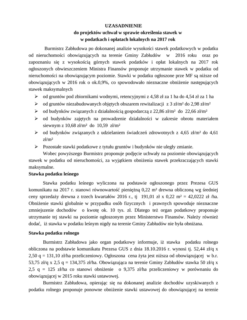 UZASADNIENIE do projektów uchwał w sprawie określenia stawek w w podatkach i opłatach lokalnych na 2017 rok Burmistrz Zabłudowa po dokonanej analizie wysokości stawek podatkowych w podatku od nieruchomości obowiązujących na terenie Gminy Zabłudów w 2016 roku oraz po zapoznaniu się z wysokością górnych stawek podatków i opłat lokalnych na 2017 rok ogłoszonych obwieszczeniem Ministra Finansów proponuje utrzymanie stawek w podatku od nieruchomości na obowiązującym poziomie. Stawki w podatku ogłoszone prze MF są niższe od obowiązujących w 2016 rok o ok.0,9%, co spowodowało nieznaczne obniżenie następujących stawek maksymalnych od gruntów pod zbiornikami wodnymi, retencyjnymi z 4,58 zł za 1 ha do 4,54 zł za 1 ha od gruntów niezabudowanych objętych obszarem rewitalizacji z 3 zł/m² do 2,98 zł/m² od budynków związanych z działalnością gospodarczą z 22,86 zł/m² do 22,66 zł/m² od budynków zajętych na prowadzenie działalności w zakresie obrotu materiałem siewnym z 10,68 zł/m² do 10,59 zł/m² od budynków związanych z udzielaniem świadczeń zdrowotnych z 4,65 zł/m² do 4,61 zł/m² Pozostałe stawki podatkowe z tytułu gruntów i budynków nie uległy zmianie. Wobec powyższego Burmistrz proponuje podjęcie uchwały na poziomie obowiązujących stawek w podatku od nieruchomości, za wyjątkiem obniżenia stawek przekraczających stawki maksymalne. Stawka podatku leśnego Stawka podatku leśnego wyliczona na podstawie ogłoszonego przez Prezesa GUS komunikatu na 2017 r. stanowi równowartość pieniężną 0,22 m² drewna obliczoną wg średniej ceny sprzedaży drewna z trzech kwartałów 2016 r., tj 191,01 zł x 0,22 m² = 42,0222 zł /ha. Obniżenie stawki globalnie w przypadku osób fizycznych i prawnych spowoduje nieznaczne zmniejszenie dochodów o kwotę ok. 10 tys. zł. Dlatego też organ podatkowy proponuje utrzymanie tej stawki na poziomie ogłoszonym przez Ministerstwo Finansów. Należy również dodać, iż stawka w podatku leśnym nigdy na terenie Gminy Zabłudów nie była obniżana. Stawka podatku rolnego Burmistrz Zabłudowa jako organ podatkowy informuje, iż stawka podatku rolnego obliczona na podstawie komunikatu Prezesa GUS z dnia 18.10.2016 r. wynosi tj. 52,44 zł/q x 2,50 q = 131,10 zł/ha przeliczeniowy. Ogłoszona cena żyta jest niższa od obowiązującej w b.r. 53,75 zł/q x 2,5 q = 134,375 zł/ha. Obowiązująca na terenie Gminy Zabłudów stawka 50 zł/q x 2,5 q = 125 zł/ha co stanowi obniżenie o 9,375 zł/ha przeliczeniowy w porównaniu do obowiązującej w 2015 roku stawki ustawowej. Burmistrz Zabłudowa, opierając się na dokonanej analizie dochodów uzyskiwanych z podatku rolnego proponuje ponowne obniżenie stawki ustawowej do obowiązującej na terenie gminy 50 zł/q. Obniżenie stawki ustawowej w proponowanej wysokości spowoduje zmniejszenie kwoty dochodów budżetowych z tego tytułu w 2017 roku o kwotę ok. 80 tys. zł. Podatnikami podatku rolnego są rolnicy, którzy prowadząc działalność rolniczą nie ponoszą kosztów podatku dochodowego, a z tytułu podatków lokalnych płacą wyłącznie podatek od budynków mieszkalnych, zaś budynki pozostałe podlegają zwolnieniu ustawowemu. Do przygotowania projektu budżetu założono obniżenie stawki w proponowanej wysokości. Wobec powyższych argumentów pod obrady Rady Miejskiej wnoszona jest wyżej określona stawka. Ponadto należy stwierdzić, iż w sąsiadujących gminach w 201 roku obowiązuje stawka ustawowa i na rok 2017 nie przewiduje się obniżenia stawki ogłoszonej, ponieważ jej ustawowe obniżenie to 2,71% w stosunku do obowiązującej. Jedynie Gmina Juchnowiec, w której stawka podatku rolnego określona na bazie ceny 1q żyta wynosząca 40 zł, proponuje podjęcie uchwały o pozostawieniu stawki podatku na obowiązującym poziomie. Stawka podatku od środków transportowych Zgodnie z art. 12 b ustawy o podatkach i opłatach lokalnych, Minister Finansów przelicza stawki minimalne podatku od środków transportowych określone w załącznikach do ustawy na następny rok podatkowy, zgodnie ze wskaźnikiem zmiany kursu euro i walut krajowych, ogłaszanym w Dzienniku Urzędowym Unii Europejskiej, na pierwszy dzień roboczy października danego roku, w stosunku do kursu euro w roku poprzedzającym dany rok podatkowy, w przypadku gdy wskaźnik ten jest wyższy niż 5%. Nastąpił nieznaczny wzrost kursu euro, w związku z tym minimalne stawki podatku od środków transportowych, które będą obowiązywać w 2017 roku pozostaną na niezmienionym poziomie w stosunku do obowiązujących w roku bieżącym. Maksymalne stawki podatku od środków transportowych zostały ogłoszone w obwieszczeniu ministra finansów z 07.10.2016 r. (M. P., poz. 979), uległy obniżeniu o 0,9% w stosunku do obowiązujących w 2016 roku, czyli o wskaźnik zmiany cen towarów i usług konsumpcyjnych. Biorąc pod uwagę powyższe Burmistrz Zabłudowa proponuje utrzymać stawki w podatku od środków transportu na obecnym poziomie, ponieważ są porównywalne do poziomu gmin podmiejskich. Ponadto wzrost tych stawek nie wpłynie znacząco na budżet z uwagi na niewielką ilość pojazdów zarejestrowanych i podlegających opodatkowaniu na terenie Gminy Zabłudów. Zmiana uchwały jest niezbędna z uwagi na zmianę przepisów dotyczących opodatkowania autobusów do 22 miejsc i powyżej. Opłata targowa Od roku 2015 obowiązują stawki dziennej opłaty targowej od osób fizycznych, prawnych i jednostek organizacyjnych nie posiadających osobowości prawnej, dlatego też mając na uwadze zachęcenie sprzedających do handlu na targowicy w Zabłudowie Burmistrz jako organ podatkowy proponuje utrzymanie opłaty targowej na obecnym poziomie. Obecnie dochody z tego tytułu wynoszą 7.000 zł. Przyczynił się do tego nie tylko wzrost stawek opłaty targowej, ale również skuteczność jej egzekucji. Należy nadmienić, iż Gmina Zabłudów ponosi koszty dzierżawy gruntu 