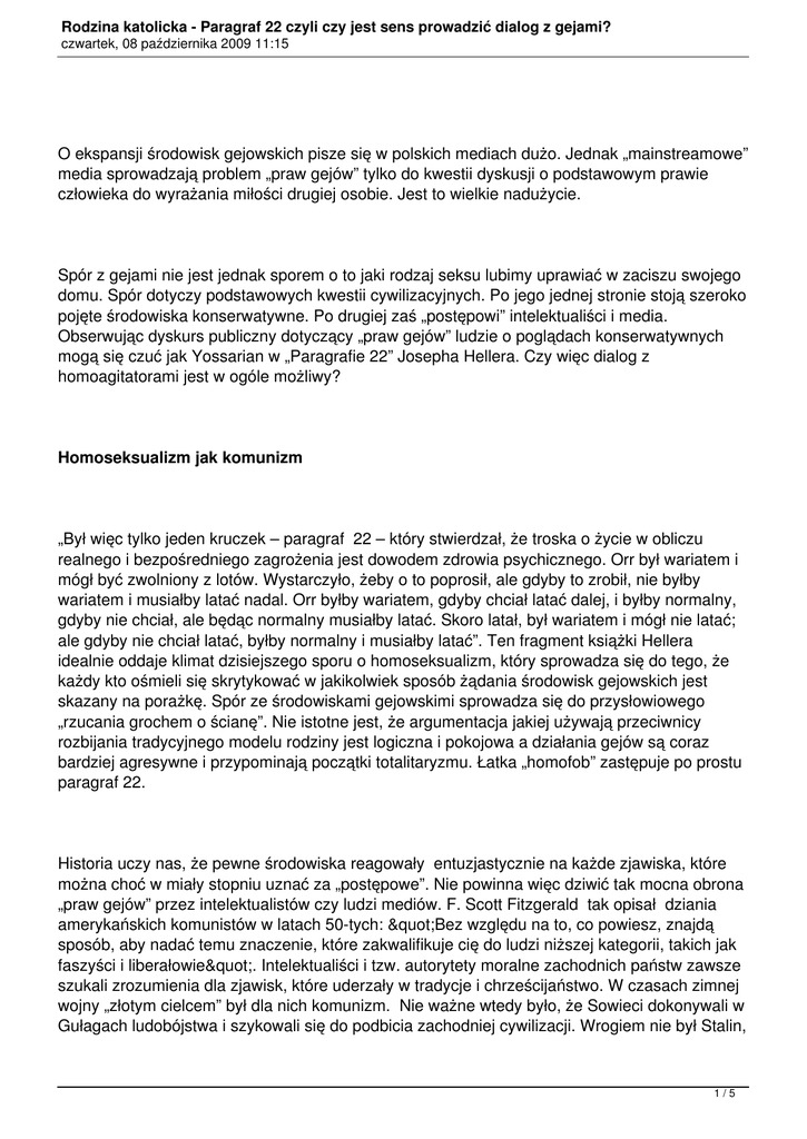 Rodzina katolicka - Paragraf 22 czyli czy jest sens prowadzić dialog z gejami? czwartek, 08 października 2009 11:15 O ekspansji środowisk gejowskich pisze się w polskich mediach dużo. Jednak „mainstreamowe” media sprowadzają problem „praw gejów” tylko do kwestii dyskusji o podstawowym prawie człowieka do wyrażania miłości drugiej osobie. Jest to wielkie nadużycie. Spór z gejami nie jest jednak sporem o to jaki rodzaj seksu lubimy uprawiać w zaciszu swojego domu. Spór dotyczy podstawowych kwestii cywilizacyjnych. Po jego jednej stronie stoją szeroko pojęte środowiska konserwatywne. Po drugiej zaś „postępowi” intelektualiści i media. Obserwując dyskurs publiczny dotyczący „praw gejów” ludzie o poglądach konserwatywnych mogą się czuć jak Yossarian w „Paragrafie 22” Josepha Hellera. Czy więc dialog z homoagitatorami jest w ogóle możliwy? Homoseksualizm jak komunizm „Był więc tylko jeden kruczek – paragraf 22 – który stwierdzał, że troska o życie w obliczu realnego i bezpośredniego zagrożenia jest dowodem zdrowia psychicznego. Orr był wariatem i mógł być zwolniony z lotów. Wystarczyło, żeby o to poprosił, ale gdyby to zrobił, nie byłby wariatem i musiałby latać nadal. Orr byłby wariatem, gdyby chciał latać dalej, i byłby normalny, gdyby nie chciał, ale będąc normalny musiałby latać. Skoro latał, był wariatem i mógł nie latać; ale gdyby nie chciał latać, byłby normalny i musiałby latać”. Ten fragment książki Hellera idealnie oddaje klimat dzisiejszego sporu o homoseksualizm, który sprowadza się do tego, że każdy kto ośmieli się skrytykować w jakikolwiek sposób żądania środowisk gejowskich jest skazany na porażkę. Spór ze środowiskami gejowskimi sprowadza się do przysłowiowego „rzucania grochem o ścianę”. Nie istotne jest, że argumentacja jakiej używają przeciwnicy rozbijania tradycyjnego modelu rodziny jest logiczna i pokojowa a działania gejów są coraz bardziej agresywne i przypominają początki totalitaryzmu. Łatka „homofob” zastępuje po prostu paragraf 22. Historia uczy nas, że pewne środowiska reagowały entuzjastycznie na każde zjawiska, które można choć w miały stopniu uznać za „postępowe”. Nie powinna więc dziwić tak mocna obrona „praw gejów” przez intelektualistów czy ludzi mediów. F. Scott Fitzgerald tak opisał dziania amerykańskich komunistów w latach 50-tych: "Bez względu na to, co powiesz, znajdą sposób, aby nadać temu znaczenie, które zakwalifikuje cię do ludzi niższej kategorii, takich jak faszyści i liberałowie". Intelektualiści i tzw. autorytety moralne zachodnich państw zawsze szukali zrozumienia dla zjawisk, które uderzały w tradycje i chrześcijaństwo. W czasach zimnej wojny „złotym cielcem” był dla nich komunizm. Nie ważne wtedy było, że Sowieci dokonywali w Gułagach ludobójstwa i szykowali się do podbicia zachodniej cywilizacji. Wrogiem nie był Stalin, 1/5 Rodzina katolicka - Paragraf 22 czyli czy jest sens prowadzić dialog z gejami? czwartek, 08 października 2009 11:15 Chruszczow, Castro czy Pol-Pot. Wrogami byli Reagan, Thatcher czy Franco. Dzisiaj komunizm zastąpił skrajny liberalizm obyczajowy mający swój początek w rewolucji „pokolenia 68”, które czerpiąc pełnymi garściami z ideałów rewolucji francuskiej pragnęło zrealizować sowiecką „pierekowkę dusz”. Ci sami ludzie, którzy w latach 60-tych stali na barykadach w koszulkach z Che, dzisiaj kształtują młode pokolenia Europejczyków i Amerykanów na uniwersytetach, poprzez media czy literaturę. Oczywiście tak jak w przypadku komunizmu, fakty nie miały znaczenia, tak teraz badania mówiące o szkodliwości praktyk gejowskich również są pacyfikowane. Nie na darmo George Orwell pisał, że „Istnieją rzeczy tak bzdurne, że tylko intelektualiści mogli w nie uwierzyć” Prawdziwy intelektualista dopuszcza jednak możliwość polemiki ze swoimi tezami. Apologeci homoseksualnej rewolucji mogą pozwolić sobie jednak na wykluczanie przeciwników z dyskursu publicznego, bowiem mają swój paragraf 22. Polskie media w służbie gejów W Polsce homoseksualna agitacja posuwa się w zastraszającym tempie i jest coraz bardziej odczuwalna dla przeciętnego obywatela. Pole walki przesunęło się już z zaciszy pokojów w redakcji „Krytyki politycznej” czy „Gazety Wyborczej” na obszar prawodawstwa. Dr. Janusz Kochanowski popiera postulat by za znieważanie gejów i lesbijek obywatel był ukarany pozbawieniem wolności do lat trzech. Nie wiadomo jednak jak będzie interpretowany owy zapis, ale patrząc na doświadczenie krajów zachodnich można przypuszczać, że unijne obyczaje będą takie same we wszystkich krajach członkowskich. Polskie media już się przygotowały na śpiew jednym głosem z „postępowymi” organizacjami gejowskimi. Gazeta Wyborcza wsławiła się niedawno wyjątkowo podłym i pełnym insynuacji atakiem na dr. Davida Camerona, który od kilkudziesięciu lat bada homoseksualizm, co doprowadziło do odwołania przez władze Uniwersytetu Kardynała Stefana Wyszyńskiego jego wykładu. Liberalne media elektroniczne podejmując temat „prześladowania” gejów w naszym kraju zapraszają najczęściej do dyskusji poważnych działaczy gejowskich z barwnymi przedstawicielami prawicy. Pod przykrywką obiektywnej rozmowy dwóch stron sporu chodzi po prostu o to, by widz widząc kontrowersyjnego polityka jak Korwin- Mikke, który jest znany z czasami nieprzemyślanych wypowiedzi i opanowanego oraz merytorycznie przygotowanego geja, wyciągnął jedynie słuszne wnioski. Taką manipulację w perfekcyjny sposób opisał w „Dolinie nicości” Bronisław Wildstein. Jeżeli do tego dorzuci się coraz częściej pojawiające się wątki ( zawsze pozytywnych) postaci homoseksualnych w namiętnie oglądanych przez Polaków serialach telewizyjnych to można mieć pewność, że media mają m