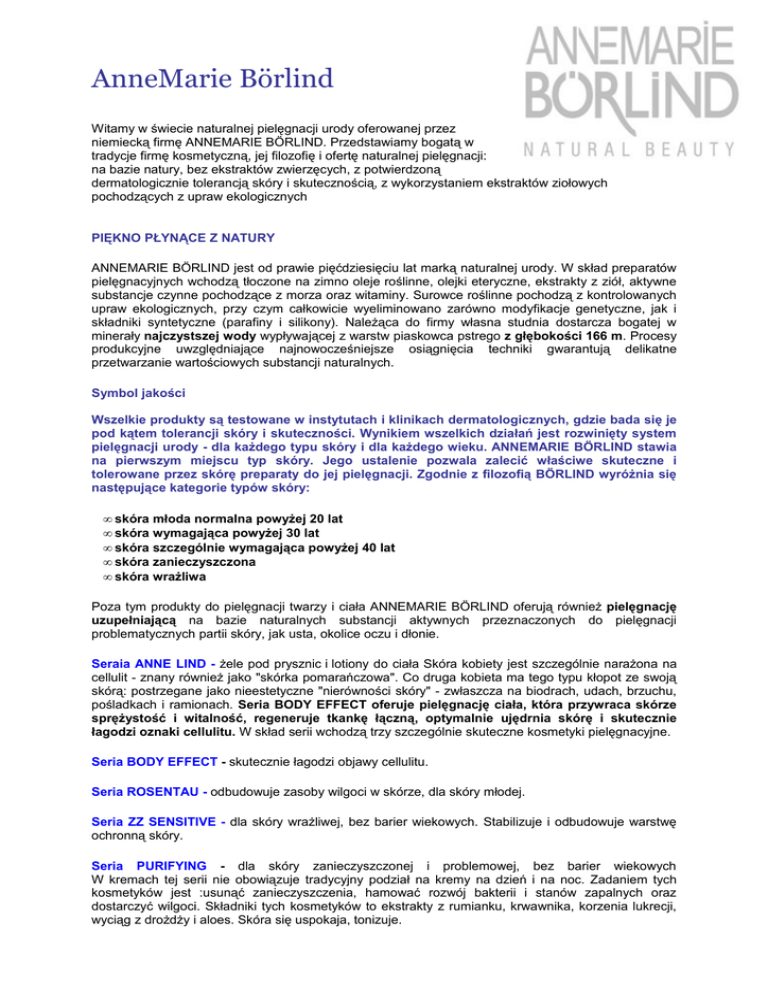 AnneMarie Börlind Witamy w świecie naturalnej pielęgnacji urody oferowanej przez niemiecką firmę ANNEMARIE BÖRLIND. Przedstawiamy bogatą w tradycje firmę kosmetyczną, jej filozofię i ofertę naturalnej pielęgnacji: na bazie natury, bez ekstraktów zwierzęcych, z potwierdzoną dermatologicznie tolerancją skóry i skutecznością, z wykorzystaniem ekstraktów ziołowych pochodzących z upraw ekologicznych PIĘKNO PŁYNĄCE Z NATURY ANNEMARIE BÖRLIND jest od prawie pięćdziesięciu lat marką naturalnej urody. W skład preparatów pielęgnacyjnych wchodzą tłoczone na zimno oleje roślinne, olejki eteryczne, ekstrakty z ziół, aktywne substancje czynne pochodzące z morza oraz witaminy. Surowce roślinne pochodzą z kontrolowanych upraw ekologicznych, przy czym całkowicie wyeliminowano zarówno modyfikacje genetyczne, jak i składniki syntetyczne (parafiny i silikony). Należąca do firmy własna studnia dostarcza bogatej w minerały najczystszej wody wypływającej z warstw piaskowca pstrego z głębokości 166 m. Procesy produkcyjne uwzględniające najnowocześniejsze osiągnięcia techniki gwarantują delikatne przetwarzanie wartościowych substancji naturalnych. Symbol jakości Wszelkie produkty są testowane w instytutach i klinikach dermatologicznych, gdzie bada się je pod kątem tolerancji skóry i skuteczności. Wynikiem wszelkich działań jest rozwinięty system pielęgnacji urody - dla każdego typu skóry i dla każdego wieku. ANNEMARIE BÖRLIND stawia na pierwszym miejscu typ skóry. Jego ustalenie pozwala zalecić właściwe skuteczne i tolerowane przez skórę preparaty do jej pielęgnacji. Zgodnie z filozofią BÖRLIND wyróżnia się następujące kategorie typów skóry: • • • • • skóra młoda normalna powyżej 20 lat skóra wymagająca powyżej 30 lat skóra szczególnie wymagająca powyżej 40 lat skóra zanieczyszczona skóra wrażliwa Poza tym produkty do pielęgnacji twarzy i ciała ANNEMARIE BÖRLIND oferują również pielęgnację uzupełniającą na bazie naturalnych substancji aktywnych przeznaczonych do pielęgnacji problematycznych partii skóry, jak usta, okolice oczu i dłonie. Seraia ANNE LIND - żele pod prysznic i lotiony do ciała Skóra kobiety jest szczególnie narażona na cellulit - znany również jako "skórka pomarańczowa". Co druga kobieta ma tego typu kłopot ze swoją skórą: postrzegane jako nieestetyczne "nierówności skóry" - zwłaszcza na biodrach, udach, brzuchu, pośladkach i ramionach. Seria BODY EFFECT oferuje pielęgnację ciała, która przywraca skórze sprężystość i witalność, regeneruje tkankę łączną, optymalnie ujędrnia skórę i skutecznie łagodzi oznaki cellulitu. W skład serii wchodzą trzy szczególnie skuteczne kosmetyki pielęgnacyjne. Seria BODY EFFECT - skutecznie łagodzi objawy cellulitu. Seria ROSENTAU - odbudowuje zasoby wilgoci w skórze, dla skóry młodej. Seria ZZ SENSITIVE - dla skóry wrażliwej, bez barier wiekowych. Stabilizuje i odbudowuje warstwę ochronną skóry. Seria PURIFYING - dla skóry zanieczyszczonej i problemowej, bez barier wiekowych W kremach tej serii nie obowiązuje tradycyjny podział na kremy na dzień i na noc. Zadaniem tych kosmetyków jest :usunąć zanieczyszczenia, hamować rozwój bakterii i stanów zapalnych oraz dostarczyć wilgoci. Składniki tych kosmetyków to ekstrakty z rumianku, krwawnika, korzenia lukrecji, wyciąg z drożdży i aloes. Skóra się uspokaja, tonizuje. Seria LL REGENERATION - regeneracja skóry Dla osób z pierwszymi oznakami zmarszczek, uskarżających się na brak naturalnego natłuszczenia skóry, odczuwających zwiotczenie skóry. Zawiera tzw. BIOKOMPLEKS - opatentowana formuła składników chroniona tajemnicą firmy. Biokomleks poprawia obraz skóry, co zostało udowodnione w badaniach przeprowadzonych m. in. na żądanie Amerykanów. To seria doskonała także po zabiegu depilacji oraz dla mężczyzn po goleniu. WAŻNE! każdy preparat serii LL Regeneration należy przed użyciem ogrzać na opuszkach palców. Seria SYSTEM ABSOLUT - nawilżenie i odbudowa Dla osób aktywnych, dużo przebywający na powietrzu, w pomieszczeniach klimatyzowanych, z widocznymi zmarszczkami. Szczególnie ŻEL REGENERUJĄCY, którego formuła oparta jest o kwas hialuronowy i wyciąg z alg, polecany jako serum- które nawilża i daje poczucie jędrności, doskonale ochrania skórę przed wpływami środowiska. Produkty uzupełniające - dopełniające każdy rodzaj pielęgnacji. Dla każdego ważny kosmetyk. PURAVERA - farby do włosów - Piękne kolory, dokładne krycie, nawet silnej siwizny. Nie zawierają: m-phenylendiaminy, parafin, silikonów, amoniaku, formaldehydu i związków halogenorganicznych. Dodatkowa saszetka z odżywką. Łatwe w użyciu i gwarantowany wspaniały efekt! ============================================================================= Fragment wykładu pani Patrycji Maas – kosmetolog z firmy ANNEMARIE BÖRLIND- wygłoszonego na seminerium w Polanicy Zdrój (grudzień 2007) Zadanie kosmetyków ANNEMARIE BÖRLIND Zgodnie z filozofią produktów obowiązują pewne kanony produkcji, stosowanych surowców, które zobowiązują i których firma ANNEMARIE BÖRLIND ściśle przestrzega: każdy kosmetyk opuszczający mury firmy ma za zadanie wspierać lub korygować naturalne funkcje skóry. Nie jest on cudownym środkiem, który w ramach np. pielęgnacji anti-aging spowoduje natychmiastową i radykalną zmianę obrazu skóry. Stosowanie kosmetyków naturalnych wymaga cierpliwości, nawet jeśli czas ich działania miałby wynieść 30 dni. Hasła innych firm kosmetycznych obiecujące „cudowne i rewelacyjne działanie” nie są hasłami firmy ANNEMARIE BÖRLIND. Testowanie Kosmetyki ANNEMARIE BÖRLIND są poddawane testom w różnych, niezależnych klinikach, które przeprowadzają zarówno badania pod kątem tolerancji skóry, jak i pod kątem efektów stosowania kosmetyków. Efekty te są ściśle dokumentowan