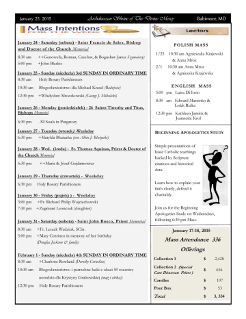January 25, 2015 January 24 - Saturday (sobota) - Saint Francis de Sales, Bishop and Doctor of the Church Memorial 8:30 am 5:00 pm ++Genowefa, Roman, Czesław, & Bogusław Janus Szymańscy) +John Blaskis January 25 - Sunday (niedzela) 3rd SUNDAY IN ORDINARY TIME 8:30 am Holy Rosary Parishioners 10:30 am Błogosławieństwo dla Michael Krasel (Rodziecie) 12:30 pm +Władysław Mroczkowski (George J. Mikulski) January 26 - Monday (poniedziałek) - 26 Saints Timothy and Titus, Bishops Memorial 6:30 pm All Souls in Purgatory January 27 - Tuesday (wtorek) -Weekday 6:30 pm +Matylda Błażucka (son Albin J. Błażucki) January 28 - Wed. (środa) - St. Thomas Aquinas, Priest & Doctor of the Church Memorial 6:30 pm Baltimore, MD Archdiocesan Shrine of The Divine Mercy ++Maria & Józef Gajdamowicz P O L I SH M AS S 1/25 10:30 am Agnieszaka Krajewski & Anna Mroz 2/1 10:30 am Anna Mroz & Agnieszka Krajewska E N G L ISH M A SS 5:00 pm Luisa Di Iorio 8:30 am Edward Marcinko & Lolek Rulka 12:30 pm Kathleen Jamitis & Jeannette Krol BEGINNING APOLOGETICS STUDY Simple presentations of basic Catholic teachings backed by Scripture citations and historical data. January 29 - Thursday (czwartek) - Weekday 6:30 pm Holy Rosary Parishioners January 30 - Friday (piątek) ) - Weekday 3:00 pm +Fr. Richard Philip Wojciechowski 7:30 pm +Zugmunt Leonczak (daughter) January 31 - Saturday (sobota) - Saint John Bosco, Priest Memorial 8:30 am 5:00 pm +Fr. Leszek Wedziuk, SChr. +Mary Centineo in memory of her birthday (Douglas Jackson & family) Learn how to explain your faith clearly, defend it charitably. Join us for the Beginning Apologetics Study on Wedensdays, following 6:30 pm Mass. January 17-18, 2015 Mass Attendance 336 Offerings February 1 - Sunday (niedzela) 4th SUNDAY IN ORDINARY TIME 8:30 am +Charlotte Rowland (Dorothy Cornelius) Collection 1 $ 2,428 10:30 am Collection 2 (Special Care Diocesan Priest ) $ 656 Candles $ 197 Poor Box $ 53 Total $ 3, 334 Błogosławieństwo i patrzebne łaski z okazi 50 rocznicy uorodzin dla Krystyny Grabowskiej (mąż i córka)) 12:30 pm Holy Rosary Parishioners January 25, 2015 Archdiocesan Shrine of The Divine Mercy Baltimore, MD THANK YOU / DZIĘKUJEMY !!! The large Votive Lamps on the Main Altar & Bardzo serdecznie pragniemy podziękować Organizacji Polskich Rodzin i wszystkim pozostałym osobom za przygotowanie tegorocznej zabawy sylwestrowej. Ilość ludzi, która skorzystała z zaproszenia i ich dobre słowa są najlepszym podsumowaniem tego wydarzenia in the Divine Mercy Shrine are for those wanting a Votive Lamp burning for their special intentions day and night. The candle will stay lit until it burns itself out. The envelopes for lighting a Votive Lamp are placed in the pews or on the table in back of the church. Candles are burning for: Nasze podziękowania kierujemy również do zespołu tanecznego „Ojczyzna” za piękny koncert kolęd, który odbył się w ostatnią niedzielę, oraz do członków Organizacji Polskiej Kultury za wkład w przygotowanie tegorocznego Opłatka Parafialnego. THANK YOU / THANK YOU !!! A very heartfelt thank you to the "Organization of Polish Families” and to all those involved in the coordination of our New Year's Eve party. The large turnout along with all the compliments we received is a testament to its success. A sincere thank you goes to the dance group "Fatherland" for the beautiful Carol Concert, which took place last Sunday, and to the members of the Polish Culture for their contribution to the preparation of this year's wafer dinner. To request your CONTRIBUTION STATEMENT for 2014, please fill out the form below, detach it, and put it in an envelope marked „STATMENT”. You can drop it in a collection basket, mail it or drop it off at the rectory office. 1. Katherine Butler for all her intentions 2. Sister Kay for her good health & intentions C O NC E RT: P I A NI S T, JA S O N S O LO U NI A S St. Joseph Monastery Parish is hosting a Classical Concert. Mr. Solounias has a large repertoire from such artists as Bach, Beethoven, Chopin, Mozart and others. Location: 3801 Old Frederick Road...Baltimore, MD 21229. Parking is free and also the concert, a free will offering will be welcomed. Time: 12:30 pm within the church. Date: February 15, 2015, in the case of inclement weather the date is February 22, 2015 at the same time. Free light refreshments will be provided. If you have any questions contact Kevin Frecker, Musical Director by calling the church rectory office at 410 566-0877. Welcome New Parishioners Katarzyna & Piotr Palacz CONTRIBUTION STATEMENT FOR 2014 Name: Krzysztof & Dorota and Alan Grabowski Marek & Teresa Bieniek Envelope No.: Address: This week’s second collection after Holy Communion is for Maintenance Fund. As always, we thank you for your generosity. January 25, 2015 Archdiocesan Shrine of The Divine Mercy Baltimore, MD E U C H A R I S T I C ADORATION OF OUR LORD EVERY FRIDAY N E W Y O U N G A D U LT M I N I S T RY H O LY R O S A RY AT TOPIC: MY SOUL LONGS FOR YOU, O GOD BY VINNY MARCHIONNNI, SJ Come Join us on our first talk of the year! ... Why do we even acknowledge or come up w/the idea of God? Jesuit Seminarian Vinny Marchionni explains that the desire is planted by God himself. Join us on Saturday, February 7 at 7:30pm - 9:00pm. KWIATY NA OŁTARZ MATKI BOSKIEJ NIEUSTAJĄCEJ POMOCY. W tym tygodniu kwiaty ufundowała Maria Sawera. Bóg zapłać. Can we not spend one hour with Him during Eucharistic Adoration of the Most Blessed Sacrament? Eucharistic Adoration offers us many hours to thank God for the sufferings that He endured for our sake. Adoration begins fallowing the 3 pm Mass on Friday and ends prior to the 7:30 pm Polish Mass PIĄTKOWA ADORACJA EUCHARYSTYCZNEGO JEZUSA Czy znajdziesz choć chwilę, by spotkać się z Jezusem na Adoracji? Adoracja Eucharystyczna w naszym kościele odbywa się w każdy piątek po Mszy w angielskim o 3:00 pm i trwa aż do Mszy w języku polskim o 7:30 pm. FR. RICHAR