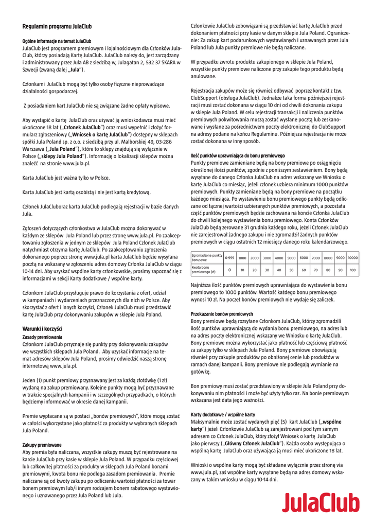 Regulamin programu JulaClub Ogólne informacje na temat JulaClub JulaClub jest programem premiowym i lojalnościowym dla Członków JulaClub, którzy posiadają Kartę JulaClub. JulaClub należy do, jest zarządzany i administrowany przez Jula AB z siedzibą w, Julagatan 2, 532 37 SKARA w Szwecji (zwaną dalej „Jula”). Członkami JulaClub mogą być tylko osoby fizyczne nieprowadzące działalności gospodarczej. Z posiadaniem kart JulaClub nie są związane żadne opłaty wpisowe. Aby wystąpić o kartę JulaClub oraz używać ją wnioskodawca musi mieć ukończone 18 lat („Członek JulaClub”) oraz musi wypełnić i złożyć formularz zgłoszeniowy („Wniosek o kartę JulaClub”) dostępny w sklepach spółki Jula Poland sp. z o.o. z siedzibą przy ul. Malborskiej 49, 03-286 Warszawa („Jula Poland”), które to sklepy znajdują się wyłącznie w Polsce („sklepy Jula Poland”). Informację o lokalizacji sklepów można znaleźć na stronie www.jula.pl. Karta JulaClub jest ważna tylko w Polsce. Karta JulaClub jest kartą osobistą i nie jest kartą kredytową. Członek JulaCluboraz karta JulaClub podlegają rejestracji w bazie danych Jula. Zgłoszeń dotyczących członkostwa w JulaClub można dokonywać w każdym ze sklepów Jula Poland lub przez stronę www.jula.pl. Po zaakceptowaniu zgłoszenia w jednym ze sklepów Jula Poland Członek JulaClub natychmiast otrzyma kartę JulaClub. Po zaakceptowaniu zgłoszenia dokonanego poprzez stronę www.jula.pl karta JulaClub będzie wysyłana pocztą na wskazany w zgłoszeniu adres domowy Członka JulaClub w ciągu 10-14 dni. Aby uzyskać wspólne karty członkowskie, prosimy zapoznać się z informacjami w sekcji Karty dodatkowe / wspólne karty. Członkom JulaClub przysługuje prawo do korzystania z ofert, udział w kampaniach i wydarzeniach przeznaczonych dla nich w Polsce. Aby skorzystać z ofert i innych korzyści, Członek JulaClub musi przedstawić kartę JulaClub przy dokonywaniu zakupów w sklepie Jula Poland. Warunki i korzyści Zasady premiowania Członkom JulaClub przyznaje się punkty przy dokonywaniu zakupów we wszystkich sklepach Jula Poland. Aby uzyskać informacje na temat adresów sklepów Jula Poland, prosimy odwiedzić naszą stronę internetową www.jula.pl. Jeden (1) punkt premiowy przyznawany jest za każdą złotówkę (1 zł) wydaną na zakup premiowany. Kolejne punkty mogą być przyznawane w trakcie specjalnych kampanii i w szczególnych przypadkach, o których będziemy informować w okresie danej kampanii. Premie wypłacane są w postaci „bonów premiowych”, które mogą zostać w całości wykorzystane jako płatność za produkty w wybranych sklepach Jula Poland. Zakupy premiowane Aby premia była naliczana, wszystkie zakupy muszą być rejestrowane na karcie JulaClub przy kasie w sklepie Jula Poland. W przypadku częściowej lub całkowitej płatności za produkty w sklepach Jula Poland bonami premiowymi, kwota bonu nie podlega zasadom premiowania. Premie naliczane są od kwoty zakupu po odliczeniu wartości płatności za towar bonem premiowym lub/i innym rodzajem bonem rabatowego wystawionego i uznawanego przez Jula Poland lub Jula. Członkowie JulaClub zobowiązani są przedstawiać kartę JulaClub przed dokonaniem płatności przy kasie w danym sklepie Jula Poland. Ograniczenie: Za zakup kart podarunkowych wystawianych i uznawanych przez Jula Poland lub Jula punkty premiowe nie będą naliczane. W przypadku zwrotu produktu zakupionego w sklepie Jula Poland, wszystkie punkty premiowe naliczone przy zakupie tego produktu będą anulowane. Rejestracja zakupów może się również odbywać poprzez kontakt z tzw. ClubSupport (obsługa JulaClub). Jednakże taka forma późniejszej rejestracji musi zostać dokonana w ciągu 10 dni od chwili dokonania zakupu w sklepie Jula Poland. W celu rejestracji transakcji i naliczenia punktów premiowych pokwitowania muszą zostać wysłane pocztą lub zeskanowane i wysłane za pośrednictwem poczty elektronicznej do ClubSupport na adresy podane na końcu Regulaminu. Późniejsza rejestracja nie może zostać dokonana w inny sposób. Ilość punktów uprawniająca do bonu premiowego Punkty premiowe zamieniane będą na bony premiowe po osiągnięciu określonej ilości punktów, zgodnie z poniższym zestawieniem. Bony będą wysyłane do danego Członka JulaClub na adres wskazany we Wniosku o kartę JulaClub co miesiąc, jeżeli członek uzbiera minimum 1000 punktów premiowych. Punkty zamieniane będą na bony premiowe na początku każdego miesiąca. Po wystawieniu bonu premiowego punkty będą odliczane od łącznej wartości uzbieranych punktów premiowych, a pozostała część punktów premiowych będzie zachowana na koncie Członka JulaClub do chwili kolejnego wystawienia bonu premiowego. Konta Członków JulaClub będą zerowane 31 grudnia każdego roku, jeżeli Członek JulaClub nie zarejestrował żadnego zakupu i nie zgromadził żadnych punktów premiowych w ciągu ostatnich 12 miesięcy danego roku kalendarzowego. Zgromadzone punkty 0-999 bonusowe Kwota bonu premiowego (zł) 0 1000 2000 3000 4000 5000 6000 7000 8000 10 20 30 40 50 60 70 80 9000 10000 90 Najniższa ilość punktów premiowych uprawniająca do wystawienia bonu premiowego to 1000 punktów. Wartość każdego bonu premiowego wynosi 10 zł. Na poczet bonów premiowych nie wydaje się zaliczek. Przekazanie bonów premiowych Bony premiowe będą rozsyłane Członkom JulaClub, którzy zgromadzili ilość puntków uprawniającą do wydania bonu premiowego, na adres lub na adres poczty elektronicznej wskazany we Wniosku o kartę JulaClub. Bony premiowe można wykorzystać jako płatność lub częściową płatność za zakupy tylko w sklepach Jula Poland. Bony premiowe obowiązują również przy zakupie produktów po obniżonej cenie lub produktów w ramach danej kampanii. Bony premiowe nie podlegają wymianie na gotówkę. Bon premiowy musi zostać przedstawiony w sklepie Jula Poland 