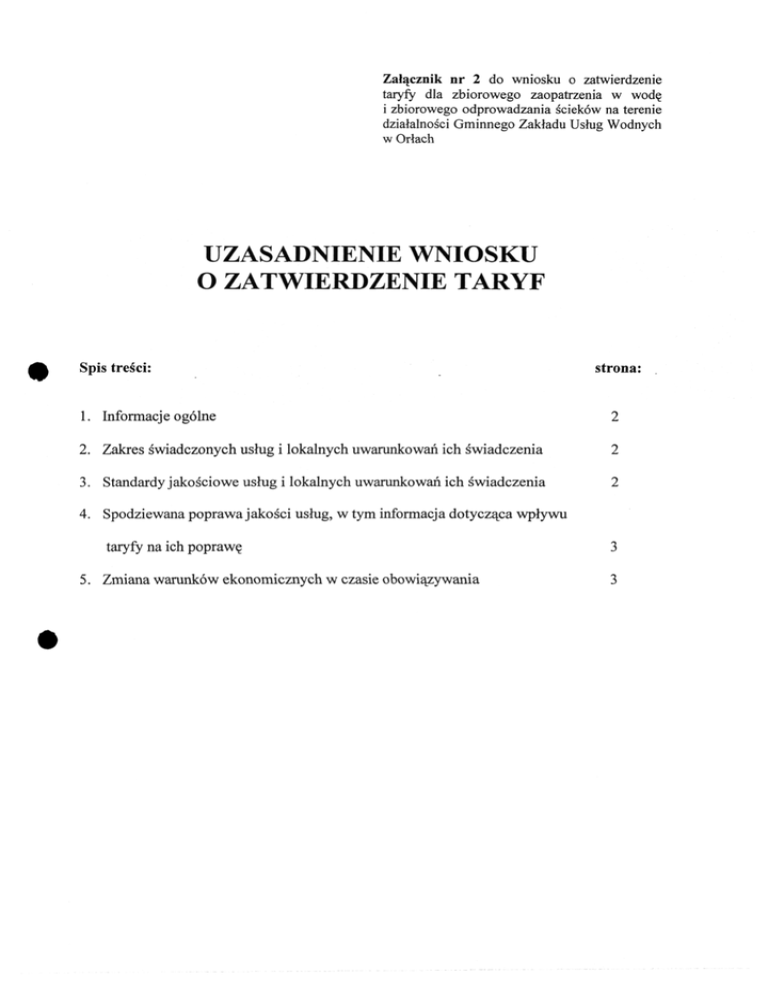 Załącznik nr 2 do wniosku o zatwierdzenie taryfy dla zbiorowego zaopatrzenia w wodę i zbiorowego odprowadzania ścieków na terenie działalności Gminnego Zakładu Usług Wodnych w Orłach UZASADNIENIE WNIOSKU O ZATWIERDZENIE TARYF Spis treści: strona: 1. Informacje ogólne 2 2. Zakres świadczonych usług i lokalnych uwarunkowań ich świadczenia 2 3. Standardy jakościowe usług i lokalnych uwarunkowań ich świadczenia 2 4. Spodziewana poprawa jakości usług, w tym informacja dotycząca wpływu taryfy na ich poprawę 5. Zmiana warunków ekonomicznych w czasie obowiązywania 3 3 1. Informacje ogólne: Taryfy stanowią zestawienie cen i stawek opłat za zbiorowe zaopatrzenie w wodę i zbiorowe odprowadzenie ścieków na terenie działania Gminnego Zakładu Usług Wodnych w Orłach zwany dalej zakładem. Wniosek o zatwierdzenie taryf został przygotowany zgodnie z przepisami Ustawy z dnia 7 czerwca 2001 roku o zbiorowym zaopatrzeniu w wodę i zbiorowym odprowadzaniu ścieków (Dz. U. z 2006 r. Nr 123, póz. 858), zwanej dalej ustawą oraz Rozporządzenia Ministra Infrastruktury z dnia 28 czerwca 2006 roku w sprawie określenia taryf, wzoru wniosku o zatwierdzenie taryf oraz warunków rozliczeń za zbiorowe zaopatrzenie w wodę i zbiorowe odprowadzanie ścieków (Dz. U. Nr 127, póz. 886), zwanego dalej rozporządzeniem. Wszelkie określenia odnoszące się do struktur taryfowych, rodzajów taryf i metodologii niezbędnych przychodów, użyte w tekście pochodzą z tej ustawy lub rozporządzenia. Przy opracowaniu wniosku o zatwierdzenie taryf przyjęto założenia zgodne z ustawą i rozporządzeniem o zbiorowym zaopatrzeniu w wodę i zbiorowym odprowadzaniu ścieków. 2. Zakres świadczonych usług i lokalnych uwarunkowań ich świadczenia: Gminny Zakład Usług Wodnych w Orłach prowadzi działalność w zakresie zbiorowego zaopatrzenia w wodę i zbiorowego odprowadzania ścieków na podstawie Uchwały Nr XV/101/95 Rady Gminy w Orłach z dnia 15 grudnia 1995 roku. Zakład jest samorządowym zakładem budżetowym. Obszarem działania jest teren Gminy Orły. Siedzibą zakładu jest miejscowość Orły. Przedmiotem działalności zakładu jest: > zbiorowe zaopatrzenie w wodę, > zbiorowy odbiór ścieków, > bieżąca eksploatacja, naprawa i konserwacja urządzeń wodno - kanalizacyjnych, w tym stacji, hydroforni i oczyszczalni, > rozbudowa sieci wodociągowo - kanalizacyjnej, > świadczenie usług instalatorstwa wodno - kanalizacyjnego, > świadczenie usług koparką (roboty ziemne - odśnieżanie), > świadczenie usług samochodem. > Świadczenie usług w zakresie zimowego utrzymania dróg zarządzanych przez Gminę Orły, > Świadczenie usług dotyczących wykaszania terenów komunalnych i poboczy dróg zarządzanych przez Gminę Orły, > Usługi wykonywane posiadanym sprzętem dla Gminy Orły. 3. Standardy jakościowe usług, w tym informacja dotycząca wpływu taryfy na ich poprawę: Określone w taryfie ceny i stawki opłat są stosowane przy zachowaniu standardów jakościowych obsługi klientów wynikających z zobowiązujących przepisów prawa standardów w zakresie zbiorowego zaopatrzenia w wodę i zbiorowego odprowadzania ścieków oraz w Regulaminie uchwalonym przez Radę Gminy w Orłach Uchwałą Nr XXIX/253/05 z dnia 24 listopada 2005 r. 4. Spodziewana poprawa jakości usług przy wprowadzaniu nowych metod alokacji kosztów: 1) bardziej precyzyjne przypisanie kosztów do grup taryfowych, a także ośrodków ich generowania 2) poprawę warunków zdrowotnych ludności poprzez zapewnienie dostawy wody o dobrej jakości oraz skuteczne unieszkodliwienie ścieków wprowadzonych do wód i do gruntu. 5. Zmiana warunków ekonomicznych w czasie obowiązywania taryf: 1) ustabilizowanie opłat za usługi wodociągowe i kanalizacyjne 2) przyspieszenie rozwoju usług wodociągowo - kanalizacyjnych dzięki stworzeniu warunków do zwiększenia inwestycji w sektorze wodociągowo kanalizacyj nym, 3) zatrzymanie postępującej dekapitalizacji urządzeń wodociągowych i kanalizacyjnych. W okresie obowiązywania nowych taryf tj. 01.03.2013 - 28.02.2014 roku Gminny Zakład Usług Wodnych w Orłach przewiduje poniesienie nakładów inwestycyjnych na nowe środki trwałe, modernizację i odbudowę środków trwałych istniejących. Przewidziano nakłady na realizację zadań inwestycyjnych i modernizacyjnych. Taryfa zapewnia: > uzyskanie niezbędnych przychodów, > motywowanie odbiorców usług do racjonalnego użytkowania wody i ograniczania zanieczyszczania ścieków, > łatwość obliczania opłat i sprawdzania przez odbiorców usług wysokości opłat i cen ich dotyczących. Obecnie zakład stosuje taryfę wieloczłonową. Aktualnie rozporządzenie dopuszcza możliwość stosowania różnych struktur taryfowych, w tym taryfy wieloczłonowej. Struktura taryfowa w zakładzie polega na wprowadzeniu comiesięcznych opłat abonamentowych. Zgodnie z zaleceniami standardów regulacji ekonomicznych, dostępności usług oraz metodologii ustalania opłat w sektorze wodociągowo - kanalizacyjnym, taryfy wieloczłonowe w większym stopniu spełniają postulaty powyższych standardów niż taryfy jednoczłonowe. Decydują o tym również względy ekonomiczne - zastosowanie opłat abonamentowych zapewni większą stabilność funkcjonowania zakładu. Oznacza to, że szczególnie w nowym roku taryfowym nawet, jeżeli w zakładzie nie wystąpi sprzedaż i nie będzie związanych z tym przychodów (ograniczenie spożycia w gospodarstwach domowych, zmniejszająca się liczba odbiorców przemysłowych), zakład poniesie znaczne koszty związane z tym, że system wodociągowo - kanalizacyjny jest w stanie gotowości i w każdej chwili jest w stanie dostarczyć wodę w te rejony i odprowadzić ścieki z miejsc, gdzie obecne są j ej urządzenia. Przy opracowywaniu taryf dla zbiorowego zaopatrzenia w wodę i zbiorowego odprowadzenia ścieków przyjęto następujące okresy do rozliczeń: > rok obrachunkowy po