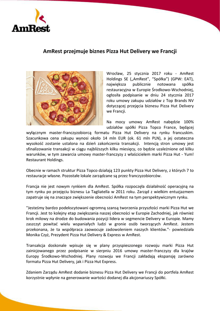 AmRest przejmuje biznes Pizza Hut Delivery we Francji Wrocław, 25 stycznia 2017 roku - AmRest Holdings SE („AmRest”, “Spółka”) (GPW: EAT), największa publicznie notowana spółka restauracyjna w Europie Środkowo-Wschodniej, ogłosiła podpisanie w dniu 24 stycznia 2017 roku umowy zakupu udziałów z Top Brands NV dotyczącej przejęcia biznesu Pizza Hut Delivery we Francji. Na mocy umowy AmRest nabędzie 100% udziałów spółki Pizza Topco France, będącej wyłącznym master-franczyzobiorcą formatu Pizza Hut Delivery na rynku francuskim. Szacunkowa cena zakupu wynosi około 14 mln EUR (ok. 61 mln PLN), a jej ostateczna wysokość zostanie ustalona na dzień zakończenia transakcji. Intencją stron umowy jest sfinalizowanie transakcji w ciągu najbliższych kilku miesięcy, co będzie uzależnione od kilku warunków, w tym zawarcia umowy master-franczyzy z właścicielem marki Pizza Hut - Yum! Restaurant Holdings. Obecnie w ramach struktur Pizza Topco działają 123 punkty Pizza Hut Delivery, z których 7 to restauracje własne. Pozostałe lokale zarządzane są przez franczyzobiorców. Francja nie jest nowym rynkiem dla AmRest. Spółka rozpoczęła działalność operacyjną na tym rynku po przejęciu biznesu La Tagliatella w 2011 roku. Zarząd z wielkim entuzjazmem zapatruje się na znaczące zwiększenie obecności AmRest na tym perspektywicznym rynku. "Jesteśmy bardzo podekscytowani ogromną szansą tworzenia przyszłości marki Pizza Hut we Francji. Jest to kolejny etap zwiększania naszej obecności w Europie Zachodniej, jak również krok milowy na drodze do budowania pozycji lidera w segmencie Delivery w Europie. Mamy zaszczyt powitać wielu wspaniałych ludzi w gronie osób tworzących AmRest. Jestem przekonana, że ta współpraca zaowocuje zadowoleniem naszych klientów."- powiedziała Monika Czyż, Prezydent Pizza Hut Delivery & Express w AmRest. Transakcja doskonale wpisuje się w plany przyspieszonego rozwoju marki Pizza Hut zainicjowanego przez podpisanie w sierpniu 2016 umowy master-franczyzy dla krajów Europy Środkowo-Wschodniej. Plany rozwoju we Francji zakładają ekspansję zarówno formatu Pizza Hut Delivery, jak i Pizza Hut Express. Zdaniem Zarządu AmRest dodanie biznesu Pizza Hut Delivery we Francji do portfela AmRest korzystnie wpłynie na generowanie wartości dodanej dla akcjonariuszy Spółki. W celu uzyskania dodatkowych informacji prosimy o kontakt: Dorota Surowiec IR Manager +48 71 386 1235 [email protected]
