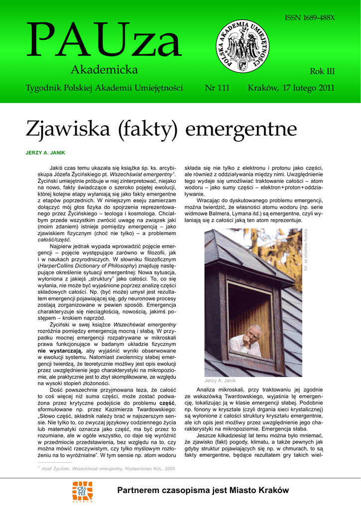 PAUza ISSN 1689-488X Akademicka Tygodnik Polskiej Akademii Umiejętności Rok III Nr 111 Kraków, 17 lutego 2011 Zjawiska (fakty) emergentne JERZY A. JANIK 1 składa się nie tylko z elektronu i protonu jako części, ale również z oddziaływania między nimi. Uwzględnienie tego wydaje się umożliwiać traktowanie całości – atom wodoru – jako sumy części – elektron+proton+oddziaływanie. Wracając do dyskutowanego problemu emergencji, można twierdzić, że własności atomu wodoru (np. serie widmowe Balmera, Lymana itd.) są emergentne, czyli wyłaniają się z całości jaką ten atom reprezentuje. fot. ze zbiorów Autora Jakiś czas temu ukazała się książka śp. ks. arcybiskupa Józefa Życińskiego pt. Wszechświat emergentny 1. Życiński umiejętnie próbuje w niej zinterpretować, niejako na nowo, fakty świadczące o szeroko pojętej ewolucji, której kolejne etapy wyłaniają się jako fakty emergentne z etapów poprzednich. W niniejszym eseju zamierzam dołączyć mój głos fizyka do spojrzenia reprezentowanego przez Życińskiego – teologa i kosmologa. Chciałbym przede wszystkim zwrócić uwagę na związek jaki (moim zdaniem) istnieje pomiędzy emergencją – jako zjawiskiem fizycznym (choć nie tylko) – a problemem całość/część. Najpierw jednak wypada wprowadzić pojęcie emergencji – pojęcie występujące zarówno w filozofii, jak i w naukach przyrodniczych. W słowniku filozoficznym (HarperCollins Dictionary of Philosophy) znajduję następujące określenie sytuacji emergentnej: Nowa sytuacja, wyłoniona z jakiejś „struktury” jako całości. To, co się wyłania, nie może być wyjaśnione poprzez analizę części składowych całości. Np. (być może) umysł jest rezultatem emergencji pojawiającej się, gdy neuronowe procesy zostają zorganizowane w pewien sposób. Emergencja charakteryzuje się nieciągłością, nowością, jakimś postępem – krokiem naprzód. Życiński w swej książce Wszechświat emergentny rozróżnia pomiędzy emergencją mocną i słabą. W przypadku mocnej emergencji rozpatrywane w mikroskali prawa funkcjonujące w badanym układzie fizycznym nie wystarczają, aby wyjaśnić wyniki obserwowane w ewolucji systemu. Natomiast zwolennicy słabej emergencji twierdzą, że teoretycznie możliwy jest opis ewolucji przez uwzględnienie jego charakterystyki na mikropoziomie, ale praktycznie jest to zbyt skomplikowane, ze względu na wysoki stopień złożoności. Dość powszechnie przyjmowana teza, że całość to coś więcej niż suma części, może zostać podważona przez krytyczne podejście do problemu część, sformułowane np. przez Kazimierza Twardowskiego: „Słowo część, składnik należy brać w najszerszym sensie. Nie tylko to, co zwyczaj językowy codziennego życia lub matematyki oznacza jako część, ma być przez to rozumiane, ale w ogóle wszystko, co daje się wyróżnić w przedmiocie przedstawienia, bez względu na to, czy można mówić rzeczywistym, czy tylko myślowym rozłożeniu na to wyróżnialne”. W tym sensie np. atom wodoru Jerzy A. Janik Analiza mikroskali, przy traktowaniu jej zgodnie ze wskazówką Twardowskiego, wyjaśnia tę emergencję, lokalizując ją w klasie emergencji słabej. Podobnie np. fonony w krysztale (czyli drgania sieci krystalicznej) są wyłonione z całości struktury kryształu emergentnie, ale ich opis jest możliwy przez uwzględnienie jego charakterystyki na mikropoziomie. Emergencja słaba. Jeszcze kilkadziesiąt lat temu można było mniemać, że zjawisko (fakt) pogody, klimatu, a także pewnych jak gdyby struktur pojawiających się np. w chmurach, to są fakty emergentne, będące rezultatem gry takich wiel Józef Życiński, Wszechświat emergentny, Wydawnictwo KUL, 2009. Partnerem czasopisma jest Miasto Kraków Str. 2 PAUza Akademicka Nr 111, 17 lutego 2011 kości, jak temperatura, ciśnienie, gradienty temperatury itp. – gry niedostępnej jednak dla analizy na mikropoziomie. Dopiero era komputerów umożliwiła dokonywanie rachunków o takim stopniu komplikacji i wtedy okazało się, że analiza na mikropoziomie jest dostępna, czyli to, co wynika z gry toczącej się w atmosferze jest emergencją słabą. Całe to zagadnienie stanowi przedmiot studiów stosunkowo młodego działu nauk przyrodniczych noszącego nazwę teorii chaosu. Zarysuję tutaj jeden z problemów teorii chaosu abstrahując (na razie) od treści fizycznej, a koncentrując się na stronie matematycznej. Weźmy układ równań różniczkowych następujący: x(t) = E [-x(t) + y(t)] • y(t) = Rx(t) – y(t) – x(t)z(t) • z(t) = x(t)y(t) + Fz(t) • W tym układzie równań, kropka nad x, y, z oznacza różniczkowanie po czasie, zaś E, R i F są parametrami, od których wyboru zależy rezultat matematycznej gry, uzyskany jako zależności x(t), y(t), z(t). Interpretując tę matematykę w terminologii całość/część, jestem skłonny uznać za części zmienne x, y, z oraz zawarte w powyższych równaniach relacje pomiędzy tymi zmiennymi. Po rozwiązaniu tych równań i eliminacji czasu otrzymujemy miejsce geometryczne w trójwymiarowej tzw. przestrzeni fazowej w postaci tzw. dziwnego atraktora, którego rzut na płaszczyznę xz (przykładowo dla E=10, F=2.66, R=28) wygląda tak: wiązań (widoczny w geometrii dziwnego atraktora) czyni przewidywalność pogody problematyczną, dla czasu powyżej kilku dni. Wobec rozwoju teorii chaosu dyskutowana tu emergencja pozostaje emergencją słabą. To, co napisałem o emergencji, nie zasługuje właściwie na uważanie emergencji za wyraźnie odrębną grupę zjawisk (faktów). Przykłady, które wymieniłem interpretowane mogą być na gruncie analizy opartej na prawach fizyki rządzących mikropoziomem. W tych przykładach mikropoziom okazał się być dostępny na tyle, że można było skonstruować model, bardziej lub mniej skomplikowany. Przechodząc do przykładów emergencji bardziej tajemniczej, muszę opuś