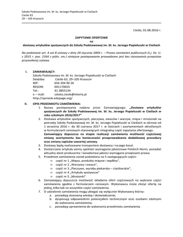 Szkoła Podstawowa im. bł. ks. Jerzego Popiełuszki w Cieślach Cieśle 63 29 – 105 Krasocin Cieśle, 01.08.2016 r. ZAPYTANIE OFERTOWE na dostawy artykułów spożywczych do Szkoły Podstawowej im. bł. ks. Jerzego Popiełuszki w Cieślach Na podstawie art. 4 ust 8 ustawy z dnia 29 stycznia 2004 r. – Prawo zamówień publicznych (t.j. Dz. U. z 2015 r. poz. 2164 z późn. zm.) niniejsze postepowanie prowadzone jest bez stosowania przepisów przywołanej ustawy. I. ZAMAWIAJĄCY: Szkoła Podstawowa im. bł. ks. Jerzego Popiełuszki w Cieślach Siedziba: Cieśle 63, 29–105 Krasocin NIP: 656 204 90 26 REGON: 001170655 Tel.: 41 3855134 e – mail: [email protected] http://spciesle.edupage.org/ II. OPIS PRZEDMIOTU ZAMÓWIENIA: 1. Nazwa postepowania nadana przez Zamawiającego: „Dostawa artykułów spożywczych do Szkoły Podstawowej im. bł. ks. Jerzego Popiełuszki w Cieślach w roku szkolnym 2016/2017” 2. Dostawa artykułów spożywczych, pieczywa, owoców i warzyw, mięsa i mrożonek na potrzeby Szkoły Podstawowej im. bł. ks. Jerzego Popiełuszki w Cieślach w okresie od 1 września 2016 r. do 30 czerwca 2017 r. w ilościach i asortymentach określonych w formularzach cenowych stanowiących integralną część zapytania ofertowego. Zamawiający dopuszcza na etapie realizacji zamówienia możliwość częściowej zmiany asortymentu bez konieczności przeprowadzania dodatkowej procedury oraz zmiany zapisów zawartej umowy. 3. Dostawy będą realizowane transportem dostawcy i na jego koszt. 4. Dostarczane artykuły winny spełniać wymagania jakościowe Polskich Norm, posiadać aktualny atest producenta i świadectwa jakości wymagane przepisami prawa. 5. Przedmiot zamówienia został podzielony na 5 następujących części: • część nr 1 „Mięso, produkty mięsne i wędliny”, • część nr 2 „Warzywa i owoce”, • część nr 3 „Pieczywo, wyroby piekarsko – ciastkarskie”, • część nr 4 „Artykuły spożywcze” • część nr 5 „Mrożonki”. 6. Zamawiający dopuszcza możliwość składania ofert częściowych na wybrane części zamówienia zgodne z formularzem cenowym. Wykonawca może złożyć ofertę na jedną, kilka lub na wszystkie części zamówienia. 7. O udzielenie zamówienia mogą ubiegać się wyłącznie Wykonawcy którzy: a. posiadają stosowną wiedzę i doświadczenie; b. dysponują odpowiednim potencjałem technicznym oraz osobami zdolnymi do wykonania zamówienia; c. posiadają uprawnienia do wykonania przedmiotu zamówienia. III. TERMIN I MIEJSCE WYKONANIA ZAMÓWIENIA: 1. Zamówienia będą realizowane w terminie od dnia 1 września 2016 r. do 30 czerwca 2017 r., sukcesywnie po telefonicznym lub e-mailowym uzgodnieniu dostawy i transportem dostawcy w terminie uzgodnionym podczas składania zamówienia. 2. Miejscem dostawy zamówionych artykułów spożywczych jest Szkoła Podstawowa im. bł. ks. Jerzego Popiełuszki w Cieślach, Cieśle 63. IV. OPIS SPOSOBU PRZYGOTOWANIA OFERTY: 1. Ofertę stanowi wypełniony druk „Formularz cenowy” (załączniki nr 2 a-e) wraz z drukiem „Formularz oferty” (załącznik nr 1). Brak załączonego formularza cenowego będzie podstawą do odrzucenia oferty. Oferenci ubiegający się o dostawy na kilka części winni sporządzić oddzielnie oferty na każdy asortyment towarowy według załączników. 2. W przypadku oferowania innej gramatury opakowań należy cenę za opakowanie przeliczyć na gramaturę wymaganą w formularzu cenowym oraz w kolumnie nr 10 Uwagi wpisać gramaturę proponowanego produktu. 3. Wykonawca może zaproponować produkty innego producenta niż wskazane w formularzu cenowym pod warunkiem, że ich jakość oraz walory smakowe będą takiej samej jakości lub lepsze. W takim przypadku w kolumnie nr 10 Uwagi wpisać nazwę producenta proponowanego produktu. 4. Oferta powinna zawierać: − datę sporządzenia, − zawierać adres lub siedzibę oferenta, nr NIP, nr telefonu, − oświadczenie o spełnianiu warunków udziału w postepowaniu (załącznik nr 4.) Oferta nie odpowiadająca warunkom stawianym przez Zamawiającego nie zostanie rozpatrzona. V. MIEJSCE ORAZ TERMIN SKŁADANIA OFERT: 1. Ofertę należy złożyć do dnia 10 sierpnia 2016 r. do godz. 10:00, osobiście lub za pośrednictwem poczty tradycyjnej w siedzibie Zespołu Obsługi Placówek Oświatowych w Krasocinie ul. Macierzy Szkolnej 1, 29 – 105 Krasocin pokój nr 10 (budynek Urzędu Gminy Krasocin ) 2. Otwarcie ofert nastąpi w dniu 10 sierpnia 2016 r. od godz. 10:15 w siedzibie Zespołu Obsługi Placówek Oświatowych w Krasocinie. 3. Składając ofertę osobiście lub za pośrednictwem poczty tradycyjnej, ofertę należy umieścić w zaklejonej, nieprzezroczystej kopercie i opisać w następujący sposób: Oferta na: „Dostawa artykułów spożywczych do Szkoły Podstawowej im. bł. ks. Jerzego Popiełuszki w Cieślach w roku szkolnym 2016/2017” Część nr : ...........” .......................................................” ( wpisać nr i nazwę części) Nie otwierać wcześniej niż 10 sierpnia 2016 r. przed godz. 10:15. 4. Oferty złożone po terminie nie będą rozpatrywane. 5. Oferent może przed upływem terminu składania ofert zmienić lub wycofać swoją ofertę. VI. INFORMACJE DOTYCZĄCE WYBORU NAJKORZYSTNIEJSZEJ OFERTY 1. W toku badania i oceny ofert Zamawiający może żądać od oferentów wyjaśnień dotyczących treści złożonych ofert. 2. Z oferentami, którzy zaproponują najkorzystniejsze warunki realizacji dostaw zostaną zawarte umowy na dostawy towarów w poszczególnych częściach zamówienia (wzór umowy – załącznik nr 3). 3. O wyborze najkorzystniejszej oferty Zamawiający zawiadomi Oferentów telefonicznie lub za pośrednictwem poczty elektronicznej wyłącznie na ich wniosek. VII. KRYTERIA OCENY OFERT: 1. W niniejszym postępowaniu jedynym kryterium oceny ofert jest CENA. 2. Ofertą najkorzystniejszą będzie oferta spełniająca wszystkie wymagania stawiane prz