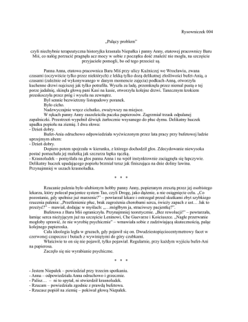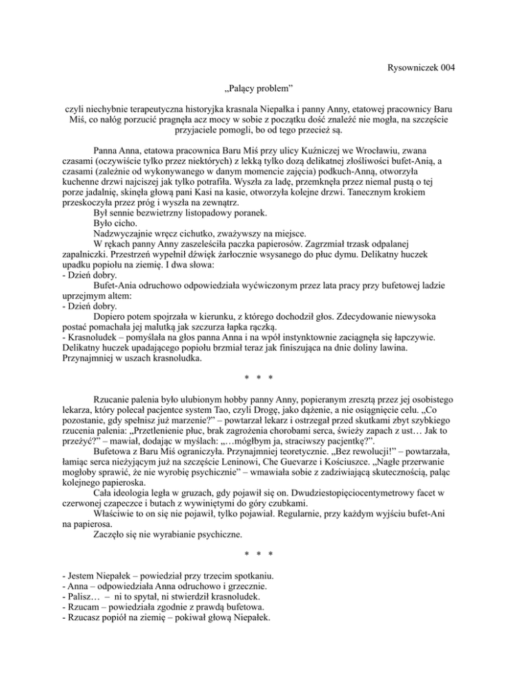 Rysowniczek 004 „Palący problem” czyli niechybnie terapeutyczna historyjka krasnala Niepałka i panny Anny, etatowej pracownicy Baru Miś, co nałóg porzucić pragnęła acz mocy w sobie z początku dość znaleźć nie mogła, na szczęście przyjaciele pomogli, bo od tego przecież są. Panna Anna, etatowa pracownica Baru Miś przy ulicy Kuźniczej we Wrocławiu, zwana czasami (oczywiście tylko przez niektórych) z lekką tylko dozą delikatnej złośliwości bufet-Anią, a czasami (zależnie od wykonywanego w danym momencie zajęcia) podkuch-Anną, otworzyła kuchenne drzwi najciszej jak tylko potrafiła. Wyszła za ladę, przemknęła przez niemal pustą o tej porze jadalnię, skinęła głową pani Kasi na kasie, otworzyła kolejne drzwi. Tanecznym krokiem przeskoczyła przez próg i wyszła na zewnątrz. Był sennie bezwietrzny listopadowy poranek. Było cicho. Nadzwyczajnie wręcz cichutko, zważywszy na miejsce. W rękach panny Anny zaszeleściła paczka papierosów. Zagrzmiał trzask odpalanej zapalniczki. Przestrzeń wypełnił dźwięk żarłocznie wsysanego do płuc dymu. Delikatny huczek upadku popiołu na ziemię. I dwa słowa: - Dzień dobry. Bufet-Ania odruchowo odpowiedziała wyćwiczonym przez lata pracy przy bufetowej ladzie uprzejmym altem: - Dzień dobry. Dopiero potem spojrzała w kierunku, z którego dochodził głos. Zdecydowanie niewysoka postać pomachała jej malutką jak szczurza łapka rączką. - Krasnoludek – pomyślała na głos panna Anna i na wpół instynktownie zaciągnęła się łapczywie. Delikatny huczek upadającego popiołu brzmiał teraz jak finiszująca na dnie doliny lawina. Przynajmniej w uszach krasnoludka. * * * Rzucanie palenia było ulubionym hobby panny Anny, popieranym zresztą przez jej osobistego lekarza, który polecał pacjentce system Tao, czyli Drogę, jako dążenie, a nie osiągnięcie celu. „Co pozostanie, gdy spełnisz już marzenie?” – powtarzał lekarz i ostrzegał przed skutkami zbyt szybkiego rzucenia palenia: „Przetlenienie płuc, brak zagrożenia chorobami serca, świeży zapach z ust… Jak to przeżyć?” – mawiał, dodając w myślach: „…mógłbym ja, straciwszy pacjentkę?”. Bufetowa z Baru Miś ograniczyła. Przynajmniej teoretycznie. „Bez rewolucji!” – powtarzała, łamiąc serca nieżyjącym już na szczęście Leninowi, Che Guevarze i Kościuszce. „Nagłe przerwanie mogłoby sprawić, że nie wyrobię psychicznie” – wmawiała sobie z zadziwiającą skutecznością, paląc kolejnego papieroska. Cała ideologia legła w gruzach, gdy pojawił się on. Dwudziestopięciocentymetrowy facet w czerwonej czapeczce i butach z wywiniętymi do góry czubkami. Właściwie to on się nie pojawił, tylko pojawiał. Regularnie, przy każdym wyjściu bufet-Ani na papierosa. Zaczęło się nie wyrabianie psychiczne. * * * - Jestem Niepałek – powiedział przy trzecim spotkaniu. - Anna – odpowiedziała Anna odruchowo i grzecznie. - Palisz… – ni to spytał, ni stwierdził krasnoludek. - Rzucam – powiedziała zgodnie z prawdą bufetowa. - Rzucasz popiół na ziemię – pokiwał głową Niepałek. Rysowniczek 004 Panna Anna od dziecka nie wierzyła w krasnoludki (nie wspominając już o sierotkach Marysiach). Teraz niemal wessała kolejnego papierosa. Całkiem spora garstka popiołu spadła na chodnik przy ulicy Kuźniczej we Wrocławiu – światowej stolicy krasnoludków. Etatowa pracownica Baru Miś rzucała palenie. * * * - Ten naleśnik jakiś taki wstrząśnięty – z charakterystycznym dla Wrocławia lwowskim zaśpiewem w głosie zwróciła uwagę pani Gabrysia, główna kucharka Baru Miś – Trzęsiesz się czemuś Aneczko? Panna Anna zacisnęła pięści. Nerwowe drgawki przechodziły od łokci do czubków palców. A potem przez patelnię na naleśnik. - Idź sobie zapalić, jak się czymś denerwujesz – powiedziała łagodnie pani Gabrysia – Pewnie czasem trzeba… - Nnniiieee ttttrzebbbba – szczęknęła podkuch-Anna – Rzurzucacam nannna dddobbre… - Hm… – główna kucharka spojrzała na drgający z niemal regularną częstotliwością i amplitudą naleśnik. Obierająca ziemniaki w kącie kuchni pani Agnieszka wymieniła ukradkowe spojrzenia z siedzącą w drugim kącie legendą Baru Miś i całego Wrocławia, muzą poetów z nieżyjącym Andrzejem Waligórskim na czele, Babcią Pimpusiową . - A mmmogggę tutttu zapapppalić? – zapytała nagle panna Anna, niemal dokonując niemal niemożliwej sztuki wychlapania z patelni niemal całkiem usmażonego naleśnika. - Skoro musisz – podniosła brwi pani Gabrysia – Tylko nie kiepuj w cieście. W zupie najwyżej. Skoro naprawdę musisz. - Chccęcęcę… Za szesnastym podejściem udało się zsynchronizować płomień zapalniczki, zaciśnięcie ust, wdech oraz kciuk i palec wskazujący podtrzymujące papierosa. Udało się odpalić. - Na zdrowie – zabrzmiał cichy, ale wyraźny głos spod kuchenki. Kolejny papieros spalił się w ciągu trzech sekund. Płuca podkuch-Anny westchnęły ciężko. Ona sama mrugała jakby chciała unieść się na powiekach. Prawie się udało. - Wiwidzzzzicie gggoo? - Cześć Niepałek – powiedziała pani Agnieszka. - Cześć – skinął krasnal – Słabo idzie, co? - No słabo, słabo. * * * - Ania tyle razy mówiła, że chce rzucić, że jej chciałam pomóc. To miała być taka przyjacielska przysługa. Taki trochę szok – tłumaczyła pani Agnieszka. - Jestem wykwalifikowanym terapeutą uzależnień – krasnal Niepałek popijał lipową herbatę z kwiatu naparstnicy – Ze specjalnością nikotyna i pochodne. W razie potrzeby przebieram się z białe myszki. - Za ile białych myszek? – spytała pani Gabrysia, zawsze i wszędzie praktyczna, konkretna i chętna do konwersacji.. - Za cztery złote myszka – odpowiedział krasnal Niepałek, co najmniej równie praktyczny i konkretny. - Ale za ile myszek? - Za siedem. - Aha. - Myślałam, że to pomoże, że Ania pomyś