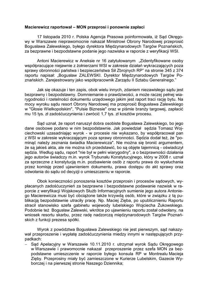 Macierewicz raportował – MON przeprosi i ponownie zapłaci 17 listopada 2010 r. Polska Agencja Prasowa poinformowała, iż Sąd Okręgowy w Warszawie nieprawomocnie nakazał Ministrowi Obrony Narodowej przeprosić Bogusława Zalewskiego, byłego dyrektora Międzynarodowych Targów Poznańskich, za bezprawne i bezpodstawne podanie jego nazwiska w raporcie z weryfikacji WSI. Antoni Macierewicz w Aneksie nr 16 zatytułowanym „Zidentyfikowane osoby współpracujące niejawnie z żołnierzami WSI w zakresie działań wykraczających poza sprawy obronności państwa i bezpieczeństwa Sił Zbrojnych RP” na stronie 345 z 374 raportu napisał: „Bogusław ZALEWSKI. Dyrektor Międzynarodowych Targów Poznańskich. Zarejestrowany jako współpracownik Zarządu II Sztabu Generalnego.” Jak się okazuje i ten zapis, obok wielu innych, zdaniem niezawisłego sądu jest bezprawny i bezpodstawny. Domniemanie o prawdziwości, a może raczej pełnej wiarygodności i rzetelności dokumentu urzędowego jakim jest raport traci rację bytu. Na mocy wyroku sądu resort Obrony Narodowej ma przeprosić Bogusława Zalewskiego w "Głosie Wielkopolskim", "Pulsie Biznesie" oraz w piśmie branży targowej, zapłacić mu 15 tys. zł zadośćuczynienia i zwrócić 1,7 tys. zł kosztów procesu. Sąd uznał, że raport naruszył dobra osobiste Bogusława Zalewskiego, bo jego dane osobowe podano w nim bezpodstawnie. Jak powiedział sędzia Tomasz Wojciechowski uzasadniając wyrok - w procesie nie wykazano, by współpracował pan z WSI w zakresie wykraczającym poza sprawy obronności. Sędzia dodał też, że "pominąć należy zeznania świadka Macierewicza". Nie można się bronić argumentem, że są jakieś akta, ale nie można ich przedstawić, bo są objęte tajemnicą - oświadczył sędzia. Według sądu, raport "nie był w pełni wiarygodny", a o bezprawności działania jego autorów świadczy m.in. wyrok Trybunału Konstytucyjnego, który w 2008 r. uznał za sprzeczne z konstytucją m.in. pozbawienie osób z raportu prawa do wysłuchania przez komisję przed ujawnieniem dokumentu, prawa dostępu do akt sprawy oraz odwołania do sądu od decyzji o umieszczeniu w raporcie. Obok konieczności ponoszenia kosztów przeprosin i procesów sądowych, wypłacanych zadośćuczynień za bezprawne i bezpodstawne podawanie nazwisk w raporcie z weryfikacji Wojskowych Służb Informacyjnych sumienie jego autora Antoniego Macierewicza musi być obciążone także krzywdą osób, które w związku z tą publikacją bezpodstawnie utraciły pracę. Np. Maciej Zięba, po upublicznieniu Raportu stracił stanowisko szefa gabinetu wojewody lubelskiego Wojciecha Żukowskiego. Podobnie też Bogusław Zalewski, wkrótce po ujawnieniu raportu został odwołany, na wniosek resortu skarbu, przez radę nadzorczą międzynarodowych Targów Poznańskich z funkcji prezesa spółki. Wyrok z powództwa Bogusława Zalewskiego nie jest pierwszym, sąd nakazywał przeproszenie i wypłatę zadośćuczynienia miedzy innymi w następujących przypadkach: − Sąd Apelacyjny w Warszawie 10.11.2010 r. utrzymał wyrok Sądu Okręgowego w Warszawie i prawomocnie nakazał przeproszenie przez szefa MON za bezpodstawne umieszczenie w raporcie byłego konsula RP w Montrealu Macieja Zięby. Przeprosiny miały być zamieszczone w Kurierze Lubelskim, Gazecie Wyborczej i na pierwszej stronie Naszego Dziennika; 2 − Wyrokiem Sądu Apelacyjnego w Warszawie z 15 maja 2009 r. Minister Obrony Narodowej miał przeprosić byłego posła Jana SIEŃKO w mediach ogólnopolskich i wpłacić 25 tys. zł na cel społeczny za bezpodstawne umieszczenie nazwiska posła w raporcie; − Warszawski Sąd Okręgowy uznał 22 października 2009 r., że raport naruszył dobra osobiste Piotra Nurowskiego. W raporcie o WSI napisano, że Piotr Nurowski manipulował programem Polsatu, tak jak chciało WSI. Nurowski był wtedy członkiem Rady Nadzorczej Polsatu i prezesem Polskiego Komitetu Olimpijskiego. Warszawski Sąd Okręgowy uznał, że to była nieprawda i że w raporcie naruszono jego dobra osobiste. Minister obrony, który prawnie odpowiada za skutki opublikowania raportu, miał ogłosić przeprosiny na 3 stronie "Rzeczpospolitej"; − Wyrokiem Sądu Okręgowego w Warszawie z 19 marca 2010 r. minister Obrony Narodowej miał przeprosić b. prezesa Nafty Polskiej Andrzeja Maderę za opisanie go w raporcie z weryfikacji Wojskowych Służb Informacyjnych jako ich agenta wykraczającego poza zakres obronności; − Wyrokiem Sądu Apelacyjnego w Warszawie z 8 lipca 2009 r. Minister Obrony Narodowej miał przeprosić Jerzego M. Nowakowskiego i zapłacić mu 30 tys. zł zadośćuczynienia za podanie nieprawdy o nim w raporcie z weryfikacji Wojskowych Służb Informacyjnych. MON miał ponadto zwrócić powodowi 2 tys. zł jego kosztów; − 15 maja 2008 r. PAP podała, iż wyrokiem sądu „Były wiceprezes PKN Orlen Krzysztof Kluzek jest następną osobą, którą MON ma przeprosić za umieszczenie w raporcie z weryfikacji Wojskowych Służb Informacyjnych”; − W czerwcu 2008 r. w wyniku ugody zawartej w procesach sądowych Minister Obrony Narodowej działając w imieniu Skarbu Państwa przeprosił publicznie Pana Jana Wejcherta, Pana Mariusza Waltera i grupę ITI (...) za naruszenie ich dóbr osobistych poprzez zamieszczenie w Raporcie nieuprawnionych, krzywdzących i podważających wiarygodność biznesową informacji o tym, iż Pan Jan Wejchert, Pan Mariusz Walter i grupa ITI (...), współpracowali z wojskowymi służbami PRL i brali udział w plasowaniu agentury wywiadu wojskowego PRL w krajach Zachodniej Europy oraz w finansowaniu takiej agentury. MON wyraził głębokie ubolewanie z powodu zaistniałej sytuacji. Wobec kolejnego przegranego przez MON procesu zasadne wydaje się powtórzenie pytania - dlaczego Minister Obrony Narodowej nie wywrze służbowej presji na bezczynność szefa Służby Kontrwywiadu Wojskowego, który jest ustawowo umocowany do sporządzenia u