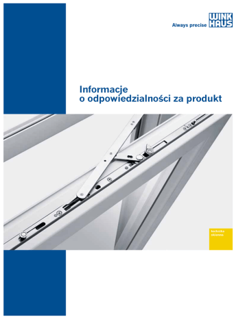 Informacje o odpowiedzialności za produkt technika okienna Winkhaus activPilot Spis treści 3 Nr druku: 03/2016 PL Spis treści Wytyczne dotyczące zabezpieczenia okuć i odpowiedzialności za produkt Strony 5 – 14 Zakresy stosowania różnych typów okuć systemu activPilot Strony 16 – 33 Gwarancja na okucia Winkhaus Strona 34 Winkhaus Polska Beteiligungs · ul. Przemysłowa 1 · PL 64-130 Rydzyna · Tel. +48 65 52 55 700 · Fax +48 65 52 55 800 · www.winkhaus.pl Wytyczne dot. 1 odpowiedzialności za produkt Zakresy stosowania okuć 2 Winkhaus activPilot Wytyczne dotyczące 5 Nr druku: 03/2016 PL zabezpieczenia okuć i odpowiedzialności za produkt Wytyczne dot. 1 odpowiedzialności za produkt 1 Wytyczne dotyczące zabezpieczenia okuć i odpowiedzialności za produkt S. 6 Zabezpieczenie okuć w trakcie prac budowlanych i remontowych S. 7 Informacje o odpowiedzialności za produkt S. 11 Wytyczne RAL – mocowanie elementów nośnych S. 13 Zalecane wymiary profilu w oknach PCW S. 14 Zalecane wymiary profilu w oknach drewnianych Winkhaus Polska Beteiligungs · ul. Przemysłowa 1 · PL 64-130 Rydzyna · Tel. +48 65 52 55 700 · Fax +48 65 52 55 800 · www.winkhaus.pl Zakresy stosowania okuć 2 Winkhaus activPilot Zabezpieczenie okuć w trakcie prac 6 Nr druku: 03/2016 PL budowlanych i remontowych 1 2 Zabezpieczenie okuć w trakcie prac budowlanych i remontowych Ważne wskazówki dla użytkownika Na co należy zwracać uwagę przy pracach tynkarskich witą wymianę powietrza. Jeśli nie jest to możliwe, należy rozstawić Podczas tynkowania budynku z zewnątrz i od wewnątrz należy suszarki kondensacyjne. Także podczas urlopów lub nieobecności uważać, aby okucia nie uległy zabrudzeniu. Tynki gipsowe i ce- w domu należy zapewnić odpowiednie wietrzenie pomieszczeń. mentowe o zasadowym PH w połączeniu z wilgocią uszkadzają W dużych budynkach proponujemy opracowanie planu wietrze- powłokę okuć (szczególnie powłokę cynkową), co może powodo- nia poszczególnych pomieszczeń. wać rdzewienie. Także kurz, który powstaje np. przy szlifowaniu płyt gipsowo-kartonowych, może w połączeniu z wilgocią wywoływać korozję. Ponadto istnieje niebezpieczeństwo, że ucierpi sma- Uwaga na masy uszczelniające na bazie octowej rowanie i działanie okuć, co doprowadzi do ich wcześniejszego Nie wolno stosować mas uszczelniających na bazie kwasu octo- zużycia. Dlatego przed rozpoczęciem prac należy dobrze zabez- wego! Bardzo wiele sylikonów, także tych, które są zalecane przez pieczyć okna. producentów do montażu okien – w połączeniu z ciepłem i wilgocią działa bardzo agresywnie na powierzchnie. Ważne jest, aby Jeśli mimo właściwego zabezpieczenia dojdzie do zabrudzenia, przy obróbce nie stosować żadnych mas uszczelniających na ba- należy możliwie najszybciej umyć okna wodą. Nie wolno stosować zie octowej (środki octanowe, z kwasem octowym czy acetokso- agresywnych środków czyszczących (np. z zawartością octu lub we). Należy stosować neutralne masy uszczelniające (oksymowe, innych kwaśnych substancji) ani środków rysujących powierzch- benzamidowe i alkoksowe). nie. Zaleca się stosowanie wyłącznie środków czyszczących o neutralnym pH w stanie rozcieńczonym. Masy na bazie octowej reagują z wilgocią zawartą w powietrzu i wytrącają kwas octowy. Kwas osiada na okuciu i atakuje powłokę cynkową. Masa uszczelniająca nie powinna mieć bezpośredniego Jak zapobiegać skraplaniu pary wodnej w budynku podczas budowy/remontu kontaktu z okuciem. Aby uniknąć powstawania skroplin na oknach i okuciach, należy Jak rozróżnić masy uszczelniające wg wskazówek na opakowa- odpowiednio wietrzyć pomieszczenia. Niewystarczające wietrze- niu: nie jest jedną z głównych przyczyn uszkodzeń okien i budynków. - odpowiednie masy uszczelniające wykazują przyczepność do W fazie budowy należy zapewnić regularne wietrzenie, aby unik- stali, stali szlachetnej, ocynkowanej, aluminium itd. bez podkła- nąć nadmiernej wilgotności w pomieszczeniach. W przypadku du; niedostatecznej wymiany powietrza w dłuższym okresie czasu - niewłaściwe masy uszczelniające wykazują przyczepność do wewnątrz pomieszczenia i we wrębie skrzydła dochodzi do kon- szkła i powierzchni szklanych oraz do aluminium bez podkładu. densacji pary wodnej. Brak informacji o przyczepności do stali ocynkowanej. Woda zawiera CO2 i minerały w formie soli, które w kontakcie z cynkiem tworzą węglanową powłokę, chroniącą przed korozją. W wątpliwych wypadkach można zorientować się, czy dany śro- Woda kondensacyjna natomiast nie zawiera tych soli – w reakcji dek nadaje się do montażu okien, po zapachu. Odpowiednie masy ze skroplinami nie tworzy się powłoka ochronna i na powierzchni uszczelniające w większości przypadków nie posiadają zapachu okucia powstaje tzw. biała rdza. lub pachną lekko słodkawo. Masy uszczelniające nie nadające się W związku z tym podczas budowy lub remontu wymagane jest do okien mają silny kwasowy (octowy) zapach. codzienne kilkakrotne wietrzenie pomieszczeń przez otwarcie wszystkich okien na ok. 15 min. Takie wietrzenie zapewnia całko- Winkhaus Polska Beteiligungs · ul. Przemysłowa 1 · PL 64-130 Rydzyna · Tel. +48 65 52 55 700 · Fax +48 65 52 55 800 · www.winkhaus.pl Winkhaus activPilot Informacje 7 Nr druku: 03/2016 PL o odpowiedzialności za produkt Wytyczne dot. 1 odpowiedzialności za produkt Dreh- und 2 Drehkippbeschläge Informacje o odpowiedzialności za produkt W myśl Ustawy o odpowiedzialności za produkt (Produkthaf- 1.3 Ograniczenia w użytkowaniu okuć tungsgesetz) stosowanie się do poniższych zaleceń dotyczących W położeniu otwartym okna i drzwi balkonowe spełniają jedynie okuć uchylno-rozwieranych do okien i drzwi balkonowych jest funkcję osłaniającą, nie zachowując parametrów szczelności na warunkiem ewentualnych roszczeń wobec wytwórcy w przypadku wodę opadową 