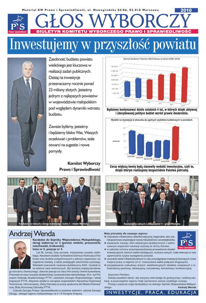 M a t e r i a ł K W P r a w o i S p r a w i e d l i w o ś ć , u l . N o w o g r o d z k a 8 4 / 8 6 , 0 2 - 0 1 8 Wa r s z a w a Inwestujemy w przyszłość powiatu Zasobność budżetu powiatu wielickiego jest kluczowa w realizacji zadań publicznych. Dzisiaj na inwestycje przeznaczamy rocznie ponad 23 miliony złotych. Jesteśmy jednym z najlepszych powiatów w województwie małopolskim pod względem dynamiki wzrostu budżetu. Będziemy kontynuować dzieło ostatnich 4 lat, w których dzięki aktywnej i zdecydowanej polityce budżet wzrósł prawie dwukrotnie. Wydatki na inwestycje w stosunku do ogólnych wydatków budżetowych w powiatach. Zawsze byliśmy, jesteśmy i będziemy blisko Was, Waszych oczekiwań i problemów, stale otwarci na sugestie i nowe pomysły. Komitet Wyborczy Prawo i Sprawiedliwość Kandydaci na radnych z okręgu wyborczego numer 3 – miasto Wieliczka. Andrzej Wenda Kandydat do Sejmiku Województwa Małopolskiego, okręg wyborczy nr 2 (powiat wielicki, proszowicki, miechowski, krakowski). Lista nr 5, pozycja nr 4. Lat 58, żonaty, trzej synowie, mieszkaniec powiatu wielickiego. Absolwent studiów na Akademii Górniczo-Hutniczej w Krakowie oraz studiów podyplomowych z zakresu organizacji i zarządzania oświatą, a także pedagogiki szkolnictwa wyższego. Wieloletni pracownik naukowo-dydaktyczny AGH. Uzyskał tytuł doktora nauk technicznych. Był doradcą międzynarodowego koncernu chemicznego, obecnie pracuje na rzecz firm branży chemii budowlanej. Pracował na rzecz turystyki akademickiej i przewodnictwa tatrzańskiego. M.in. był Prezesem Oddziału Akademickiego PTTK, członkiem Zarządu Wojewódzkiego i władz krajowych PTTK. Aktywnie działał w zarządzie wojewódzkim Naczelnej Organizacji Technicznej. Uhonorowany „Złotą Odznaką za pracę społeczną dla Miasta Krakowa” oraz Złotą Honorową Odznaką PTTK. Członek Zarządu Prawa i Sprawiedliwości w powiecie wielickim, członek Zarządu Okręgu, delegat regionu małopolskiego na II i III Kongres Krajowy. Coraz większą kwotę będą stanowiły wydatki inwestycyjne, czyli te, dzięki którym realizujemy bezpośrednio Państwa potrzeby. Kandydaci na radnych z okręgu numer 4 – gmina Wieliczka Moje priorytety dla naszego regionu: O rozbudowa infrastruktury teleinformatycznej (regionalna sieć szerokopasmowa) wspierająca rozwój mieszkańców i przedsiębiorstw, O wspieranie rozwoju ofert edukacyjno-dydaktycznych z jednoczesnym wsparciem edukacji wyższej ze strony biznesu, O w zakresie ochrony przeciwpowodziowej prowadzenie działań inwestycyjnych (remont wałów istniejących, budowa nowych, mała retencja) w celu ograniczenia ryzyka wystąpienia powodzi, O usuwanie barier infrastrukturalnych w celu przyciągnięcia inwestycji tworzących nowe miejsca pracy w regionie (m.in. nowoczesna siatka połączeń drogowych), O przyspieszenie rozbudowy dużych, wielofunkcyjnych obiektów związanych z infrastrukturą sportową, rekreacyjną, rozrywkową, koncertową i konferencyjną. Szanowni Państwo, Dołożę wszelkich starań, aby wszyscy mieli dostęp do godnej pracy i solidnej edukacji, a poszczególne regiony miały wyrównane szanse szybkiego rozwoju. Proszę o poparcie mojej kandydatury na radnego Sejmiku Województwa Małopolskiego Andrzej Wenda INWESTYCJE, PRACA, EDUKACJA M a t e r i a ł K W P r a w o i S p r a w i e d l i w o ś ć , u l . N o w o g r o d z k a 8 4 / 8 6 , 0 2 - 0 1 8 Wa r s z a w a Kandydaci do Rady Powiatu Wielickiego okręg wyborczy nr 3 1 Juszkiewicz Jacek Franciszek Wieliczanin, 40 lat, politolog. W latach 1997-2006 dyrektor Miejskiego Domu Kultury w Wieliczce. W 2006 roku prezes Fundacji Zamek Królewski w Niepołomicach, a następnie pełnomocnik burmistrza Niepołomic ds. Alokacji Zasobów Muzeum Narodowego w Krakowie. Pełnił jednocześnie funkcję prezesa Fundacji Rozwoju Miasta i Gminy Wieliczka. Od listopada 2006 roku starosta wielicki. Był radnym powiatu wielickiego II kadencji. Przewodniczył Komisji Bezpieczeństwa i Porządku Publicznego w Radzie Powiatu, był także członkiem Komisji Oświaty, Kultury, Sportu i Turystyki. Radny powiatu wielickiego III kadencji, przewodniczący Komisji Bezpieczeństwa i Praworządności, członek Komisji Budżetu i Mienia. Reprezentuje powiat wielicki w Komisji Wspólnej Samorządów Terytorialnych i Gospodarczych Małopolski. Szanowni Państwo, podobnie jak przed wyborami samorządowymi w 2006 roku, tak i tym razem zwracam się do Państwa o poparcie mojej kandydatury do Rady Powiatu Wielickiego. Prosiłem wówczas o zaufanie i otrzymałem je w postaci największej liczby głosów, jaką mogli poszczycić się radni. Dzięki nim zostałem starostą. Dziękuję za to wielkie wyróżnienie. Dzisiaj zwracam się do Państwa z pozycji starosty i proszę o głos poparcia. Wszystkie moje działania były widoczne „gołym okiem”. Jestem przekonany, że nie był to czas stracony. Wystarczyły cztery lata, aby powiat wielicki nabrał dynamiki rozwoju i by można było zrealizować cele, których przez osiem lat nie udało się osiągnąć wcześniejszym jego władzom. Kadencja 2006-2010, według opinii wielu osób, okazała się najlepszą w dotychczasowej historii powiatu. Jako starosta dołożyłem wszelkich starań, żeby powiat był blisko mieszkańców. Jestem przekonany, że spełniłem pokładane we mnie nadzieje i wykorzystałem każdą szansę dla dobra powiatu. Bądźcie Państwo ze mną 21 listopada. Koszyk Roman Tadeusz 2 Lat 49, wdowiec, troje dzieci, mieszkaniec osiedla Bogucice, prywatny przedsiębiorca. Od 21 lat prowadzi własną działalność gospodarczą, budowlaną, która również służy miastu. Od 7 lat Starszy Powiatowego Cechu Rzemieślników i Przedsiębiorców w Wieliczce. Inicjator powstania przy Cechu Centrum Dokształcania i Doskonalenia Zawodowego, które aktywnie współpracuje ze wszystkimi zawodowymi szkołami ponadgimnazjalnymi, działającymi na terenie powiatu wielickiego oraz Powi