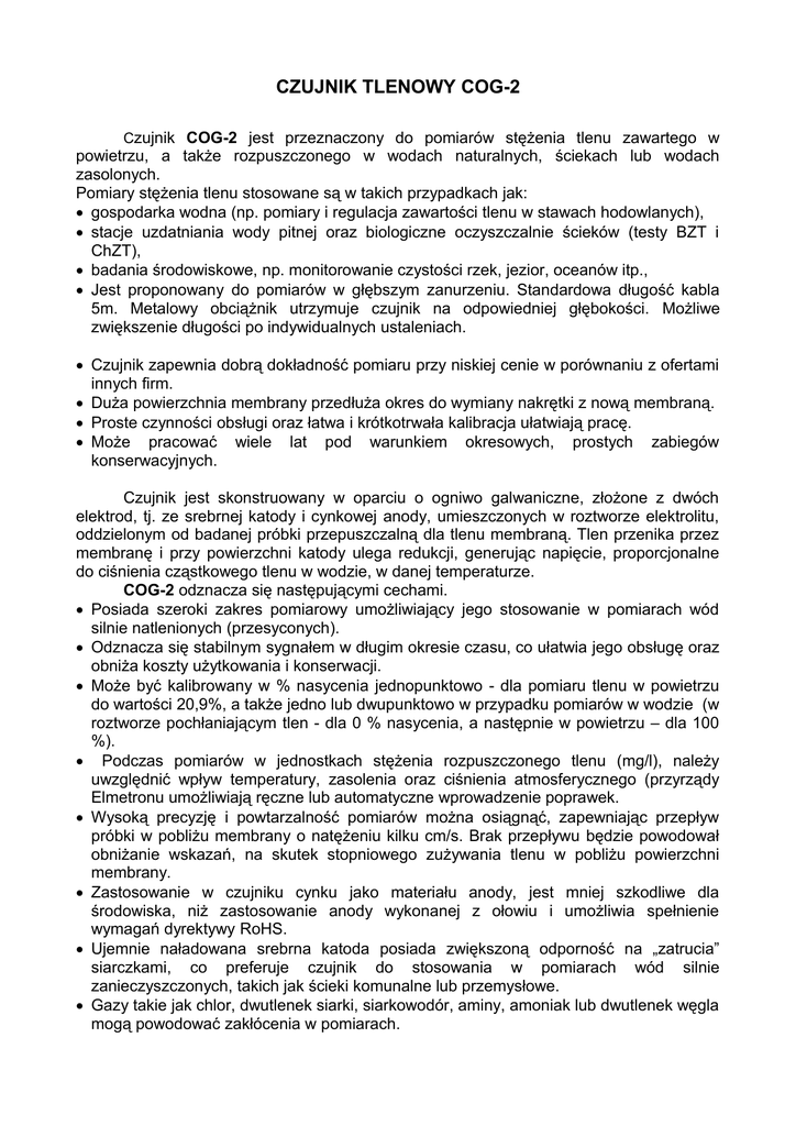 CZUJNIK TLENOWY COG-2 Czujnik COG-2 jest przeznaczony do pomiarów stężenia tlenu zawartego w powietrzu, a także rozpuszczonego w wodach naturalnych, ściekach lub wodach zasolonych. Pomiary stężenia tlenu stosowane są w takich przypadkach jak: gospodarka wodna (np. pomiary i regulacja zawartości tlenu w stawach hodowlanych), stacje uzdatniania wody pitnej oraz biologiczne oczyszczalnie ścieków (testy BZT i ChZT), badania środowiskowe, np. monitorowanie czystości rzek, jezior, oceanów itp., Jest proponowany do pomiarów w głębszym zanurzeniu. Standardowa długość kabla 5m. Metalowy obciążnik utrzymuje czujnik na odpowiedniej głębokości. Możliwe zwiększenie długości po indywidualnych ustaleniach. Czujnik zapewnia dobrą dokładność pomiaru przy niskiej cenie w porównaniu z ofertami innych firm. Duża powierzchnia membrany przedłuża okres do wymiany nakrętki z nową membraną. Proste czynności obsługi oraz łatwa i krótkotrwała kalibracja ułatwiają pracę. Może pracować wiele lat pod warunkiem okresowych, prostych zabiegów konserwacyjnych. Czujnik jest skonstruowany w oparciu o ogniwo galwaniczne, złożone z dwóch elektrod, tj. ze srebrnej katody i cynkowej anody, umieszczonych w roztworze elektrolitu, oddzielonym od badanej próbki przepuszczalną dla tlenu membraną. Tlen przenika przez membranę i przy powierzchni katody ulega redukcji, generując napięcie, proporcjonalne do ciśnienia cząstkowego tlenu w wodzie, w danej temperaturze. COG-2 odznacza się następującymi cechami. Posiada szeroki zakres pomiarowy umożliwiający jego stosowanie w pomiarach wód silnie natlenionych (przesyconych). Odznacza się stabilnym sygnałem w długim okresie czasu, co ułatwia jego obsługę oraz obniża koszty użytkowania i konserwacji. Może być kalibrowany w % nasycenia jednopunktowo - dla pomiaru tlenu w powietrzu do wartości 20,9%, a także jedno lub dwupunktowo w przypadku pomiarów w wodzie (w roztworze pochłaniającym tlen - dla 0 % nasycenia, a następnie w powietrzu – dla 100 %). Podczas pomiarów w jednostkach stężenia rozpuszczonego tlenu (mg/l), należy uwzględnić wpływ temperatury, zasolenia oraz ciśnienia atmosferycznego (przyrządy Elmetronu umożliwiają ręczne lub automatyczne wprowadzenie poprawek. Wysoką precyzję i powtarzalność pomiarów można osiągnąć, zapewniając przepływ próbki w pobliżu membrany o natężeniu kilku cm/s. Brak przepływu będzie powodował obniżanie wskazań, na skutek stopniowego zużywania tlenu w pobliżu powierzchni membrany. Zastosowanie w czujniku cynku jako materiału anody, jest mniej szkodliwe dla środowiska, niż zastosowanie anody wykonanej z ołowiu i umożliwia spełnienie wymagań dyrektywy RoHS. Ujemnie naładowana srebrna katoda posiada zwiększoną odporność na „zatrucia” siarczkami, co preferuje czujnik do stosowania w pomiarach wód silnie zanieczyszczonych, takich jak ścieki komunalne lub przemysłowe. Gazy takie jak chlor, dwutlenek siarki, siarkowodór, aminy, amoniak lub dwutlenek węgla mogą powodować zakłócenia w pomiarach. Czujnik posiada membranę z folii teflonowej, o znakomitej odporności chemicznej, wysokiej selektywności oraz dobrej przepuszczalności tlenu. Membrana osadzona jest w wygodnej do wymiany nakrętce. COG-2 posiada wewnętrzną kompensację temperaturowej zależności przepuszczalności membrany. Czujnik posiada wbudowany rezystor termiczny (Pt-1000) dla zewnętrznej kompensacji temperatury i nie wymaga współpracy z dodatkowym czujnikiem temperatury. Czujnik przystosowany jest do współpracy z przyrządami pomiarowymi firmy Elmetron. Dane techniczne Zakres pomiarowy Dokładność Zakres temperatur stosowania Zakres kompensacji temperatury Sygnał dla 100 % nasycenia O2 Sygnał dla 0 % nasycenia O2 Dryft sygnału Czas reakcji t90 Kompensacja wewnętrzna Wbudowany czujnik temperatury Materiał katody Materiał anody Materiał membrany Materiał korpusu i nasadki membranowej Elektrolit wewnętrzny Długość korpusu (do oprawki) Średnica korpusu Długość przewodu Wtyczka 0 ÷ 100% -tlen w powietrzu 0.÷.60 mg/l (0.÷.600 %) tlen w wodzie ± 0,1 mg/l (± 1 %) 0...40ºC 0...40ºC 20...25 mV maksymalnie 0,3 mV 1 %/24 godziny poniżej 1 minuty tak (termistor) tak (Pt-1000) srebro cynk folia teflonowa PCW KCl 0,5 mol/l 119 ± 5 mm 18,0 ± 0,5 mm 5m BNC Chinch (RCA) temperatura Nakrętka z membraną Czujnik COG-2 41-814 ZABRZE ul. W. Witosa 10 tel. 32 273 81 06, fax 32 273 81 14 [email protected] www.elmetron.com.pl