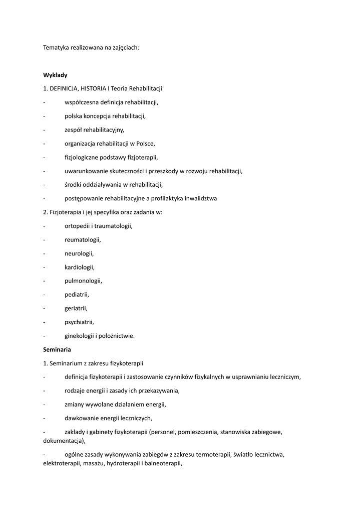 Tematyka realizowana na zajęciach: Wykłady 1. DEFINICJA, HISTORIA I Teoria Rehabilitacji - współczesna definicja rehabilitacji, - polska koncepcja rehabilitacji, - zespół rehabilitacyjny, - organizacja rehabilitacji w Polsce, - fizjologiczne podstawy fizjoterapii, - uwarunkowanie skuteczności i przeszkody w rozwoju rehabilitacji, - środki oddziaływania w rehabilitacji, - postępowanie rehabilitacyjne a profilaktyka inwalidztwa 2. Fizjoterapia i jej specyfika oraz zadania w: - ortopedii i traumatologii, - reumatologii, - neurologii, - kardiologii, - pulmonologii, - pediatrii, - geriatrii, - psychiatrii, - ginekologii i położnictwie. Seminaria 1. Seminarium z zakresu fizykoterapii - definicja fizykoterapii i zastosowanie czynników fizykalnych w usprawnianiu leczniczym, - rodzaje energii i zasady ich przekazywania, - zmiany wywołane działaniem energii, - dawkowanie energii leczniczych, zakłady i gabinety fizykoterapii (personel, pomieszczenia, stanowiska zabiegowe, dokumentacja), ogólne zasady wykonywania zabiegów z zakresu termoterapii, światło lecznictwa, elektroterapii, masażu, hydroterapii i balneoterapii, - ocena mechanizmów i wyników leczenia 2. Seminarium z zakresu fizjoterapii w chorobach wewnętrznych- fizjoterapia u osób z chorobami układu oddechowego badania czynnościowe układu oddechowego (badanie spirometryczne, spirograficzne, gazometryczne krwi tętniczej), - postacie upośledzenia wentylacji płuc, metody rehabilitacji w chorobach układu oddechowego (leczenie ułożeniowe, nauka efektywnego oddychania i kaszlu, kinezyterapia oddechowa), zasady usprawniania chorych z: wysiękowym zapaleniem opłucnej i płuc, z rozedmą płuc, rozstrzeniami oskrzeli, z dychawicą oskrzelową, - usprawnianie chorych po zabiegach operacyjnych na klatce piersiowej Ćwiczenia 1. Ćwiczenia z zakresu ortopedii, traumatologii i reumoortopedii: ocena sprawności układu ruchu w warunkach statycznych i dynamicznych w zakresie niezbędnym do kierowania i prowadzenia procesu fizjoterapii, programowanie optymalnego postępowania fizjoterapeutycznego w korelacji z wynikami badania przedmiotowego, zabiegi ortopedyczne pomocnicze w ortopedii, traumatologii i reumatologii - wyciągi, redresje, opatrunki gipsowe, profilaktyka i kompleksowa fizjoterapia następstw unieruchomienia i powikłań okołooperacyjnych, uwarunkowanie fizjoterapii w zależności od metod leczenia chorób i urazów układu ruchu, fizjoterapia osób operowanych z powodu następstw chorób reumatycznych 2. Ćwiczenia z zakresu fizjoterapii w chorobach wewnętrznych- fizjoterapia u osób z chorobami układu krążenia: badanie czynnościowe układu krążenia (p/wskazania i wskazania do badań czynnościowych, rodzaje prób wysiłkowych, warunki bezpieczeństwa prób wysiłkowych, dobór obciążeń i technika przeprowadzania prób wysiłkowych, interpretacja wyników), - zasady prewencji pierwotnej i wtórnej chorób układu krążenia, zasady współczesnego leczenia chorych z: chorobą niedokrwienną serca, nadciśnieniem tętniczym, po zabiegach kardiochirurgicznych 3. Ćwiczenia z zakresu fizjoterapii w chorobach wewnętrznych- fizjoterapia w chorobach naczyń obwodowych i wybranych chorobach metabolicznych ocena wskazań i przeciwwskazań oraz dobór metod fizjoterapeutycznych w usprawnianiu chorych na podstawie wywiadu, badania przedmiotowego oraz badań dodatkowych, Zastosowanie zabiegów fizjoterapeutycznych w prewencji i leczeniu chorób naczyń i wybranych jednostkach metabolicznych w zależności od zaawansowania procesu chorobowego ocena wyrównania cukrzycy pod kątem zaplanowania działań fizjoterapeutycznych. Przygotowanie pacjentów z cukrzycą do kinezyterapii. Wykorzystanie fizjoterapii w prewencji zespołu polimetabolicznego i cukrzycy. Ocena powikłań cukrzycy i ich wpływ na możliwości zastosowania zabiegów fizjoterapeutycznych. 4. . Ćwiczenia z zakresu fizjoterapii u osób z chorobami w obrębie układu nerwowego: - badania czynnościowe w neurologii, zasady postępowania fizjoterapeutycznego u osób ze wzmożonym lub obniżonym napięciem mięśni, warunki doboru skojarzonej terapii p/bólowej (ułożeniowej, farmakologicznej i fizjoterapeutycznej), usprawnianie osób z chorobami przewlekle postępującymi, nauka lokomocji i czynności samoobsługi, oraz dobór zaopatrzenia ortopedycznego w celu zwiększenia funkcjonalnej wydolności chorego.