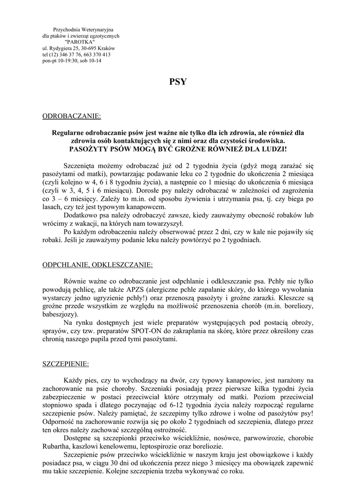 Przychodnia Weterynaryjna dla ptaków i zwierząt egzotycznych "PAROTKA" ul. Rydygiera 25, 30-695 Kraków tel (12) 346 37 76, 663 370 413 pon-pt 10-19:30, sob 10-14 PSY ODROBACZANIE: Regularne odrobaczanie psów jest ważne nie tylko dla ich zdrowia, ale również dla zdrowia osób kontaktujących się z nimi oraz dla czystości środowiska. PASOŻYTY PSÓW MOGĄ BYĆ GROŹNE RÓWNIEŻ DLA LUDZI! Szczenięta możemy odrobaczać już od 2 tygodnia życia (gdyż mogą zarażać się pasożytami od matki), powtarzając podawanie leku co 2 tygodnie do ukończenia 2 miesiąca (czyli kolejno w 4, 6 i 8 tygodniu życia), a następnie co 1 miesiąc do ukończenia 6 miesiąca (czyli w 3, 4, 5 i 6 miesiącu). Dorosłe psy należy odrobaczać w zależności od zagrożenia co 3 – 6 miesięcy. Zależy to m.in. od sposobu żywienia i utrzymania psa, tj. czy biega po lasach, czy też jest typowym kanapowcem. Dodatkowo psa należy odrobaczyć zawsze, kiedy zauważymy obecność robaków lub wrócimy z wakacji, na których nam towarzyszył. Po każdym odrobaczeniu należy obserwować przez 2 dni, czy w kale nie pojawiły się robaki. Jeśli je zauważymy podanie leku należy powtórzyć po 2 tygodniach. ODPCHLANIE, ODKLESZCZANIE: Równie ważne co odrobaczanie jest odpchlanie i odkleszczanie psa. Pchły nie tylko powodują pchlicę, ale także APZS (alergiczne pchle zapalanie skóry, do którego wywołania wystarczy jedno ugryzienie pchły!) oraz przenoszą pasożyty i groźne zarazki. Kleszcze są groźne przede wszystkim ze względu na możliwość przenoszenia chorób (m.in. boreliozy, babeszjozy). Na rynku dostępnych jest wiele preparatów występujących pod postacią obroży, sprayów, czy tzw. preparatów SPOT-ON do zakraplania na skórę, które przez określony czas chronią naszego pupila przed tymi pasożytami. SZCZEPIENIE: Każdy pies, czy to wychodzący na dwór, czy typowy kanapowiec, jest narażony na zachorowanie na psie choroby. Szczeniaki posiadają przez pierwsze kilka tygodni życia zabezpieczenie w postaci przeciwciał które otrzymały od matki. Poziom przeciwciał stopniowo spada i dlatego poczynając od 6-12 tygodnia życia należy rozpocząć regularne szczepienie psów. Należy pamiętać, że szczepimy tylko zdrowe i wolne od pasożytów psy! Odporność na zachorowanie rozwija się po około 2 tygodniach od szczepienia, dlatego przez ten okres należy zachować szczególną ostrożność. Dostępne są szczepionki przeciwko wściekliźnie, nosówce, parwowirozie, chorobie Rubartha, kaszlowi kenelowemu, leptospirozie oraz boreliozie. Szczepienie psów przeciwko wściekliźnie w naszym kraju jest obowiązkowe i każdy posiadacz psa, w ciągu 30 dni od ukończenia przez niego 3 miesięcy ma obowiązek zapewnić mu takie szczepienie. Kolejne szczepienia trzeba wykonywać co roku. Przeciwko boreliozie należy szczepić psy przede wszystkim w rejonach, gdzie ta choroba występuje. Pierwsze szczepienie wykonujemy po ukończeniu przez psa 12 tygodni, powtarzając po 2-3 tygodniach, a następnie co roku. Program podstawowych szczepień należy ustalić z weterynarzem. Zazwyczaj stosuje się jeden z 3 wzorów: 6-7 tydzień Nosówka, parwowiroza Program wczesny Program standardowy Program późny 10-12 tydzień Nosówka, parwowiroza, leptospiroza, wirusowe zapalenie wątroby, kaszel kenelowy 9-10 tydzień Nosówka, parwowiroza, leptospiroza, wirusowe zapalenie wątroby, kaszel kenelowy powyżej 12 tygodnia Nosówka, parwowiroza, leptospiroza, wirusowe zapalenie wątroby, kaszel kenelowy, koronawiroza 16 tydzień Nosówka, parwowiroza, leptospiroza, wirusowe zapalenie wątroby, kaszel kenelowy, koronawiroza 12-14 tydzień Nosówka, parwowiroza, leptospiroza, wirusowe zapalenie wątroby, kaszel kenelowy, koronawiroza po 2-4 tygodniach Nosówka, parwowiroza, leptospiroza, wirusowe zapalenie wątroby, kaszel kenelowy, koronawiroza Szczepienia te należy powtarzać co 1-3 lata. ŻYWIENIE: Wielu ludzi nie zdaje sobie sprawy z potrzeb żywieniowych ich pupili. Wydawać by się mogło, że najlepszym rozwiązaniem jest przygotowywanie posiłków we własnym zakresie, jednak postęp hodowlany, różnorodność ras i osobniczych predyspozycji sprawia, iż odpowiednie zbilansowanie karmy przy użyciu podstawowych środków spożywczych może okazać się niemożliwe. Dlatego zalecamy żywienie psów wyłącznie karmami do tego stworzonymi, koniecznie dobrej jakości, gdyż tanie karmy komercyjne zazwyczaj nie spełniają wszystkich niezbędnych warunków. Wśród zalet stosowania dobrych, gotowych karm wyróżnić można: - odpowiednie dostosowanie do rasy, wieku, stanu fizjologicznego zwierzęcia - poprawa higieny jamy ustnej (ograniczenie powstawania kamienia nazębnego) - ochrona przewodu pokarmowego (prawidłowy przebieg trawienia) - wzmocnienie naturalnej odporności - opóźnienie efektów starzenia - redukcja objętości i zapachu kału - zdrowa skóra i piękna sierść - prawidłowy rozwój kości i stawów
