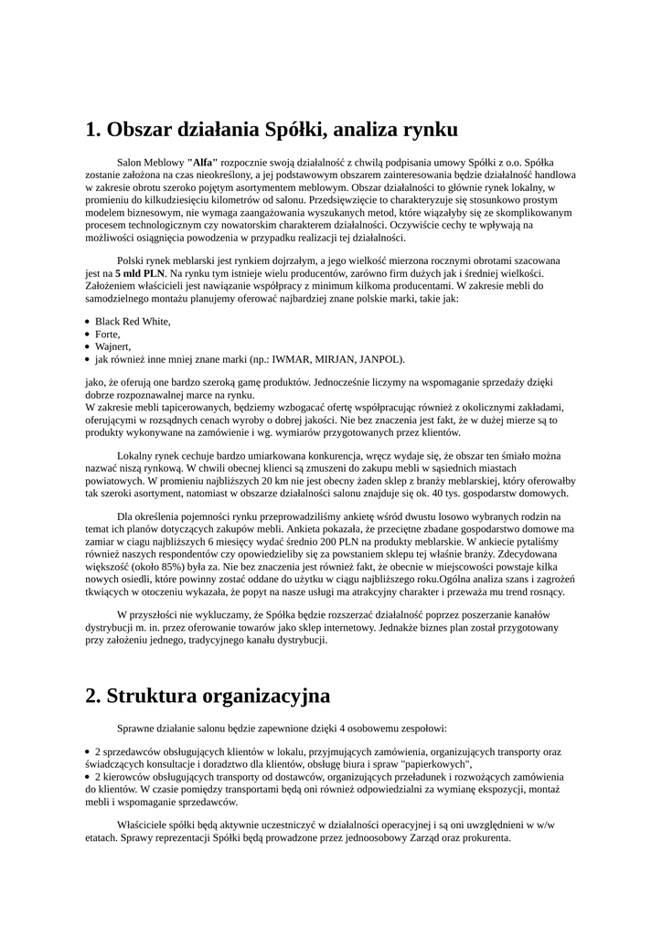 1.ObszardziałaniaSpółki,analizarynku SalonMeblowy"Alfa"rozpocznieswojądziałalnośćzchwiląpodpisaniaumowySpółkizo.o.Spółka zostaniezałożonanaczasnieokreślony,ajejpodstawowymobszaremzainteresowaniabędziedziałalnośćhandlowa wzakresieobrotuszerokopojętymasortymentemmeblowym.Obszardziałalnościtogłównieryneklokalny,w promieniudokilkudziesięciukilometrówodsalonu.Przedsięwzięcietocharakteryzujesięstosunkowoprostym modelembiznesowym,niewymagazaangażowaniawyszukanychmetod,którewiązałybysięzeskomplikowanym procesemtechnologicznymczynowatorskimcharakteremdziałalności.Oczywiściecechytewpływająna możliwościosiągnięciapowodzeniawprzypadkurealizacjitejdziałalności. Polskirynekmeblarskijestrynkiemdojrzałym,ajegowielkośćmierzonarocznymiobrotamiszacowana jestna5mldPLN.Narynkutymistniejewieluproducentów,zarównofirmdużychjakiśredniejwielkości. Założeniemwłaścicielijestnawiązaniewspółpracyzminimumkilkomaproducentami.Wzakresiemeblido samodzielnegomontażuplanujemyoferowaćnajbardziejznanepolskiemarki,takiejak: BlackRedWhite, Forte, Wajnert, jakrównieżinnemniejznanemarki(np.:IWMAR,MIRJAN,JANPOL). jako,żeoferująonebardzoszerokągamęproduktów.Jednocześnieliczymynawspomaganiesprzedażydzięki dobrzerozpoznawalnejmarcenarynku. Wzakresiemeblitapicerowanych,będziemywzbogacaćofertęwspółpracującrównieżzokolicznymizakładami, oferującymiwrozsądnychcenachwyrobyodobrejjakości.Niebezznaczeniajestfakt,żewdużejmierzesąto produktywykonywanenazamówienieiwg.wymiarówprzygotowanychprzezklientów. Lokalnyrynekcechujebardzoumiarkowanakonkurencja,wręczwydajesię,żeobszartenśmiałomożna nazwaćnisząrynkową.Wchwiliobecnejkliencisązmuszenidozakupumebliwsąsiednichmiastach powiatowych.Wpromieniunajbliższych20kmniejestobecnyżadensklepzbranżymeblarskiej,któryoferowałby takszerokiasortyment,natomiastwobszarzedziałalnościsalonuznajdujesięok.40tys.gospodarstwdomowych. Dlaokreśleniapojemnościrynkuprzeprowadziliśmyankietęwśróddwustulosowowybranychrodzinna tematichplanówdotyczącychzakupówmebli.Ankietapokazała,żeprzeciętnezbadanegospodarstwodomowema zamiarwciagunajbliższych6miesięcywydaćśrednio200PLNnaproduktymeblarskie.Wankieciepytaliśmy równieżnaszychrespondentówczyopowiedzielibysięzapowstaniemskleputejwłaśniebranży.Zdecydowana większość(około85%)byłaza.Niebezznaczeniajestrównieżfakt,żeobecniewmiejscowościpowstajekilka nowychosiedli,którepowinnyzostaćoddanedoużytkuwciągunajbliższegoroku.Ogólnaanalizaszansizagrożeń tkwiącychwotoczeniuwykazała,żepopytnanaszeusługimaatrakcyjnycharakteriprzeważamutrendrosnący. Wprzyszłościniewykluczamy,żeSpółkabędzierozszerzaćdziałalnośćpoprzezposzerzaniekanałów dystrybucjim.in.przezoferowanietowarówjakosklepinternetowy.Jednakżebiznesplanzostałprzygotowany przyzałożeniujednego,tradycyjnegokanałudystrybucji. 2.Strukturaorganizacyjna Sprawnedziałaniesalonubędziezapewnionedzięki4osobowemuzespołowi: 2sprzedawcówobsługującychklientówwlokalu,przyjmującychzamówienia,organizującychtransportyoraz świadczącychkonsultacjeidoradztwodlaklientów,obsługębiuraispraw"papierkowych", 2kierowcówobsługującychtransportyoddostawców,organizującychprzeładunekirozwożącychzamówienia doklientów.Wczasiepomiędzytransportamibędąonirównieżodpowiedzialnizawymianęekspozycji,montaż mebliiwspomaganiesprzedawców. Właścicielespółkibędąaktywnieuczestniczyćwdziałalnościoperacyjnejisąoniuwzględnieniww/w etatach.SprawyreprezentacjiSpółkibędąprowadzoneprzezjednoosobowyZarządorazprokurenta. Wszelkiekwestiewzakresiedziałalnościpomocniczejiniezwiązanebezpośredniozobrotemtowarami będąpodzlecanewyspecjalizowanymusługodawcom.Usługiksięgoweiobsługadokumentacjipracowniczejbędą prowadzoneprzezbiurorachunkowe,odktóregooczekujesięrównieżpodstawowegodoradztwawzakresie podatków. 3.Głównezałożeniadziałalności 3.1.Planmarketingowy Podwalinyplanumarketingowegoprzygotowanowoparciuonajbardziejpopularnąkoncepcjękompozycji marketingowejtzw."4P" Produkt(Product) Podstawowymzałożeniemprzedsiębiorstwajestdystrybucjawyrobówmeblowydobrejjakościprzy zachowaniuatrakcyjnychwarunkówcenowych.Dlategoteżwłaścicielestawiająnawspółpracęzdużymii znanyminarynkuproducentamimeblidosamodzielnegomontażu.Rozwiązanietakiepozwalanadostępdo bardzoszerokiegoasortymentujakrównieżminimalizacjękosztówwobszarzeobsługigwarancyjnejipomocy technicznej.Niebezznaczeniajestteższerokarozpoznawalnośćmarki. Wasortymenciesklepubędąznajdowaćsięmiędzyinnymi(grupyzgodniezprowadzonaanaliząekonomiczną): grupaA-mebletapicerowane,wersalki,kanapy,krzesła,stoły, grupaB-meblepokojowezpłytywiórowej,meblebiurowe, grupaC-meblekuchenne Oferowanytowarwograniczonymzakresiebędziemożnanabyćbezpośrednionamiejscuwsklepie,głównie będzieondostępnynazamówienieipowcześniejszejwpłaciezaliczkiprzywożonyodproducenta.Towarrównież będzierozwożonywłasnymtransportempodadreswskazanyprzezklienta.Spółkabędziedokładaćwszelkich starańabyczasrealizacjidostawyniebyłdłuższyniż3-5dni. Planujesięrównież,żedlazwiększeniaatrakcyjnościobsługi,namiejscubędądostępneofertyfirm zajmującychsięsprzedażąratalną. Cena(Price) Zarównowybórproducentów,miejscadziałalnościjakrównieżprowadzonapolitykafirmymająnauwadze takąorganizacjędziałalnościktórazapewnimaksymalizacjęwskaźnikacena/jakość.Zamierzamycałyczas prowadzićrozmowyhandlowezproducentamicelemuzyskiwaniajaknajlepszychwarunkówhandlowych, jednakżenaszymcelemniejestoferowanienajniższychcen,aosiągnięciepełnejsatysfakcjiklienta. Poanalizierynkuiwstępnychrozmowachzpotencjalnymidostawcami,zakładamyiżmożliwebędzieosiągnięcie marżynasprzedażyodpowiedniowgrupach: grupaA-30% grupaB-25% grupaC-35% Miejscedziałalności(Place) Planowanalokalizacjasalonutobudynekbyłejhalimagazynowejznajdującysięnieopodalcentrummiasta. Podwzględemlokalizacyjnymmiejscetojestbardzoatrakcyjnegdyżznaj