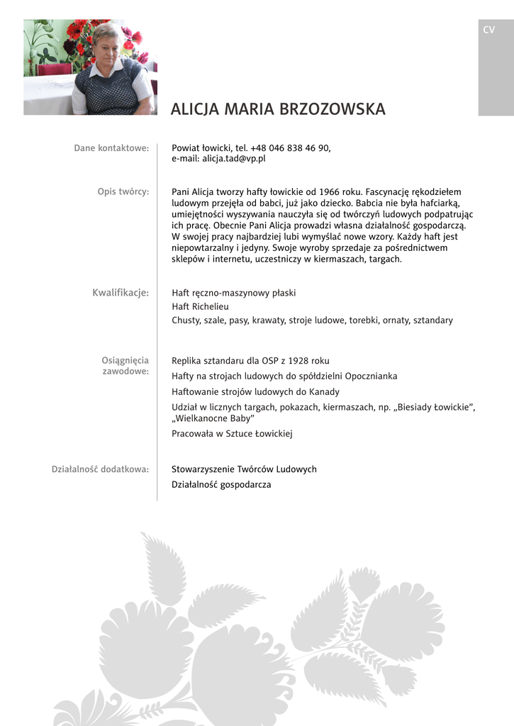 CV ALICJA MARIA BRZOZOWSKA Dane kontaktowe: Opis twórcy: Kwalifikacje: Osi¹gniêcia zawodowe: Powiat ³owicki, tel. +48 046 838 46 90, e-mail: [email protected] Pani Alicja tworzy hafty ³owickie od 1966 roku. Fascynacjê rêkodzie³em ludowym przejê³a od babci, ju¿ jako dziecko. Babcia nie by³a hafciark¹, umiejêtnoœci wyszywania nauczy³a siê od twórczyñ ludowych podpatruj¹c ich pracê. Obecnie Pani Alicja prowadzi w³asna dzia³alnoœæ gospodarcz¹. W swojej pracy najbardziej lubi wymyœlaæ nowe wzory. Ka¿dy haft jest niepowtarzalny i jedyny. Swoje wyroby sprzedaje za poœrednictwem sklepów i internetu, uczestniczy w kiermaszach, targach. Haft rêczno-maszynowy p³aski Haft Richelieu Chusty, szale, pasy, krawaty, stroje ludowe, torebki, ornaty, sztandary Replika sztandaru dla OSP z 1928 roku Hafty na strojach ludowych do spó³dzielni Opocznianka Haftowanie strojów ludowych do Kanady Udzia³ w licznych targach, pokazach, kiermaszach, np. „Biesiady £owickie”, „Wielkanocne Baby” Pracowa³a w Sztuce £owickiej Dzia³alnoœæ dodatkowa: Stowarzyszenie Twórców Ludowych Dzia³alnoœæ gospodarcza