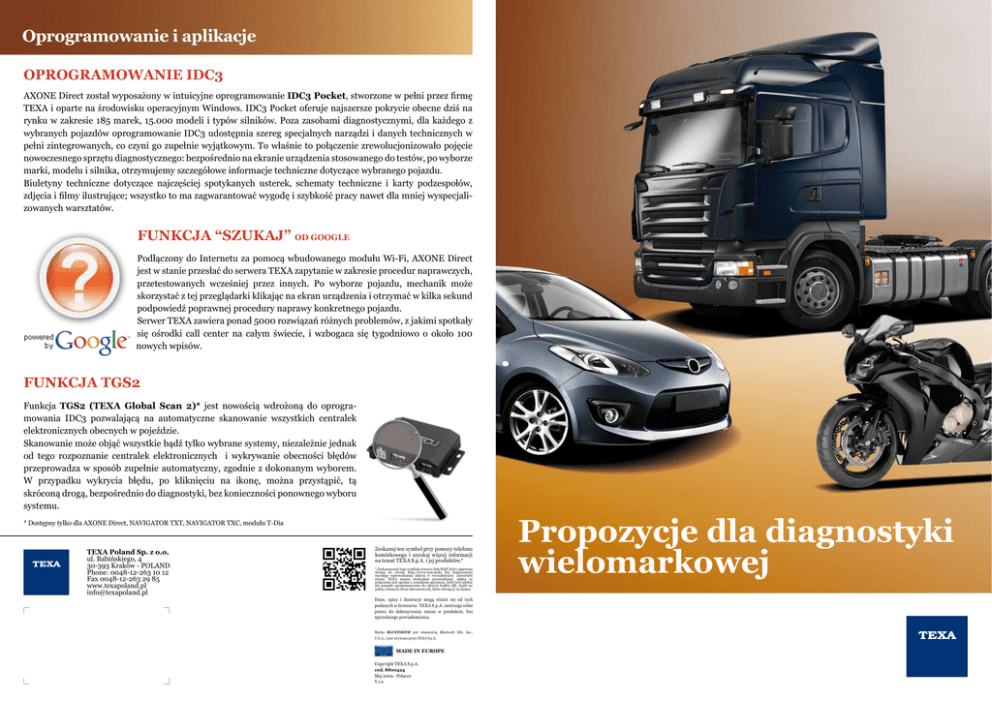 Oprogramowanie i aplikacje OPROGRAMOWANIE IDC3 AXONE Direct został wyposażony w intuicyjne oprogramowanie IDC3 Pocket, stworzone w pełni przez firmę TEXA i oparte na środowisku operacyjnym Windows. IDC3 Pocket oferuje najszersze pokrycie obecne dziś na rynku w zakresie 185 marek, 15.000 modeli i typów silników. Poza zasobami diagnostycznymi, dla każdego z wybranych pojazdów oprogramowanie IDC3 udostępnia szereg specjalnych narządzi i danych technicznych w pełni zintegrowanych, co czyni go zupełnie wyjątkowym. To właśnie to połączenie zrewolucjonizowało pojęcie nowoczesnego sprzętu diagnostycznego: bezpośrednio na ekranie urządzenia stosowanego do testów, po wyborze marki, modelu i silnika, otrzymujemy szczegółowe informacje techniczne dotyczące wybranego pojazdu. Biuletyny techniczne dotyczące najczęściej spotykanych usterek, schematy techniczne i karty podzespołów, zdjęcia i filmy ilustrujące; wszystko to ma zagwarantować wygodę i szybkość pracy nawet dla mniej wyspecjalizowanych warsztatów. FUNKCJA “SZUKAJ” OD GOOGLE Podłączony do Internetu za pomocą wbudowanego modułu Wi-Fi, AXONE Direct jest w stanie przesłać do serwera TEXA zapytanie w zakresie procedur naprawczych, przetestowanych wcześniej przez innych. Po wyborze pojazdu, mechanik może skorzystać z tej przeglądarki klikając na ekran urządzenia i otrzymać w kilka sekund podpowiedź poprawnej procedury naprawy konkretnego pojazdu. Serwer TEXA zawiera ponad 5000 rozwiązań różnych problemów, z jakimi spotkały się ośrodki call center na całym świecie, i wzbogaca się tygodniowo o około 100 nowych wpisów. FUNKCJA TGS2 Funkcja TGS2 (Texa Global Scan 2)* jest nowością wdrożoną do oprogramowania IDC3 pozwalającą na automatyczne skanowanie wszystkich centralek elektronicznych obecnych w pojeździe. Skanowanie może objąć wszystkie bądź tylko wybrane systemy, niezależnie jednak od tego rozpoznanie centralek elektronicznych i wykrywanie obecności błędów przeprowadza w sposób zupełnie automatyczny, zgodnie z dokonanym wyborem. W przypadku wykrycia błędu, po kliknięciu na ikonę, można przystąpić, tą skróconą drogą, bezpośrednio do diagnostyki, bez konieczności ponownego wyboru systemu. * Dostępny tylko dla AXONE Direct, NAVIGATOR TXT, NAVIGATOR TXC, modułu T-Dia Texa Poland Sp. z o.o. ul. Babińskiego, 4 30-393 Kraków - POLAND Phone: 0048-12-263 10 12 Fax 0048-12-263 29 85 www.texapoland.pl [email protected] Zeskanuj ten symbol przy pomocy telefonu komórkowego i uzyskaj więcej informacji na temat TEXA S.p.A. i jej produktów.* * Zeskanowanie tego symbolu stworzy link WAP, który zapewnia dostęp do strony http://www.texa.mobi bez konieczności ręcznego wprowadzania adresu w wyszukiwarce. Zawartość strony TEXA można swobodnie przeszukiwać, opłata za połączenie jest zgodna z cennikiem operatora. Jeśli twój telefon nie posiada oprogramowania do odczytu kodów QR, wejdź na jedną z licznych stron internetowych, które oferują je za damro. Dane, opisy i ilustracje mogą różnić się od tych podanych w broszurze. TEXA S.p.A. zastrzega sobie prawo do dokonywania zmian w produkcie, bez uprzedniego powiadomienia. Marka Bluetooth jest własnością Bluetooth SIG, Inc., U.S.A., i jest używana przez TEXA S.p.A. MADE IN EUROPE Copyright TEXA S.p.A. cod. 8800424 Maj 2009 - Polacco V.1.o Propozycje dla diagnostyki wielomarkowej Aby zobaczyć prezentacje produktów wejdź na stronę www.texa.com/demo www.texa.com/applicationlist Aby sprawdzić ogromne pokrycie oferowane przez TEXA wejdź na stronę LINIA KONFORT 600 EVOLUTION Seria 600 Evolution jest linią stacji do obsługi i regeneracji układów klimatyzacji wszystkich typów pojazdów. Złożona jest z pięciu modeli, które różnią się pomiędzy sobą pojemnością zbiornika oraz stopniem automatyzacji pracy. Wszystkie wyposażone są w szeroką bazę danych, którą można okresowo aktualizaować. G UA R A NTEE UNIProbe Interfejs do diagnostyki tradycyjnej, który jest w stanie komunikować się z wszystkimi jednostkami wyświetlającymi TEXA lub z dowolnym komuterem za pomocą bezprzewodowej technologii Bluetooth. Zawiera w sobie sześć różnych urządzeń: 4-kanałowy oscyloskop, multimetr, tester sieci, tester akumulatora, rozrusznika i alternatora, generator sygnałów i tester ciśnienia. Wszystkie produkty TEXA posiadają 24 miesięczną gwarancję TRIBOX Mobile Interfejs diagnostyczny i autodiagnostyczny, wyposażony w wymienne moduły pozwalające na pracę z wszystkimi typami pojazdów. Ponadto daje możliwość wykonania zdalnych testów pojazdu pozostającego w ruchu, dzięki wbudowanemy modułowi GPRS. Łączy się z wszystkimi jednostkami wyświetlającymi TEXA lub z dowolnym komputerem za pomocą bezprzewodowej technologii Bluetooth. IA LINIA Navigator TX Interfejsy diagnostyczne i autodiagnostyczne, które komunikują się z wszystkimi jednostkami wizualizacyjnymi firmy TEXA lub z dowolnym komputerem poprzez bezprzewodową technologię Bluetooth. Navigator TXT obsługujący wszystkie typy pojazdów; Navigator TXC obsługujący samochody osobowe oraz dostawcze wyposażone w gniazdo OBD; Navigator TXB do motocykli, skuterów, skuterów wodnych i quadów. RC2 i RC3 Czytniki obrotów i temperatury silnika, które komunikują się z jednostkami wizualizacyjnymi oraz z MULTI PEGASO w sposób bezprzewodowy, dzięki zastosowaniu bezprzewodowej technologii Bluetooth. RC2 może wykonać pomiary przy pomocy mikrofornu oraz sygnału resztkowego akumulatora lub też poprzez klamrę indukcyjną i czujnik piezoelektryczny. RC3 poza wymenionymi wyżej sposobami, może odczytać dane bezpośrednio z gniazda OBD pojazdu. NZ AXONE Direct Urządzenie welomarkowe do przeprowadzania diagnostyki i autodiagnostyki wielomarkowej, wyposażone w kabel do bezpośredniej komunikacji ze złączem diagnostycznym pojazdu. Posiada ekran dotykowy i wewnętrzny akumulator o wysokiej wydajności. Pona