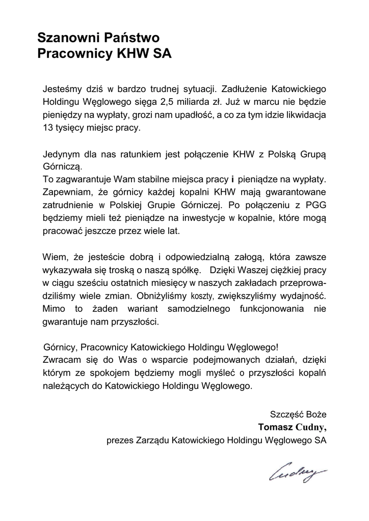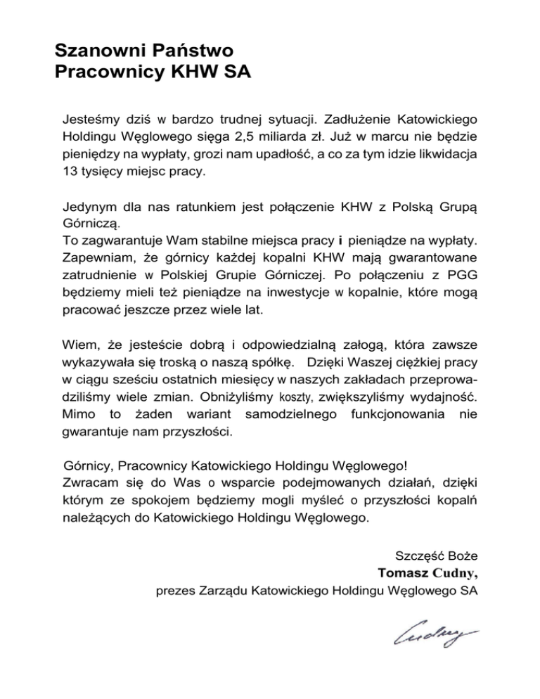 Szanowni Państwo Pracownicy KHW SA Jesteśmy dziś w bardzo trudnej sytuacji. Zadłużenie Katowickiego Holdingu Węglowego sięga 2,5 miliarda zł. Już w marcu nie będzie pieniędzy na wypłaty, grozi nam upadłość, a co za tym idzie likwidacja 13 tysięcy miejsc pracy. Jedynym dla nas ratunkiem jest połączenie KHW z Polską Grupą Górniczą. To zagwarantuje Wam stabilne miejsca pracy i pieniądze na wypłaty. Zapewniam, że górnicy każdej kopalni KHW mają gwarantowane zatrudnienie w Polskiej Grupie Górniczej. Po połączeniu z PGG będziemy mieli też pieniądze na inwestycje w kopalnie, które mogą pracować jeszcze przez wiele lat. Wiem, że jesteście dobrą i odpowiedzialną załogą, która zawsze wykazywała się troską o naszą spółkę. Dzięki Waszej ciężkiej pracy w ciągu sześciu ostatnich miesięcy w naszych zakładach przeprowadziliśmy wiele zmian. Obniżyliśmy koszty, zwiększyliśmy wydajność. Mimo to żaden wariant samodzielnego funkcjonowania nie gwarantuje nam przyszłości. Górnicy, Pracownicy Katowickiego Holdingu Węglowego! Zwracam się do Was o wsparcie podejmowanych działań, dzięki którym ze spokojem będziemy mogli myśleć o przyszłości kopalń należących do Katowickiego Holdingu Węglowego. Szczęść Boże Tomasz Cudny, prezes Zarządu Katowickiego Holdingu Węglowego SA