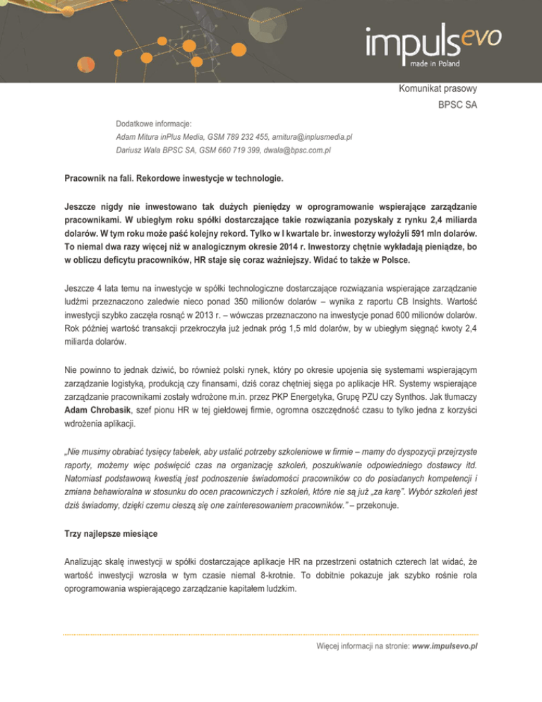 Komunikat prasowy BPSC SA Dodatkowe informacje: Adam Mitura inPlus Media, GSM 789 232 455, [email protected] Dariusz Wala BPSC SA, GSM 660 719 399, [email protected] Pracownik na fali. Rekordowe inwestycje w technologie. Jeszcze nigdy nie inwestowano tak dużych pieniędzy w oprogramowanie wspierające zarządzanie pracownikami. W ubiegłym roku spółki dostarczające takie rozwiązania pozyskały z rynku 2,4 miliarda dolarów. W tym roku może paść kolejny rekord. Tylko w I kwartale br. inwestorzy wyłożyli 591 mln dolarów. To niemal dwa razy więcej niż w analogicznym okresie 2014 r. Inwestorzy chętnie wykładają pieniądze, bo w obliczu deficytu pracowników, HR staje się coraz ważniejszy. Widać to także w Polsce. Jeszcze 4 lata temu na inwestycje w spółki technologiczne dostarczające rozwiązania wspierające zarządzanie ludźmi przeznaczono zaledwie nieco ponad 350 milionów dolarów – wynika z raportu CB Insights. Wartość inwestycji szybko zaczęła rosnąć w 2013 r. – wówczas przeznaczono na inwestycje ponad 600 milionów dolarów. Rok później wartość transakcji przekroczyła już jednak próg 1,5 mld dolarów, by w ubiegłym sięgnąć kwoty 2,4 miliarda dolarów. Nie powinno to jednak dziwić, bo również polski rynek, który po okresie upojenia się systemami wspierającym zarządzanie logistyką, produkcją czy finansami, dziś coraz chętniej sięga po aplikacje HR. Systemy wspierające zarządzanie pracownikami zostały wdrożone m.in. przez PKP Energetyka, Grupę PZU czy Synthos. Jak tłumaczy Adam Chrobasik, szef pionu HR w tej giełdowej firmie, ogromna oszczędność czasu to tylko jedna z korzyści wdrożenia aplikacji. „Nie musimy obrabiać tysięcy tabelek, aby ustalić potrzeby szkoleniowe w firmie – mamy do dyspozycji przejrzyste raporty, możemy więc poświęcić czas na organizację szkoleń, poszukiwanie odpowiedniego dostawcy itd. Natomiast podstawową kwestią jest podnoszenie świadomości pracowników co do posiadanych kompetencji i zmiana behawioralna w stosunku do ocen pracowniczych i szkoleń, które nie są już „za karę”. Wybór szkoleń jest dziś świadomy, dzięki czemu cieszą się one zainteresowaniem pracowników.” – przekonuje. Trzy najlepsze miesiące Analizując skalę inwestycji w spółki dostarczające aplikacje HR na przestrzeni ostatnich czterech lat widać, że wartość inwestycji wzrosła w tym czasie niemal 8-krotnie. To dobitnie pokazuje jak szybko rośnie rola oprogramowania wspierającego zarządzanie kapitałem ludzkim. Więcej informacji na stronie: www.impulsevo.pl „HR to obszar, który przez wiele lat zaniedbywano i którego przez wiele lat nie traktowano strategicznie. Jeśli informatyzowano firmę, to przede wszystkim w obszarze finansów, logistyki czy produkcji. Teraz mamy do czynienia z rynkiem pracownika, na rynku brakuje specjalistów, firmy szukają więc rozwiązań, które pozwoliłyby im przyśpieszyć rekrutację, zwiększyć wydajność pracowników i zatrzymać talenty w firmach. To siłą rzeczy wpływa na zwiększenie inwestycji w spółki, które takie rozwiązania dostarczają.” – tłumaczy Anna Węgrzyn, wieloletni praktyk HR z firmy BPSC, która wdrożyła system wspierający zarządzanie personelem m.in. w giełdowym Sythosie, Maspexie czy Centrum Nauki Kopernik. Jak wynika z raportu CBInsights, wiele wskazuje na to, że ten rok może być dla firm technologicznych jeszcze lepszy niż poprzedni. Tylko w I kwartale zrealizowano aż 106 transakcji na kwotę 591 mln dolarów. Startup SnagAJob pozyskał z rynku 100 milionów dolarów, a serwis pośrednictwa pracy Hired 40 milionów dolarów. To dokładnie tyle, ile Checkr dostarczający aplikację weryfikującą pracowników pod kątem ich zobowiązań finansowych, kryminalnej przeszłości, czy historii jazdy samochodem. Po rekordowym II kwartale 2015 r., były to trzy najlepsze miesiące w historii dostawców oprogramowania HR wspierających wybrane procesy HR. Zarządzanie talentami w cenie Jak wskazuje raport CBInsights, nie każda firma dostarczająca aplikacje HR może liczyć na duże wsparcie inwestorów. Choć najwięcej firm tworzy rozwiązania wspierające rekrutację, sporo jest też serwisów rekrutacyjnych, to jednak największe wsparcie otrzymują firmy, które tworzą rozwiązania wspierające wszystkie podprocesy HR. „W małych firmach wystarczą rozwiązania „wyspowe”, takie jak np. aplikacje rekrutacyjne. W średnich i dużych przedsiębiorstwach wsparcie potrzebne jest już właściwie w każdym obszarze – od etapu planowania, poprzez rekrutację i onboarding pracownika, dopasowania go do stanowiska, rozwój kariery, realizację ocen, powiązanie efektywnością indywidualnej z poziomem wynagrodzeń. Bez analizy informacji z tych kilku obszarów trudno uzyskać całościowy obraz pracownika w organizacji. Nie bez powodu to w takich rozwiązaniach inwestorzy dostrzegają największy potencjał.” – zwraca uwagę Anna Węgrzyn z BPSC. Ekscesy nie wystraszyły inwestorów Na przestrzeni ostatnich 5 lat największe dofinansowanie pozyskał Zenefits dostarczający oprogramowanie do zarządzania pracownikami w małych i średnich firmach. Firma pozyskała z rynku aż 584 mln dolarów – niemal dwukrotnie więcej niż w latach 2012 – 2016 zdobyli jej konkurenci. To o tyle ciekawe, że spółka miała w ostatnim czasie spore problemy. Ten najszybciej rosnący dostawca oprogramowania w modelu SaaS został najpierw oskarżony o realizowanie działań niezgodnych z prawem, a następnie o alkoholowe ekscesy, które miały miejsce w siedzibie firmy. Nie przestraszyło to jednak inwestorów, którzy uwierzyli w firmę i dofinansowali ją w maju br. kwotą pół miliarda dolarów. Więcej informacji na stronie: www.impulsevo.pl Oprócz Zenefit, ponad 100 milionów dolarów dofinansowania pozyskało 7 firm. Obok OneSource Virtual, czy chińskiego FXiaoKe są to m.in. GlassDoor, który jest znany j