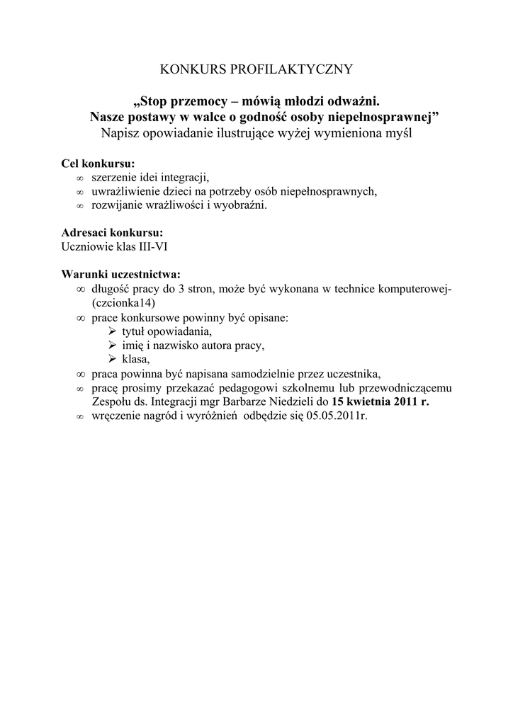 KONKURS PROFILAKTYCZNY „Stop przemocy – mówią młodzi odważni. Nasze postawy w walce o godność osoby niepełnosprawnej” Napisz opowiadanie ilustrujące wyżej wymieniona myśl Cel konkursu: • szerzenie idei integracji, • uwrażliwienie dzieci na potrzeby osób niepełnosprawnych, • rozwijanie wrażliwości i wyobraźni. Adresaci konkursu: Uczniowie klas III-VI Warunki uczestnictwa: • długość pracy do 3 stron, może być wykonana w technice komputerowej(czcionka14) • prace konkursowe powinny być opisane: tytuł opowiadania, imię i nazwisko autora pracy, klasa, • praca powinna być napisana samodzielnie przez uczestnika, • pracę prosimy przekazać pedagogowi szkolnemu lub przewodniczącemu Zespołu ds. Integracji mgr Barbarze Niedzieli do 15 kwietnia 2011 r. • wręczenie nagród i wyróżnień odbędzie się 05.05.2011r. KONKURS PROFILAKTYCZNY „Stop przemocy – mówią młodzi odważni. Nasze postawy w walce o godność osoby niepełnosprawnej” Narysuj pracę ilustrującą wyżej wymieniona myśl Cel konkursu: • szerzenie idei integracji, • uwrażliwienie dzieci na potrzeby osób niepełnosprawnych, • rozwijanie wrażliwości i wyobraźni. Adresaci konkursu: Uczniowie klas I-II Warunki uczestnictwa: • prace konkursowe powinny być opisane: tytuł opowiadania, imię i nazwisko autora pracy, klasa, • praca powinna być wykonana samodzielnie przez uczestnika, na formacie A4, • pracę prosimy przekazać pedagogowi szkolnemu lub przewodniczącemu Zespołu ds. Integracji mgr Barbarze Niedzieli do 15 kwietnia 2011 r. • wręczenie nagród i wyróżnień odbędzie się 05.05.2011r. 5 maja Dzień Godności Osób z Niepełnosprawnością Intelektualną Co roku 5 maja Europa obchodzi Dzień Godności Osób z Niepełnosprawnością Intelektualną, obchodzony także jako Europejski Dzień Walki z Dyskryminacją Niepełnosprawnych. Pomysł na obchodzony 5 maja Dzień Godności Osób Niepełnosprawnych Intelektualnie, został zaczerpnięty z Francji. Tam “Spotkanie z godnością” organizowane jest co roku i biorą w nim udział przedstawiciele najwyższych władz oraz francuskie gwiazdy. Niepełnosprawność Intelektualna spotyka się z niezrozumieniem i nietolerancją. Osoby z upośledzeniem umysłowym są napiętnowane i wyśmiewane, mają również trudności ze znalezieniem pracy. Wszystkie te bariery utrudniają im godną egzystencję. Tak być nie może, dlatego aby uzmysłowić ludziom niedolę osób niepełnosprawnych i pokazać ich siłę do walki o lepsze życie ustanowiono Europejski Dzień Walki z Dyskryminacją Osób Niepełnosprawnych. Osoby niepełnosprawne chcą być traktowane tak jak sprawne i mają do tego pełne prawo, nie tylko przez jeden dzień w roku… Dorota Zawadzka w rozmowach z Ireną A. Stanisławską „Moje dziecko cz.II. Jak mądrze kochać i dobrze wychowywać dzieci wieku szkolnym” „…Brałam udział w konferencji na temat godności człowieka. Mówiłam o tym, czym jest godność i o tym jak ważna jest w wychowaniu. O tym, jak trudno ją zdefiniować, bo tak naprawdę godność jest poczuciem własnej wartości i ma się ją z urodzenia, nie z nadania. Małe dziecko jeszcze nie ma świadomości, że ją ma i zadaniem rodziców jest zrobić wszystko, żeby się o tym dowiedziało. Rodzice muszą mu okazywać szacunek, bo bez niego dziecko nigdy nie będzie miało poczucia własnej wartości. Jeżeli słyszy, że jest głupie, nic niewarte, nie będzie miało szacunku dla samego siebie, naruszy to jego godność. A ktoś, kto nie ma szacunku do samego siebie, nie będzie szanował innych. Skoro on nic nie jest wart, tak samo nic nie warci są inni…” Dorota Zawadzka podpowiada, jak radzić sobie z problemami dzieci w wieku 6-12 lat. Porusza tematy, z którymi najczęściej borykają się rodzicezarówno te związane ze sferą emocjonalną, jak i fizyczną. Mówi o dojrzewaniu, okazywaniu uczuć, podejmowaniu samodzielnych decyzji, uzależnieniu od Internetu, o tym, jak rozwijać w dziecku pasje, jakie stosować wobec niego kary i nagrody i jak być dla niego autorytetem. Sporo miejsca poświecono szkole, której początek jest dla dziecka najczęściej szokiem.