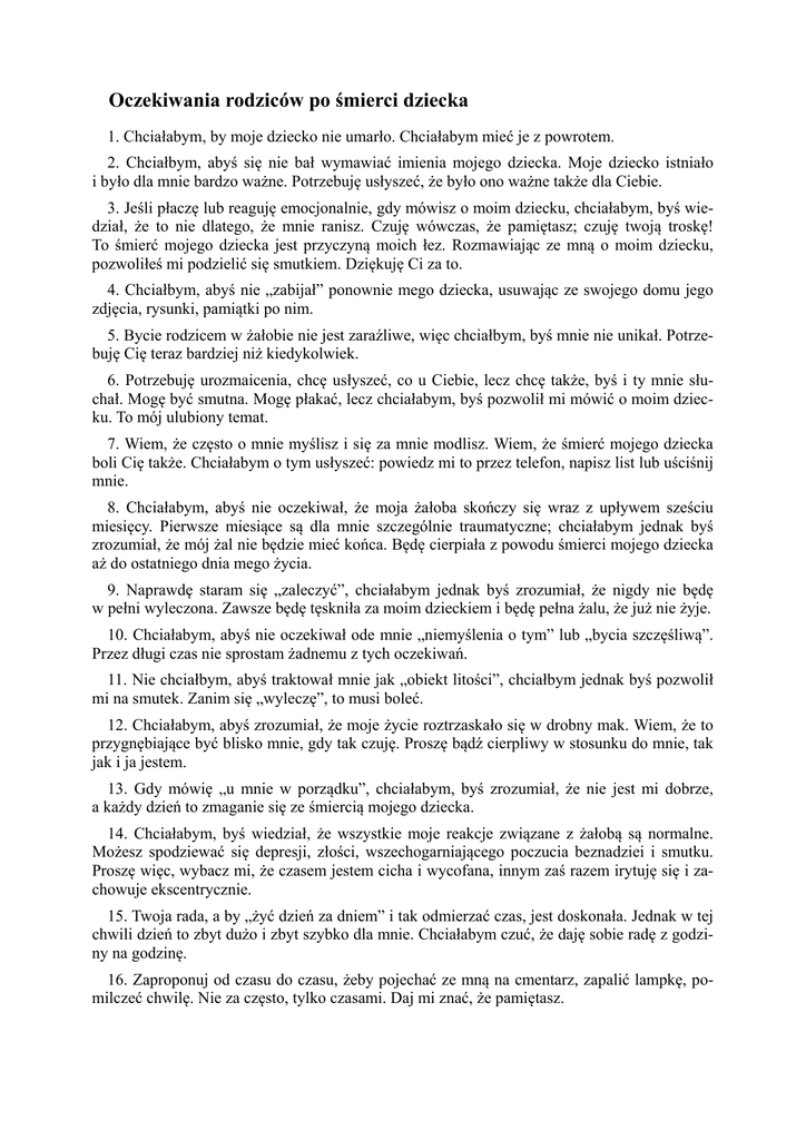 Oczekiwania rodziców po śmierci dziecka 1. Chciałabym, by moje dziecko nie umarło. Chciałabym mieć je z powrotem. 2. Chciałbym, abyś się nie bał wymawiać imienia mojego dziecka. Moje dziecko istniało i było dla mnie bardzo ważne. Potrzebuję usłyszeć, że było ono ważne także dla Ciebie. 3. Jeśli płaczę lub reaguję emocjonalnie, gdy mówisz o moim dziecku, chciałabym, byś wiedział, że to nie dlatego, że mnie ranisz. Czuję wówczas, że pamiętasz; czuję twoją troskę! To śmierć mojego dziecka jest przyczyną moich łez. Rozmawiając ze mną o moim dziecku, pozwoliłeś mi podzielić się smutkiem. Dziękuję Ci za to. 4. Chciałbym, abyś nie „zabijał” ponownie mego dziecka, usuwając ze swojego domu jego zdjęcia, rysunki, pamiątki po nim. 5. Bycie rodzicem w żałobie nie jest zaraźliwe, więc chciałbym, byś mnie nie unikał. Potrzebuję Cię teraz bardziej niż kiedykolwiek. 6. Potrzebuję urozmaicenia, chcę usłyszeć, co u Ciebie, lecz chcę także, byś i ty mnie słuchał. Mogę być smutna. Mogę płakać, lecz chciałabym, byś pozwolił mi mówić o moim dziecku. To mój ulubiony temat. 7. Wiem, że często o mnie myślisz i się za mnie modlisz. Wiem, że śmierć mojego dziecka boli Cię także. Chciałabym o tym usłyszeć: powiedz mi to przez telefon, napisz list lub uściśnij mnie. 8. Chciałabym, abyś nie oczekiwał, że moja żałoba skończy się wraz z upływem sześciu miesięcy. Pierwsze miesiące są dla mnie szczególnie traumatyczne; chciałabym jednak byś zrozumiał, że mój żal nie będzie mieć końca. Będę cierpiała z powodu śmierci mojego dziecka aż do ostatniego dnia mego życia. 9. Naprawdę staram się „zaleczyć”, chciałabym jednak byś zrozumiał, że nigdy nie będę w pełni wyleczona. Zawsze będę tęskniła za moim dzieckiem i będę pełna żalu, że już nie żyje. 10. Chciałabym, abyś nie oczekiwał ode mnie „niemyślenia o tym” lub „bycia szczęśliwą”. Przez długi czas nie sprostam żadnemu z tych oczekiwań. 11. Nie chciałbym, abyś traktował mnie jak „obiekt litości”, chciałbym jednak byś pozwolił mi na smutek. Zanim się „wyleczę”, to musi boleć. 12. Chciałabym, abyś zrozumiał, że moje życie roztrzaskało się w drobny mak. Wiem, że to przygnębiające być blisko mnie, gdy tak czuję. Proszę bądź cierpliwy w stosunku do mnie, tak jak i ja jestem. 13. Gdy mówię „u mnie w porządku”, chciałabym, byś zrozumiał, że nie jest mi dobrze, a każdy dzień to zmaganie się ze śmiercią mojego dziecka. 14. Chciałabym, byś wiedział, że wszystkie moje reakcje związane z żałobą są normalne. Możesz spodziewać się depresji, złości, wszechogarniającego poczucia beznadziei i smutku. Proszę więc, wybacz mi, że czasem jestem cicha i wycofana, innym zaś razem irytuję się i zachowuje ekscentrycznie. 15. Twoja rada, a by „żyć dzień za dniem” i tak odmierzać czas, jest doskonała. Jednak w tej chwili dzień to zbyt dużo i zbyt szybko dla mnie. Chciałabym czuć, że daję sobie radę z godziny na godzinę. 16. Zaproponuj od czasu do czasu, żeby pojechać ze mną na cmentarz, zapalić lampkę, pomilczeć chwilę. Nie za często, tylko czasami. Daj mi znać, że pamiętasz. 17. Nie mów: jesteś młoda, będziesz miała kolejne dzieci. Być może będzie dane mi się cieszyć jeszcze niejednym dzieckiem, najpierw jednak muszę opłakać to, które odeszło. I żadne inne dziecko mi go nie zastąpi. 18. Najważniejsze: Wspomnij czasem o moim dziecku. Nie udawaj, że nie istniało. Słowa mniej bolą niż uporczywe milczenie. Magdalena Harrison