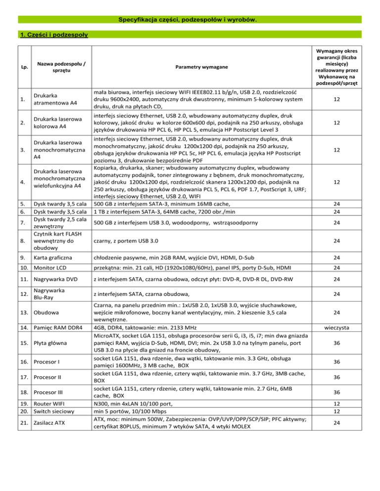 Specyfikacja części, podzespołów i wyrobów. 1. Części i podzespoły Lp. Nazwa podzespołu / sprzętu Parametry wymagane Wymagany okres gwarancji (liczba miesięcy) realizowany przez Wykonawcę na podzespół/sprzęt 1. Drukarka atramentowa A4 mała biurowa, interfejs sieciowy WIFI IEEE802.11 b/g/n, USB 2.0, rozdzielczość druku 9600x2400, automatyczny druk dwustronny, minimum 5-kolorowy system druku, druk na płytach CD, 12 2. Drukarka laserowa kolorowa A4 interfejs sieciowy Ethernet, USB 2.0, wbudowany automatyczny duplex, druk kolorowy, jakość druku w kolorze 600x600 dpi, podajnik na 250 arkuszy, obsługa języków drukowania HP PCL 6, HP PCL 5, emulacja HP Postscript Level 3 12 3. Drukarka laserowa monochromatyczna A4 4. 5. 6. 7. Drukarka laserowa monochromatyczna wielofunkcyjna A4 Dysk twardy 3,5 cala Dysk twardy 3,5 cala Dysk twardy 2,5 cala zewnętrzny Czytnik kart FLASH wewnętrzny do obudowy interfejs sieciowy Ethernet, USB 2.0, wbudowany automatyczny duplex, druk monochromatyczny, jakość druku 1200x1200 dpi, podajnik na 250 arkuszy, obsługa języków drukowania HP PCL 5c, HP PCL 6, emulacja języka HP Postscript poziomu 3, drukowanie bezpośrednie PDF Kopiarka, drukarka, skaner; wbudowany automatyczny duplex, wbudowany automatyczny podajnik, toner zintegrowany z bębnem, druk monochromatyczny, jakość druku 1200x1200 dpi, rozdzielczość skanera 1200x1200 dpi, podajnik na 250 arkuszy, obsługa języków drukowania PCL 5, PCL 6, PDF 1.7, PostScript 3, URF; interfejs sieciowy Ethernet, USB 2.0, WIFI 500 GB z interfejsem SATA-3, minimum 16MB cache, 1 TB z interfejsem SATA-3, 64MB cache, 7200 obr./min 12 12 24 24 500 GB z interfejsem USB 3.0, wodoodporny, wstrząsoodporny 24 czarny, z portem USB 3.0 24 chłodzenie pasywne, min 2GB RAM, wyjście DVI, HDMI, D-Sub 24 10. Monitor LCD przekątna: min. 21 cali, HD (1920x1080/60Hz), panel IPS, porty D-Sub, HDMI 24 11. Nagrywarka DVD z interfejsem SATA, czarna obudowa, odczyt płyt: DVD-R, DVD-R DL, DVD-RW 24 z interfejsem SATA, czarna obudowa, 24 8. 9. 12. Karta graficzna Nagrywarka Blu-Ray 13. Obudowa 14. Pamięc RAM DDR4 15. Płyta główna 16. Procesor I 17. Procesor II 18. Procesor III 19. Router WIFI 20. Switch sieciowy 21. Zasilacz ATX Czarna, na panelu przednim min.: 1xUSB 2.0, 1xUSB 3.0, wyjście słuchawkowe, wejście mikrofonowe, boczny kanał wentylacyjny, min. 2 kieszenie 3,5 cala wewnętrzne. 4GB, DDR4, taktowanie: min. 2133 MHz MicroATX, socket LGA 1151, obsługa procesorów serii G, i3, i5, i7; min dwa gniazda pamięci RAM, wyjścia D-Sub, HDMI, DVI; min. 2x USB 3.0 na tylnym panelu, port USB 3.0 na płycie dla gniazd na froncie obudowy, socket LGA 1151, dwa rdzenie, dwa wątki, taktowanie min. 3.3 GHz, obsługa pamięci 1600MHz, 3 MB cache, BOX socket LGA 1151, dwa rdzenie, cztery wątki, taktowanie min. 3.7 GHz, 3MB cache, BOX socket LGA 1151, cztery rdzenie, cztery wątki, taktowanie min. 2.7 GHz, 6MB cache, BOX N300, min 4xLAN 10/100 port, min 5 portów, 10/100 Mbps ATX, moc: minimum 500W, Zabezpieczenia: OVP/UVP/OPP/SCP/SIP; PFC aktywny; certyfikat 80PLUS, minimum 7 wtyków SATA, 4 wtyki MOLEX 24 wieczysta 36 36 36 36 12 12 24