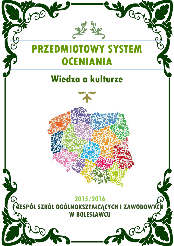 PRZEDMIOTOWY SYSTEM OCENIANIA Wiedza o kulturze 2015/2016 ZESPÓŁ SZKÓŁ OGÓLNOKSZTAŁCĄCYCH I ZAWODOWYCH W BOLESŁAWCU PRZEDMIOTOWY SYSTEM OCENIANIA (PSO) Z WIEDZY O KULTURZE W KLASACH 1-4 TECHNIKUM W ZESPOLE SZKÓŁ OGÓLNOKSZTAŁCĄCYCH I ZAWODOWYCH W BOLESŁAWCU Nauczyciele przedmiotu: mgr Paweł Domzalski I. Ustalenie ocen klasyfikacyjnych: semestralnej i końcowej 1. Na pierwszej lekcji w roku szkolnym uczeń zostaje poinformowany, jakie wymagania edukacyjne musi spełnić, aby uzyskać odpowiednie oceny z przedmiotu. 2. Uczeń otrzymuje ocenę semestralna na podstawie kryteriów oceniania oraz wymagań edukacyjnych na poszczególne oceny z wiedzy o kulturze, podanych na początku roku szkolnego. Podstawą oceniania są: • praca na lekcjach teoretycznych i praktycznych, • przygotowanie do lekcji (zadania domowe, zgromadzenie materiałów do lekcji ćwiczeniowych), • sprawdziany, dokumentacja działalności artystycznej (wiersze, inne formy literackie, rysunki, obrazy, kompozycje muzyczne itp.), • udział w olimpiadzie artystycznej, konkursach, • samodzielne opracowanie i przedstawienie podczas lekcji zagadnienia kulturowego w formie np. referatu, prezentacji PowerPoint. Przy ocenie pracy ucznia i jego postępów w nauce nauczyciel uwzględnia przede wszystkim jego aktywność i inicjatywę przejawiane w czasie zajęć, wkład pracy, rzetelność przy wykonywaniu zadań domowych. 3. Oceny nie zawierają znaków „plus” i „minus”. Natomiast znaki te występują samodzielnie, często dla zaznaczenia jakiejś drobnej sprawności lub jej braku czy też aktywności podczas lekcji albo zasygnalizowania poprawności/niepoprawności wykonania zadania domowego (trzy znaki „plus” są podstawą do wystawienia oceny cząstkowej bardzo dobry, trzy znaki „minus” są podstawą do wystawienia oceny niedostateczny. Liczba ocen w semestrze wynosi minimum trzy. 4. Uczeń może zgłosić jedno nieprzygotowanie do lekcji w semestrze. 1. Pod pojęciem nieprzygotowania należy rozumieć brak gotowości ucznia do odpowiedzi ustnej lub niezapowiedzianej kartkówki zgłoszony nauczycielowi przed zajęciami zgodnie z zasadami zawartymi na pierwszej lekcji wiedzy o kulturze. 2. Nieprzygotowanie zgłasza się przed rozpoczęciem przez nauczyciela sprawdzania listy obecności, zapisując na tablicy nr z dziennika osoby nieprzygotowanej. Na jednej lekcji nieprzygotowanie do zajęć mogą zgłosić maksymalnie 3 osoby. 3. Nie jest nieprzygotowaniem brak zadania domowego, chyba że okoliczności podane przez ucznia są na tyle istotne, że nauczyciel uzna je za wystarczające. 4. Uczeń ma prawo do zgłoszenia tylko jednego nieprzygotowania w ciągu semestru. 5. Zgłoszenie drugiego nieprzygotowania w semestrze skutkuje oceną niedostateczną. 5. Ocena końcowa w danym roku szkolnym jest oceną z obu semestrów. 6. Oceny: semestralna i końcowa nie są średnią arytmetyczną ocen cząstkowych, stosuje się system średniej ważonej. 7. Nauczyciel informuje rodziców o proponowanej ocenie klasyfikacyjnej w przewidzianym przez WSO terminie. Uczeń ma prawo poprawić każdą ocenę niedostateczną w ciągu 2 tygodni od otrzymania oceny. Sposób i formę poprawy oceny ustala nauczyciel. 8. W ocenie sprawdzianów obowiązuje następujący wskaźnik przeliczenia punktów uzyskanych przez ucznia w pracy na oceny: od 0% do 44% - niedostateczny od 45% do 59% - dopuszczający 1 od 60% do 74% - dostateczny od 75% do 90% - dobry od 91% do 100% - bardzo dobry. Oceniając sprawdzian z przedmiotu humanistycznego, jakim jest wiedza o kulturze, bierze się pod uwagę: • sposób realizacji danego zadania, • trafność jego ujęcia wynikająca z przeżycia i wrażliwości ucznia w materii zagadnień kulturowych, • dobór przykładów działań kulturowych, • pełne zrozumienie treści zjawisk i intencji twórców kultury. Dlatego też mogą być wystawione oceny: dostateczny, dobry i bardzo dobry, przy 5 % niedostatku ilościowym wykonania pracy, właśnie na korzyść jej waloru jakościowego. Sprawdziany oraz testy zapowiadane są z co najmniej tygodniowym wyprzedzeniem i są obowiązkowe dla każdego ucznia; Uczeń nieobecny na sprawdzianie lub teście z przyczyn usprawiedliwionych powinien go napisać w ciągu dwóch tygodni od dnia powrotu do szkoły; termin ustala nauczyciel z uczniem, a w przypadku jego niedotrzymania uczeń powinien napisać zaległą pracę na wezwanie nauczyciela; odmowa napisania pracy lub nieobecność nieusprawiedliwiona na sprawdzianie lub teście obowiązkowym jest podstawą do wstawienia cząstkowej oceny niedostatecznej; Uczeń może jeden raz poprawiać ocenę z pracy obowiązkowej; poprawa powinna się odbyć w ciągu dwóch tygodni od dnia otrzymania sprawdzonej pracy; Kartkówki obejmują materiał z trzech ostatnich tematów i nie muszą być zapowiadane; ocen z kartkówek nie poprawia się; Za aktywność na lekcjach uczeń otrzymuje plusy lub minusy, których ilość decyduje o ocenie cząstkowej wstawianej do dziennika pod koniec każdego semestru; Brak notatek podawanych przez nauczyciela do zeszytu przedmiotowego może być podstawą do wstawienia cząstkowej oceny niedostatecznej; W ciągu każdego semestru uczeń może jeden raz zgłosić nieprzygotowanie do lekcji (nieopanowane wiadomości) bez konsekwencji otrzymania oceny niedostatecznej, za wyjątkiem lekcji, na które zapowiedziane są obowiązkowe prace pisemne; Ocenę śródroczną i końcoworoczną ustala się na podstawie ocen cząstkowych, zachowując ich hierarchię (najwyższą wagę przypisuje się ocenom z prac pisemnych obejmujących szerszy zakres materiału); Prace dodatkowe, udział w konkursach i olimpiadach może mieć tylko korzystny wpływ na ocenę końcową ucznia i są wpisywane do dziennika na poziomie 1; Śródroczna ocena niedostateczna powinna być poprawiona przez ucznia najpóźniej do końca lutego, w formie uzgodnionej z nauczycielem; Końcoworoczna ocena niedostateczn
