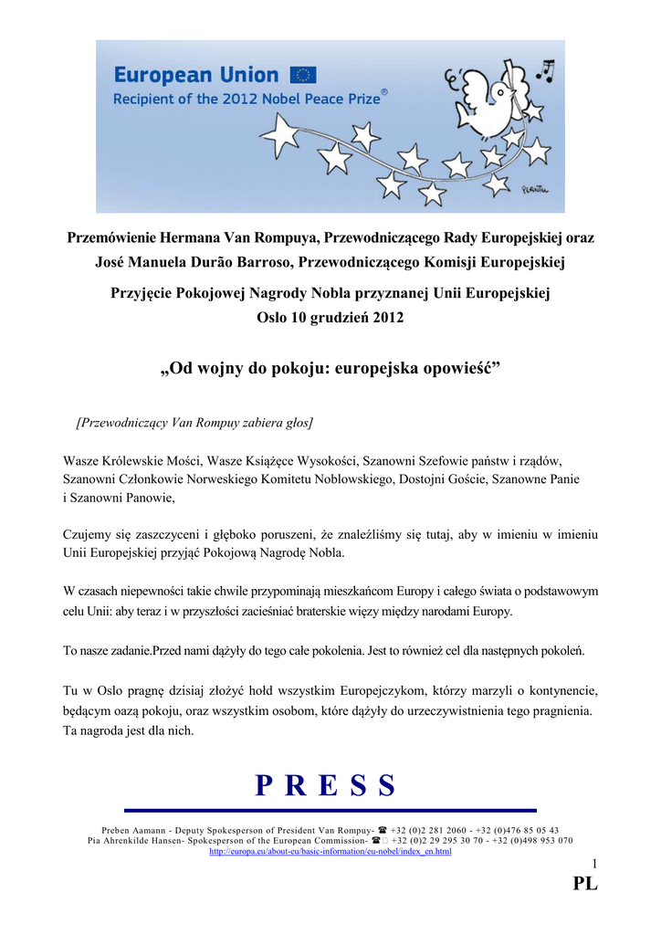 Przemówienie Hermana Van Rompuya, Przewodniczącego Rady Europejskiej oraz José Manuela Durão Barroso, Przewodniczącego Komisji Europejskiej Przyjęcie Pokojowej 'agrody 'obla przyznanej Unii Europejskiej Oslo 10 grudzień 2012 „Od wojny do pokoju: europejska opowieść” [Przewodniczący Van Rompuy zabiera głos] Wasze Królewskie Mości, Wasze Książęce Wysokości, Szanowni Szefowie państw i rządów, Szanowni Członkowie Norweskiego Komitetu Noblowskiego, Dostojni Goście, Szanowne Panie i Szanowni Panowie, Czujemy się zaszczyceni i głęboko poruszeni, że znaleźliśmy się tutaj, aby w imieniu w imieniu Unii Europejskiej przyjąć Pokojową Nagrodę Nobla. W czasach niepewności takie chwile przypominają mieszkańcom Europy i całego świata o podstawowym celu Unii: aby teraz i w przyszłości zacieśniać braterskie więzy między narodami Europy. To nasze zadanie.Przed nami dążyły do tego całe pokolenia. Jest to również cel dla następnych pokoleń. Tu w Oslo pragnę dzisiaj złożyć hołd wszystkim Europejczykom, którzy marzyli o kontynencie, będącym oazą pokoju, oraz wszystkim osobom, które dążyły do urzeczywistnienia tego pragnienia. Ta nagroda jest dla nich. PRESS Preben Aamann - Deputy Spokesperson of President Van Rompuy- ( +32 (0)2 281 2060 - +32 (0)476 85 05 43 Pia Ahrenkilde Hansen- Spokesperson of the European Commission- ( +32 (0)2 29 295 30 70 - +32 (0)498 953 070 http://europa.eu/about-eu/basic-information/eu-nobel/index_en.html 1 PL Historia wojny i historia Europy są tak samo długie. Nasz kontynent naznaczyły blizny od włóczni i mieczy, od dział i karabinów. Tragizm tych wydarzeń odzwierciedlają słowa Herodota sprzed 25 wieków: „W czasach pokoju synowie chowają swoich ojców, w czasie wojny ojcowie chowają swych synów.”. Po kataklizmach, jakimi były dla kontynentu i dla całego świata dwie pełne okrucieństwa wojny, do Europy zawitał trwały pokój. W tych strasznych dniach, gdy miasta zamieniły się w ruiny, wiele osób nosiło w sercach tylko żałobę i urazę. Jak ciężkie się wtedy wydawało, mówiąc słowami Winstona Churchilla, „odnalezienie prostych radości i nadziei, które nadałyby życiu sens”. Jako dziecko urodzone w Belgii zaraz po wojnie słyszałem takie opowieści z pierwszej ręki. Moja babka opowiadała o Pierwszej Wojnie Światowej. W 1940 r. mój ojciec, który miał wtedy siedemnaście lat, musiał wykopać swój własny grób. Udało mu się uciec, w przeciwnym razie nie byłoby mnie tutaj. Trudno sobie wyobrazić jak ciężkiego zadania podjęli się założyciele Europy, postanawiając przełamać niekończący się cykl przemocy i myślenia w kategoriach zemsty, aby wspólnie zbudować lepszą przyszłość. Jest to najlepszy dowód na to, jaką siłę potrafi mieć wyobraźnia. Nie jest wykluczone, że i bez Unii pokój zapanowałby w końcu w Europie. Być może. Nie dowiemy się tego. Jednak nigdy nie byłby to pokój o takim wymiarze. Trwały pokój, a nie wrogie zawieszenie broni. Dla mnie wyjątkową cechą pokoju w Europie jest pojednanie. Zarówno w polityce, jaki i w życiu, najtrudniej jest osiągnąć pojednanie. Pojednanie wykracza bowiem poza wybaczanie i zapomnienie czy zwykłe przejście do kolejnego etapu. Niewyobrażalne jest, czego doświadczyły Francja i Niemcy, zanim udało im się wyciągnąć do siebie rękę i podpisać układ o przyjaźni. Za każdym razem kiedy słyszę słowa Freundschaft, Amitié – jestem poruszony. To zwykłe ludzkie słowa, które nie pasują do układów między narodami. Ale wola, aby nie dopuścić do powtórki z historii, aby stworzyć coś zupełnie nowego, była tak silna, że należało znaleźć nowe sformułowania. Dla ludzi Europa była obietnicą i nadzieją. Gdy Konrad Adenauer przybył do Paryża, by zawrzeć Traktat ustanawiający Europejską Wspólnotę Węgla i Stali w 1951 r., pewnego dnia znalazł w swoim pokoju hotelowym prezent. Był to Krzyż Wojenny - odznaczenie, które należało do francuskiego żołnierza. Zostawiła je, dołączając krótką notatkę, jego córka, studentka, jako podarunek dla kanclerza, będący gestem pojednania i nadziei. 2 PL Przed moimi oczami pojawiają się inne poruszające obrazy. Przywódcy sześciu państw zgromadzeni w Rzymie, città eterna, by otworzyć nowy rozdział w historii… Klęczący w Warszawie Willy Brandt. Stoczniowcy z Gdańska manifestujący u bram stoczni. Mitterrand i Kohl trzymający się za ręce. Dwa miliony osób tworzących ludzki łańcuch łączący Tallin z Rygą w 1989 r. Te chwile zaleczyły rany Europy. Lecz same symboliczne gesty nie wystarczą, by ugruntować pokój. To właśnie tutaj pojawia się „tajna broń” Unii Europejskiej: tak zacieśniać wspólne interesy, by wojna stała się fizycznie niemożliwa. To wiązanie interesów następuje w drodze ciągłych negocjacji w wielu kwestiach przy udziale coraz większej liczby państw. Jest to złota zasada Jean Monneta: „Mieux vaut se disputer autour d'une table que sur un champ de bataille.”. („Lepiej stawić komuś czoła przy stole niż w okopach.”). Gdybym miał to wyjaśnić Alferdowi Noblowi, powiedziałabym: nie jeden kongres pokojowy, ale wieczny kongres pokoju! Przyznam, że niektóre kwestie mogą wydawać się dziwne nie tylko dla niewtajemniczonych. Ministrowie z państw bez dostępu do morza, którzy z pasją omawiają kwoty połowowe. Europarlamentarzyści ze Skandynawii debatujący nad cenami oliwy z oliwek. Unia doprowadziła sztukę kompromisu do perfekcji. Żadnych zwycięzców i pokonanych, lecz wspólne korzyści dla państw prowadzących negocjacje. Nudna polityka to niewielka cena za ten sukces. Szanowne Panie i Szanowni Panowie, Udało się. Pokój stał się oczywistością. Wojna jest sprawą niewyobrażalną. Ale to, że coś jest niewyobrażalne, nie oznacza, że jest to niemożliwe. I właśnie dlatego zebraliśmy się dziś w tym miejscu. Europa musi dotrzym