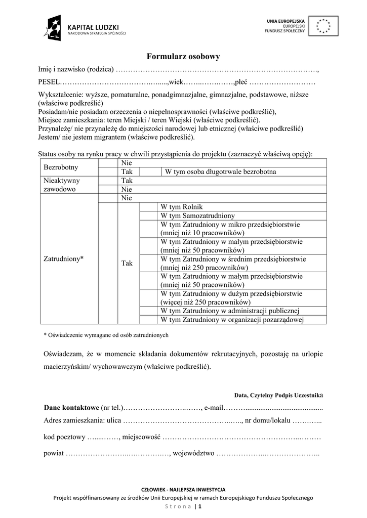 Formularz osobowy Imię i nazwisko (rodzica) ………………………………………………………………………., PESEL……………………………….….....,wiek……..…….……,płeć ……………………… Wykształcenie: wyższe, pomaturalne, ponadgimnazjalne, gimnazjalne, podstawowe, niższe (właściwe podkreślić) Posiadam/nie posiadam orzeczenia o niepełnosprawności (właściwe podkreślić), Miejsce zamieszkania: teren Miejski / teren Wiejski (właściwe podkreślić). Przynależę/ nie przynależę do mniejszości narodowej lub etnicznej (właściwe podkreślić) Jestem/ nie jestem migrantem (właściwe podkreślić). Status osoby na rynku pracy w chwili przystąpienia do projektu (zaznaczyć właściwą opcję): Nie Bezrobotny Tak W tym osoba długotrwale bezrobotna Tak Nieaktywny zawodowo Nie Nie W tym Rolnik W tym Samozatrudniony W tym Zatrudniony w mikro przedsiębiorstwie (mniej niż 10 pracowników) W tym Zatrudniony w małym przedsiębiorstwie (mniej niż 50 pracowników) Zatrudniony* W tym Zatrudniony w średnim przedsiębiorstwie Tak (mniej niż 250 pracowników) W tym Zatrudniony w małym przedsiębiorstwie (mniej niż 50 pracowników) W tym Zatrudniony w dużym przedsiębiorstwie (więcej niż 250 pracowników) W tym Zatrudniony w administracji publicznej W tym Zatrudniony w organizacji pozarządowej * Oświadczenie wymagane od osób zatrudnionych Oświadczam, że w momencie składania dokumentów rekrutacyjnych, pozostaję na urlopie macierzyńskim/ wychowawczym (właściwe podkreślić). Data, Czytelny Podpis Uczestnika Dane kontaktowe (nr tel.)……………………..……, e-mail……….......................................... Adres zamieszkania: ulica ……………………………………..….., nr domu/lokalu …….…... kod pocztowy ….....……, miejscowość ………………………………………………..……… powiat ……………………..….……….…, województwo ………………..………………….. CZŁOWIEK - NAJLEPSZA INWESTYCJA Projekt współfinansowany ze środków Unii Europejskiej w ramach Europejskiego Funduszu Społecznego S t r o n a |1 Karta zgłoszeniowa dziecka do żłobka Miejscowość wybranego żłobka: ………………………………………… 2. Dane osobowe dziecka: Imię ………….…………..………………… Nazwisko..……………………………….… 1. PESEL……………………………………… Wiek …….………………………………… Adres zamieszkania: ulica ………………………………..…., nr domu/lokalu …….…... kod pocztowy ……….………, miejscowość ………………...…………………..……….. 3. powiat …………………….………….…….., województwo …………………………….. Ilość dzieci w rodzinie ……………………………………………….……………………. 5. Czy dziecko jest alergikiem? Jeśli tak proszę podać na jakie produkty. 4. ……………………………………………………………………………………………… Czy rodzina korzysta z pomocy GOPSu? Jeśli tak proszę podać formę pomocy. 6. ……………………………………………………………………………………………… 7. Telefon kontaktowy do rodziców: ………………………………………………………… 8. Preferowane godziny pobytu dziecka w żłobku od ……………..… do ……….………… 9. Wiek dziecka: ……………………………………………………………………………… 10. Dochód (netto) na członka rodziny: ………………………………………………………. 11. Rodzic samotnie wychowujący dziecko? …………………………………………………. Data, Czytelny Podpis Uczestnika CZŁOWIEK - NAJLEPSZA INWESTYCJA Projekt współfinansowany ze środków Unii Europejskiej w ramach Europejskiego Funduszu Społecznego S t r o n a |2 Deklaracja podjęcia pracy Ja niżej podpisany/-a ………………………………………………………………...………………………………… (imię i nazwisko rodzica) Zamieszkały/zamieszkała: ulica ……………………………………., nr domu/lokalu …….…. kod pocztowy …………..…, miejscowość ………………….………………………..……….. Deklaruję, że aktywnie będę poszukiwał/poszukiwała zatrudnienia (dowolna forma zatrudnienia) lub powrócę na rynek pracy w okresie, gdy moje dziecko zostanie przyjęte do żłobka. Jednocześnie zobowiązuję się dostarczyć stosowne poświadczenie zatrudnienia (zaświadczenie od pracodawcy, potwierdzenie prowadzenia własnej działalności, itp.). Data, Czytelny Podpis Uczestnika CZŁOWIEK - NAJLEPSZA INWESTYCJA Projekt współfinansowany ze środków Unii Europejskiej w ramach Europejskiego Funduszu Społecznego S t r o n a |3 Zasady rekrutacji dzieci do żłobka, 1. Rekrutacji do żłobka podlegają dzieci w wieku od ukończenie 20 tygodnia życia do 3 lat (na dzień podpisania umowy). 2. Do żłobka mogą być przyjęte dzieci rodziców, którzy: mają status osoby bezrobotnej lub mają status osoby nieaktywnej zawodowo lub pozostają na urlopie wychowawczym lub macierzyńskim i planują powrót na rynek pracy. 3. W przypadku większej liczby zgłoszeń, pod uwagę będą brane dodatkowe kryteria - w pierwszej kolejności przyjmowane będą dzieci: rodziców legitymujących się orzeczeniem o niepełnosprawności; matek lub ojców samotnie wychowujących; w gorszym położeniu ekonomicznym, geograficznym mającym gorszy dostęp do edukacji; z rodzin wielodzietnych (3 i więcej); umieszczone w rodzinach zastępczych. 4. Jeżeli liczba zgłoszonych do żłobka dzieci, nie przekracza liczby miejsc, przyjęć dokonuje Koordynator Projektu. 5. W sytuacji, gdy więcej dzieci spełnia takie same kryteria niż l
