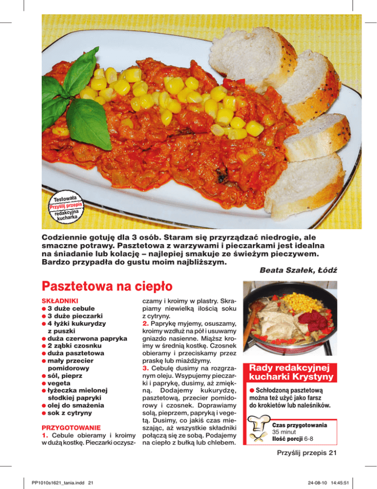 Testowała pis Przyślij prze redakcyjna kucharka Codziennie gotuję dla 3 osób. Staram się przyrządzać niedrogie, ale smaczne potrawy. Pasztetowa z warzywami i pieczarkami jest idealna na śniadanie lub kolację – najlepiej smakuje ze świeżym pieczywem. Bardzo przypadła do gustu moim najbliższym. Beata Szałek, Łódź Pasztetowa na ciepło SKŁADNIKI ● 3 duże cebule ● 3 duże pieczarki ● 4 łyżki kukurydzy z puszki ● duża czerwona papryka ● 2 ząbki czosnku ● duża pasztetowa ● mały przecier pomidorowy ● sól, pieprz ● vegeta ● łyżeczka mielonej słodkiej papryki ● olej do smażenia ● sok z cytryny PRZYGOTOWANIE 1. Cebule obieramy i kroimy w dużą kostkę. Pieczarki oczysz- czamy i kroimy w plastry. Skrapiamy niewielką ilością soku z cytryny. 2. Paprykę myjemy, osuszamy, kroimy wzdłuż na pół i usuwamy gniazdo nasienne. Miąższ kroimy w średnią kostkę. Czosnek obieramy i przeciskamy przez praskę lub miażdżymy. 3. Cebulę dusimy na rozgrzanym oleju. Wsypujemy pieczarki i paprykę, dusimy, aż zmiękną. Dodajemy kukurydzę, pasztetową, przecier pomidorowy i czosnek. Doprawiamy solą, pieprzem, papryką i vegetą. Dusimy, co jakiś czas mieszając, aż wszystkie składniki połączą się ze sobą. Podajemy na ciepło z bułką lub chlebem. Rady redakcyjnej kucharki Krystyny ● Schłodzoną pasztetową można też użyć jako farsz do krokietów lub naleśników. Czas przygotowania 35 minut Ilość porcji 6-8 Przyślij przepis 21 PP1010s1621_tania.indd 21 24-08-10 14:45:51
