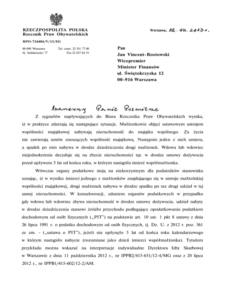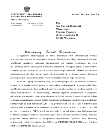 RZECZPOSPOLITA POLSKA Rzecznik Praw Obywatelskich RPO-724484/V/13/EG 00-090 Warszawa Al. Solidarności 77 Tel. centr. 22 551 77 00 Fax 22 827 64 53 Pan Jan Vincent-Rostowski Wicepremier Minister Finansów ul. Świętokrzyska 12 00-916 Warszawa Z sygnałów napływających do Biura Rzecznika Praw Obywatelskich wynika, iż w praktyce zdarzają się następujące sytuacje. Małżonkowie objęci ustawowym ustrojem wspólności majątkowej nabywają nieruchomość do majątku wspólnego. Za życia nie zawierają umów znoszących wspólność majątkową. Następnie jeden z nich umiera, a spadek po nim nabywa w drodze dziedziczenia drugi małżonek. Wdowa lub wdowiec niejednokrotnie decyduje się na zbycie nieruchomości np. w drodze umowy dożywocia przed upływem 5 lat od końca roku, w którym nastąpiła śmierć współmałżonka. Wówczas organy podatkowe stoją na niekorzystnym dla podatników stanowisku uznając, iż w wyniku śmierci jednego z małżonków znajdującego się w ustroju małżeńskiej wspólności majątkowej, drugi małżonek nabywa w drodze spadku po raz drugi udział w tej samej nieruchomości. W konsekwencji, zdaniem organów podatkowych w przypadku gdy wdowa lub wdowiec zbywa nieruchomość w drodze umowy dożywocia, udział nabyty w drodze dziedziczenia stanowi źródło przychodu podlegające opodatkowaniu podatkiem dochodowym od osób fizycznych („PIT") na podstawie art. 10 ust. 1 pkt 8 ustawy z dnia 26 lipca 1991 r. o podatku dochodowym od osób fizycznych, tj. Dz. U. z 2012 r. poz. 361 ze zm. - („ustawa o PIT"), jeżeli nie upłynęło 5 lat od końca roku kalendarzowego w którym nastąpiło nabycie (rozumiane jako dzień śmierci współmałżonka). Tytułem przykładu można wskazać na interpretacje indywidualne Dyrektora Izby Skarbowej w Warszawie z dnia 11 października 2012 r., nr IPPB2/415-651/12-4/MG oraz z 20 lipca 2012 r., nr IPPB1/415-602/12-2/AM. 2 Podstawą przyjęcia przez organy podatkowe dopuszczalności opodatkowania przychodu z tytułu zbycia nieruchomości w drodze umowy dożywocia jest mylne rozumienie terminu „nabycie" z art. 10 ust. 1 pkt 8 ustawy o PIT oraz niewłaściwe rozumienie instytucji „wspólności małżeńskiej". Na powyższe zwrócił uwagę Naczelny Sąd Administracyjny („NSA") w wyroku z dnia 8 grudnia 2011 r., sygn. akt II FSK 1101/10. W ocenie NSA wadliwy jest pogląd, zgodnie z którym w wyniku śmierci jednego z małżonków znajdującego się w ustroju małżeńskiej wspólności majątkowej, drugi małżonek nabywa w drodze spadku po pierwszym małżonku, po raz drugi, udział w tej samej nieruchomości. Z uwagi na istotę wspólności majątkowej małżeńskiej, nie jest możliwe wyodrębnienie przypadającego każdemu z małżonków udziału w nieruchomości już podczas pierwotnego, wspólnego jej nabycia. Sąd podkreślił, iż wspólność małżeńska jest szczególnym rodzajem współwłasności. Jest to wspólność bezudziałowa, w czasie której trwania małżonkowie nie mogą rozporządzać swoimi prawami do majątku wspólnego jako całości. Wspólność ta jest wspólnością masy majątkowej, to znaczy obejmuje cały zbiór praw majątkowych takich jak własność i inne prawa rzeczowe czy wierzytelności. NSA wskazał, iż współwłasność łączna, w tym wypadku wspólność majątkowa, różni się od ułamkowej tym, że nie można w niej określić ilości udziałów każdego współwłaściciela. Obu współwłaścicielom przysługuje pełne prawo do całej masy majątkowej w niej zawartej (tak: Gniewek E., Komentarz do art. 196 Kodeksu cywilnego). W ocenie Sądu, uproszczeniem jest przyjęcie przez organy podatkowe, że dochodzi do dwukrotnego nabycia nieruchomości - pierwszy raz w chwili zakupu nieruchomości wraz z współmałżonkiem w przypadku obowiązywania wspólności majątkowej - a drugi raz w wyniku dziedziczenia po śmierci współmałżonka. Skoro z uwagi na wspólność majątkową nie można wyodrębnić udziałów, które małżonkowie posiadali w chwili nabycia nieruchomości w małżeństwie, to w konsekwencji nie można przyjąć, że 5-letni termin biegnie od daty nabycia nieruchomości w drodze spadku. Nadto, NSA zwrócił uwagę, iż rozstrzyganie wątpliwości przy pomocy wykładni in dubio pro fisco ma charakter wykładni rozszerzającej. Prowadzi bowiem w sposób nieuprawniony do zmiany zakresu stosowania art. 10 ust. 1 pkt 8 ustawy o PIT poprzez objęcie jego skutkami takich stanów faktycznych, których opodatkowanie nie jest wyraźnie 3 i jednoznacznie wskazane w ustawie. Oznacza to przekroczenie, za pomocą wykładni praktycznej dokonywanej przez organ podatkowy granicy niedopuszczalności rozszerzenia zakresu opodatkowania w drodze wykładni. Mając na uwadze powyższe, Rzecznik Praw Obywatelskich z niepokojem stwierdza, iż stanowisko obecnie prezentowane przez organy podatkowe może być krzywdzące dla specyficznej kategorii podatników. W większości przypadków problem dotyczy bowiem osób starszych, które po śmierci współmałżonka niejednokrotnie decydują się na zbycie nieruchomości m.in. w drodze umowy dożywocia z powodów finansowych oraz zdrowotnych, nie zdając sobie sprawy z negatywnych konsekwencji podatkowych. Temat ten jest przedmiotem szczególnego zainteresowania ze strony Rzecznika, ponieważ przestrzeganie i ochrona praw osób starszych stanowi jeden z priorytetów obecnej kadencji. Jednocześnie w ocenie Rzecznika praktyka stosowana przez organy podatkowe stoi w sprzeczności z poglądami wyrażonymi w orzecznictwie sądów administracyjnych (tak np. przywołany wyrok NSA z dnia 8 grudnia 2011 r., sygn. akt II FSK 1101/10, a także wyrok Wojewódzkiego Sądu Administracyjnego we Wrocławiu z dnia 26 stycznia 2012 r., sygn. akt I SA/Wr 1474/11). Rzecznik ma na uwadze, iż powołane wyroki dotyczą konkretnych spraw podatników i tylko w tych sprawach rozstrzygnięcia w nich zawarte są wiążące. Niemniej jednak stwierdza, i