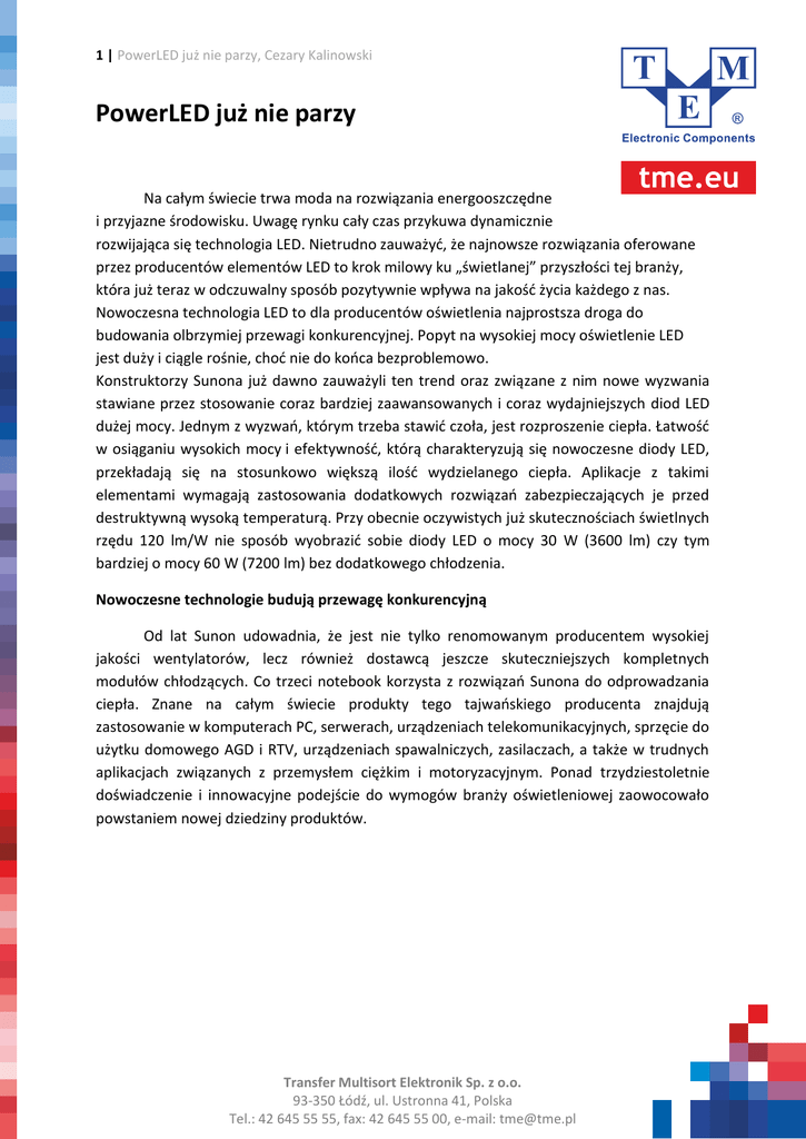 1 | PowerLED już nie parzy, Cezary Kalinowski PowerLED już nie parzy Na całym świecie trwa moda na rozwiązania energooszczędne i przyjazne środowisku. Uwagę rynku cały czas przykuwa dynamicznie rozwijająca się technologia LED. Nietrudno zauważyć, że najnowsze rozwiązania oferowane przez producentów elementów LED to krok milowy ku „świetlanej” przyszłości tej branży, która już teraz w odczuwalny sposób pozytywnie wpływa na jakość życia każdego z nas. Nowoczesna technologia LED to dla producentów oświetlenia najprostsza droga do budowania olbrzymiej przewagi konkurencyjnej. Popyt na wysokiej mocy oświetlenie LED jest duży i ciągle rośnie, choć nie do końca bezproblemowo. Konstruktorzy Sunona już dawno zauważyli ten trend oraz związane z nim nowe wyzwania stawiane przez stosowanie coraz bardziej zaawansowanych i coraz wydajniejszych diod LED dużej mocy. Jednym z wyzwań, którym trzeba stawić czoła, jest rozproszenie ciepła. Łatwość w osiąganiu wysokich mocy i efektywność, którą charakteryzują się nowoczesne diody LED, przekładają się na stosunkowo większą ilość wydzielanego ciepła. Aplikacje z takimi elementami wymagają zastosowania dodatkowych rozwiązań zabezpieczających je przed destruktywną wysoką temperaturą. Przy obecnie oczywistych już skutecznościach świetlnych rzędu 120 lm/W nie sposób wyobrazić sobie diody LED o mocy 30 W (3600 lm) czy tym bardziej o mocy 60 W (7200 lm) bez dodatkowego chłodzenia. Nowoczesne technologie budują przewagę konkurencyjną Od lat Sunon udowadnia, że jest nie tylko renomowanym producentem wysokiej jakości wentylatorów, lecz również dostawcą jeszcze skuteczniejszych kompletnych modułów chłodzących. Co trzeci notebook korzysta z rozwiązań Sunona do odprowadzania ciepła. Znane na całym świecie produkty tego tajwańskiego producenta znajdują zastosowanie w komputerach PC, serwerach, urządzeniach telekomunikacyjnych, sprzęcie do użytku domowego AGD i RTV, urządzeniach spawalniczych, zasilaczach, a także w trudnych aplikacjach związanych z przemysłem ciężkim i motoryzacyjnym. Ponad trzydziestoletnie doświadczenie i innowacyjne podejście do wymogów branży oświetleniowej zaowocowało powstaniem nowej dziedziny produktów. Transfer Multisort Elektronik Sp. z o.o. 93-350 Łódź, ul. Ustronna 41, Polska Tel.: 42 645 55 55, fax: 42 645 55 00, e-mail: [email protected] 2 | PowerLED już nie parzy, Cezary Kalinowski Rys.1 – Przykład konstrukcji modułu chłodzącego LA004-001A99 przystosowanego do pracy z diodami o mocach od 40 do 50W, zasilanego napięciem 5VDC. (Opracowanie własne na podstawie materiałów Sunona). Wychodząc naprzeciw potrzebom konstruktorów oświetlenia, Sunon stworzył i wprowadził na rynek specjalne kompaktowe moduły do odprowadzania nadmiernej ilości ciepła generowanego przez diody LED wysokiej mocy (Rys.1). Firma zapewniła w ten sposób wsparcie dla projektowania i produkcji oświetlenia o wysokim stopniu zaawansowania technologicznego i wyeliminowała barierę dla dalszego rozwoju techniki LED. Aktywne chłodzenie, zapewniane przez układ złożony z radiatora i wentylatora, umożliwia cztery razy bardziej efektywne odprowadzanie ciepła niż jego pasywne odpowiedniki. Pozwala znacznie zmniejszyć rozmiar i ciężar konstrukcji oświetlenia oraz zaoszczędzić dużą ilość materiału, przez co koszty produkcji całej lampy znacznie się obniżają. Paleta modeli modułów chłodzących zapewnia wsparcie dla aplikacji wykorzystujących diody o mocach od 10 W do nawet 180 W (Rys.2), od małych konstrukcji typu MR16 czy A19, przez projektory i oświetlenie typu downlight, aż po potężne high bay czy nawet oświetlenie uliczne. W praktyce oznacza to współpracę z konstrukcjami o strumieniu świetlnym od kilkuset do nawet 17000 lumenów. Moduły są kompatybilne z produktami światowych producentów diod LED, takimi jak: Philips, Osram, Vossloh, Bridgelux, Citizen, GE, Xicato czy Tridonic. Transfer Multisort Elektronik Sp. z o.o. 93-350 Łódź, ul. Ustronna 41, Polska Tel.: 42 645 55 55, fax: 42 645 55 00, e-mail: [email protected] 3 | PowerLED już nie parzy, Cezary Kalinowski Rys.2 – Część oferty modułów Sunon uporządkowana według mocy diody LED wymagającej chłodzenia. (Opracowanie własne na podstawie materiałów Sunona). Prosta konstrukcja i piorunujący efekt Moc użytej diody warunkuje wielkość modułu i jego wydajność. Szeroka gama modeli pozwala wybrać najodpowiedniejszy do konkretnej aplikacji. Dalej jest już tylko łatwiej; sposób montażu i dopasowania obudowy o nawet najbardziej wymyślnych kształtach jest nieskomplikowany dzięki kompaktowym wymiarom modułów (Rys.3). Rys.3 – Przykład konstrukcji obudowy do oświetlenia z aktywnym chłodzeniem Sunona. (Materiał Sunona). Transfer Multisort Elektronik Sp. z o.o. 93-350 Łódź, ul. Ustronna 41, Polska Tel.: 42 645 55 55, fax: 42 645 55 00, e-mail: [email protected] 4 | PowerLED już nie parzy, Cezary Kalinowski Wymagania stawiane projektantom przez producenta są minimalne i dotyczą tylko zapewnienia odpowiednio poprowadzonego przepływu powietrza (Rys.4a i 4b). Właśnie dzięki wymuszonemu przepływowi powietrza ciepło jest tak skutecznie wydalane z układu. Rys.4a – Przepływ powietrza w obudowie z modułem chłodzącym Sunon. (Materiał Sunona). Transfer Multisort Elektronik Sp. z o.o. 93-350 Łódź, ul. Ustronna 41, Polska Tel.: 42 645 55 55, fax: 42 645 55 00, e-mail: [email protected] 5 | PowerLED już nie parzy, Cezary Kalinowski Rys.4b - Wykres obrazujący wpływ konstrukcji obudowy na efektywność chłodzenia. (Materiał Sunona). Zapewnienie stałej, niskiej temperatury diody jest kluczowym warunkiem utrzymania wysokiej sprawności w całym okresie jej użytkowania. Często przywoływany czas życia LEDów rzędu 50000 h przyczynia się do zastosowania układu chłodzenia o takiej samej lub lepszej żywotności, aby ca