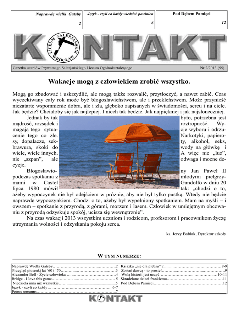Naprawdę wielki Gatsby Język - czyli co każdy wiedzieć powinien 2 6 Pod Dębem Pamięci 12 Gazetka uczniów Prywatnego Salezjańskiego Liceum Ogólnokształcącego Nr 2/2013 (55) Wakacje mogą z człowiekiem zrobić wszystko. Mogą go zbudować i uskrzydlić, ale mogą także rozwalić, przytłoczyć, a nawet zabić. Czas wyczekiwany cały rok może być błogosławieństwem, ale i przekleństwem. Może przynieść niezatarte wspomnienie dobra, ale i zła, głęboko zapisanych w świadomości, sercu i na ciele. Jak będzie? Chciałoby się jak najlepiej. I niech tak będzie. Jak najpiękniej i jak najsłoneczniej. Jednak by tak było, potrzebna jest mądrość, rozsądek i roztropność. Wymagają tego sytuacje wyboru i odrzucenie tego co złe. Narkotyki, papierosy, dopalacze, sekty, alkohol, seks, brawura, skoki do wody na główkę i wiele, wiele innych. A więc nie „luz”, nie „szpan”, ale odwaga i mocne decyzje. Błogosławiony Jan Paweł II podczas spotkania z młodymi pielgrzymami w Castel Gandolfo w dniu 20 lipca 1980 mówił tak: „chodzi o to, ażeby wypoczynek nie był odejściem w próżnię, aby nie był tylko pustką. Wtedy nie będzie naprawdę wypoczynkiem. Chodzi o to, ażeby był wypełniony spotkaniem. Mam na myśli – i owszem – spotkanie z przyrodą, z górami, morzem i lasem. Człowiek w umiejętnym obcowaniu z przyrodą odzyskuje spokój, ucisza się wewnętrznie”. Na czas wakacji 2013 wszystkim uczniom i rodzicom, profesorom i pracownikom życzę utrzymania wolności i odzyskania pokoju serca. ks. Jerzy Babiak, Dyrektor szkoły W TYM NUMERZE: Naprawdę Wielki Gatsby……………………………..………….2 Przegląd piosenki lat ‘60 i ‘70………....…………………...……3 Alexander Bell - Życie człowieka … ..……………….………….4 Bridge - I love this game……………. ...……………….………. 5 Niedziela inna niż wszystkie…….................................................5 Język - czyli co każdy ... …………….………………………...6-7 Petrus romanus……………………………………….…………..7 Książka „nie dla plebsu” ?..........……………...…….…………8-9 Zostać dawcą - to proste!………...………………...…………….9 Wolą historii jest uczyć…………………….. ….………..…10-11 Skradzione dzieci frankizmu……………………………………11 Pod Dębem Pamięci………… …………………………………12 NAPRAWDĘ WIELKI GATSBY Baz Luhrmann, reżyser takich filmów jak Australia czy nowoczesna adaptacja Romeo i Julii, po raz kolejny stworzył dzieło zachwycające rozmachem, choć nieco kontrowersyjne. „Wielki Gatsby”, jedna z najsłynniejszych powieści autorstwa wybitnego amerykańskiego pisarza, Francisa Scotta Fitzgeralda, na ekrany kin przenoszona była wielokrotnie. W Polsce najbardziej znana jest ekranizacja z 1974 roku, która znacznie różni się w swojej konwencji od tej przyjętej przez Luhrmanna. Akcja osadzona jest w Nowym Jorku lat dwudziestych, w erze jazzu i gwałtownego rozluźnienia obyczajów. Gatsby, tajemniczy milioner o nieznanej przeszłości, urządza w swojej posiadłości wystawne przyjęcia, na których hucznie bawi się śmietanka towarzyska wielkiego miasta. Jego sąsiad, Nick Carraway, jest początkującym ekonomistą, próbujących swoich sił na Wall Street. Mieszka w skromnym domku w pobliżu olbrzymiej rezydencji Gatsby’ego. Wkrótce pomiędzy Gatsbym a Carraway’em zaczyna rodzić się przyjacielska więź, a ekscentryczny bogacz prosi Nicka o przysługę. Pragnie spotkać się z jego kuzynką, Daisy, z którą przed laty połączyło go gwałtowne uczucie. Ta pozornie prosta fabuła, osnuta wokół rozpustnego życia wyższych sfer, przeradza się w jeden z najtragiczniejszych dramatów obyczajowych współczesnej kinematografii. Luhrmann doskonale bawi się uczuciami widza. Początkowo usypia jego czujność, przedstawiając sceny libacji alkoholowych, olbrzymich imprez, pełnego luksusu życia głównych bohaterów, by pod koniec filmu zaskoczyć go przepełnionym tragizmem zwieńczeniem wydarzeń. Najczęstszym zarzutem wobec adaptacji australijskiego reżysera jest wprowadzenie współczesnej muzyki, która nie wpasowuje się w klimat lat dwudziestych. Był to jednak zabieg zamierzony i udany: gdy w tle słychać Jay-Z, Lanę del Rey czy 2 Strona Florence Welch, widz czuje się niejako „jak u siebie”. Gdyby przedstawić przyjęcia, na których z gramofonu wydobywa się muzyka tamtej epoki, prawdopodobnie przeciętny odbiorca nie poczułby się tak oczarowany i w pewien sposób wchłonięty przez obraz dostatniego życia bohaterów. Tymczasem na zabawach u Gatsby’ego słychać nowoczesne przeboje, są obecne skąpo ubrane tancerki, a goście podjeżdżają z piskiem opon błyszczącymi samochodami. Choć początkowo byłam sceptycznie nastawiona do ścieżki dźwiękowej, która przywodziła na myśl raczej uzupełnienie filmu gangsterskiego niż dramatu, po skończonym seanse zrozumiałam, że idea ta była uzasadniona, a wręcz konieczna dla uwspółcześnienia przekazu powieści Fitzgeralda. W The Guardian ukazała się recenzja, która sugeruje, że „Wielki Gatsby” to przerost formy nad treścią. W istocie, można odnieść wrażenie, że przez większość filmu mamy do czynienia z niezbyt ambitnym kinem drugiej kategorii, jednak żadna scena i żadna minuta nie są tutaj zbędne. Wszystkie zmierzają ku wstrząsającemu zakończeniu. I chociaż faktycznie rozwiązanie akcji trwa zaledwie ułamek w porównaniu do pozostałych dwóch godzin budowania napięcia, to również owe pozorne powierzchowne potraktowanie kluczowego dla fabuły momentu, jedynie zwiększa jego rangę w oczach widza. Niefortunne wydarzenia następują po sobie tak szybko, że widz pozostaje z niemym niedowierzaniem. Jak to się mogło stać? Przecież w tym sztucz