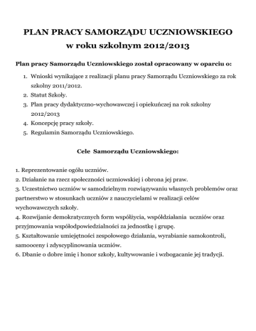 PLAN PRACY SAMORZĄDU UCZNIOWSKIEGO w roku szkolnym 2012/2013 Plan pracy Samorządu Uczniowskiego został opracowany w oparciu o: 1. Wnioski wynikające z realizacji planu pracy Samorządu Uczniowskiego za rok szkolny 2011/2012. 2. Statut Szkoły. 3. Plan pracy dydaktyczno-wychowawczej i opiekuńczej na rok szkolny 2012/2013 4. Koncepcję pracy szkoły. 5. Regulamin Samorządu Uczniowskiego. Cele Samorządu Uczniowskiego: 1. Reprezentowanie ogółu uczniów. 2. Działanie na rzecz społeczności uczniowskiej i obrona jej praw. 3. Uczestnictwo uczniów w samodzielnym rozwiązywaniu własnych problemów oraz partnerstwo w stosunkach uczniów z nauczycielami w realizacji celów wychowawczych szkoły. 4. Rozwijanie demokratycznych form współżycia, współdziałania uczniów oraz przyjmowania współodpowiedzialności za jednostkę i grupę. 5. Kształtowanie umiejętności zespołowego działania, wyrabianie samokontroli, samooceny i zdyscyplinowania uczniów. 6. Dbanie o dobre imię i honor szkoły, kultywowanie i wzbogacanie jej tradycji. Praca Samorządu Uczniowskiego dotyczy kręgów tematycznych rozwijanych i realizowanych w ciągu całego roku. Są to następujące zagadnienia: 1. Rozwijanie samorządności i aktywności uczniów. 2. Akcje charytatywne. 3. Udział SU w pracach porządkowych na rzecz szkoły i środowiska. 4. Kultura spędzania wolnego czasu – imprezy towarzyskie, szkolne lub środowiskowe. 5. Konkursy, wystawy, udział w pracach komisji oceniających prace zgłoszone do konkursów. 6. Obchody rocznic narodowych oraz uroczystości szkolnych. 7. Współpraca z rodzicami. Przewidywane osiągnięcia uczniów. 1. Uczniowie aktywnie i twórczo uczestniczą w życiu społecznym szkoły, są odpowiedzialni za jej reprezentowanie i funkcjonowanie. 2. Uczniowie nabywają umiejętności pełnienia ról społecznych i odpowiedzialności moralnej. 3. Uczniowie potrafią współpracować w budowaniu atmosfery wzajemnego szacunku i zaufania w zespole. 4. Uczniowie rozumieją zasady i normy demokracji. Zadania do wykonania: Wrzesień - przygotowanie wyborów do SU - kampania przedwyborcza - opracowanie planu pracy SU na rok szkolny 2012/2013 - kontynuacja akcji zbiórki makulatury, zużytych baterii i nakrętek Październik - Dzień Edukacji Narodowej - wybory do SU - zapoznanie przedstawicieli SU z regulaminem SU - konkurs plastyczny na portret ulubionego nauczyciela - akcja ,,Oszczędzamy w SKO” Listopad - rozwiązanie konkursu na portret ulubionego nauczyciela - Andrzejki – dyskoteka andrzejkowa, wróżby i zabawy andrzejkowe - wznowienie akcji ,,Szczęśliwy numerek” Grudzień - konkurs na świąteczny wystrój klasowy ,,Najładniej udekorowana klasa” - Mikołajki - pomoc w organizacji szkolnego kiermaszu ozdób świątecznych - Święta Bożego Narodzenia – program artystyczny Styczeń - Dzień Babci i Dziadka – konkurs plastyczny - podsumowanie konkursu "Najładniej udekorowana klasa" - włączenie się do akcji Wielkiej Orkiestry Świątecznej Pomocy - zabawa karnawałowa Luty - walentynki – poczta walentynkowa - podsumowanie pracy w pierwszym półroczu Marzec - Dzień Kobiet – wybieramy najsympatyczniejszą dziewczynę w szkole - Pierwszy Dzień Wiosny – przygotowanie konkursów i zabaw Kwiecień - Święta Wielkanocne - konkurs na najciekawszą kartkę świąteczną - Dzień Ziemi – ubieramy się na zielono, konkurs ,,ekologiczny plakat” Maj - Święto Konstytucji 3 Maja – program okolicznościowy - Dzień mamy – konkurs poetycki na najpiękniejszy wiersz dla mamy Czerwiec - Dzień Dziecka- włączenie się w przygotowanie imprez sportowych - podsumowanie pracy SU w roku szkolnym 2012/2013 - przygotowanie wniosków do realizacji w przyszłym roku szkolnym Cały rok: - udział członków SU w zebraniach - dbanie o czystość i porządek na korytarzach szkolnych oraz w czasie imprez szkolnych - dbałość o wystrój korytarza szkolnego i gazetki ściennej SU - praca na rzecz szkoły, pomoc w organizacji imprez i akcji szkolnych - konkurs na Super Klasę Plan pracy Samorządu Uczniowskiego jest otwarty na nowe, ciekawe propozycje Dyrekcji, rodziców, wychowawców klas i uczniów. W czasie roku szkolnego plan może ulec zmianie. Opracowali: Opiekunowie SU: p.Małgorzata Maczuga, p.Milena Kwiatkowska Rada SU