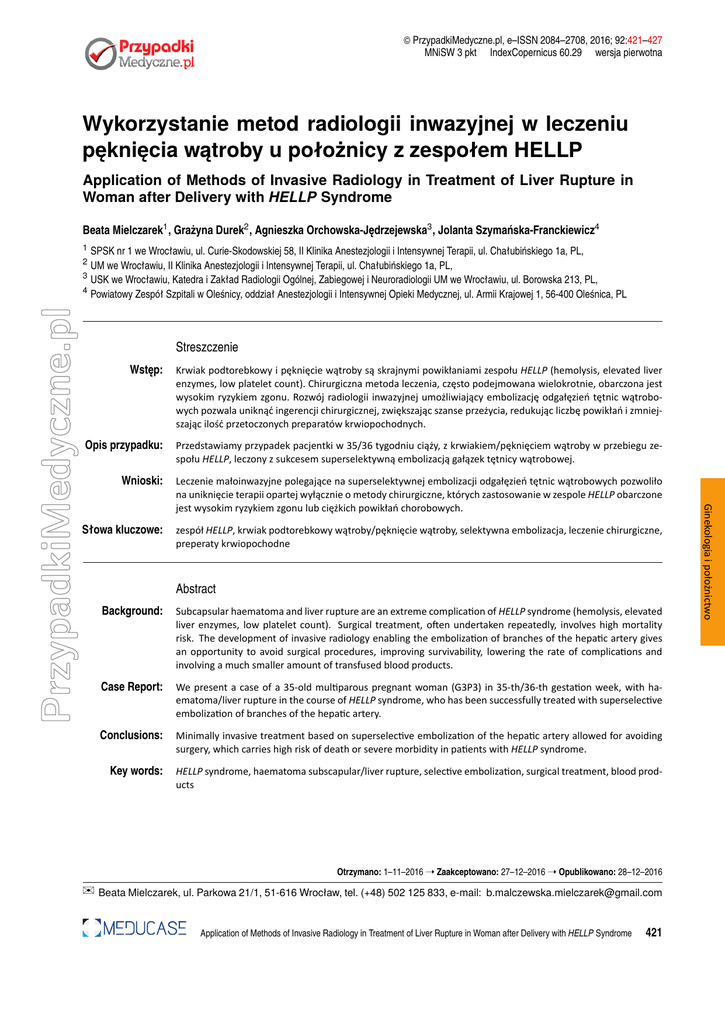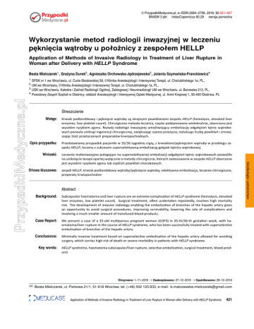 © PrzypadkiMedyczne.pl, e–ISSN 2084–2708, 2016; 92:421–427 MNiSW 3 pkt IndexCopernicus 60.29 wersja pierwotna Wykorzystanie metod radiologii inwazyjnej w leczeniu http://www.PrzypadkiMedyczne.pl pęknięcia wątroby u położnicy z zespołem HELLP Application of Methods of Invasive Radiology in Treatment of Liver Rupture in Woman after Delivery with HELLP Syndrome Beata Mielczarek1 , Grażyna Durek2 , Agnieszka Orchowska-Jędrzejewska3 , Jolanta Szymańska-Franckiewicz4 1 SPSK nr 1 we Wrocławiu, ul. Curie-Skodowskiej 58, II Klinika Anestezjologii i Intensywnej Terapii, ul. Chałubińskiego 1a, PL, UM we Wrocławiu, II Klinika Anestezjologii i Intensywnej Terapii, ul. Chałubińskiego 1a, PL, 3 USK we Wrocławiu, Katedra i Zakład Radiologii Ogólnej, Zabiegowej i Neuroradiologii UM we Wrocławiu, ul. Borowska 213, PL, 4 Powiatowy Zespół Szpitali w Oleśnicy, oddział Anestezjologii i Intensywnej Opieki Medycznej, ul. Armii Krajowej 1, 56-400 Oleśnica, PL 2 Streszczenie Krwiak podtorebkowy i pęknięcie wątroby są skrajnymi powikłaniami zespołu HELLP (hemolysis, elevated liver enzymes, low platelet count). Chirurgiczna metoda leczenia, często podejmowana wielokrotnie, obarczona jest wysokim ryzykiem zgonu. Rozwój radiologii inwazyjnej umożliwiający embolizację odgałęzień tętnic wątrobowych pozwala uniknąć ingerencji chirurgicznej, zwiększając szanse przeżycia, redukując liczbę powikłań i zmniejszając ilość przetoczonych preparatów krwiopochodnych. Opis przypadku: Przedstawiamy przypadek pacjentki w 35/36 tygodniu ciąży, z krwiakiem/pęknięciem wątroby w przebiegu zespołu HELLP, leczony z sukcesem superselektywną embolizacją gałązek tętnicy wątrobowej. Wnioski: Leczenie małoinwazyjne polegające na superselektywnej embolizacji odgałęzień tętnic wątrobowych pozwoliło na uniknięcie terapii opartej wyłącznie o metody chirurgiczne, których zastosowanie w zespole HELLP obarczone jest wysokim ryzykiem zgonu lub ciężkich powikłań chorobowych. Słowa kluczowe: zespół HELLP, krwiak podtorebkowy wątroby/pęknięcie wątroby, selektywna embolizacja, leczenie chirurgiczne, preperaty krwiopochodne Abstract Background: Subcapsular haematoma and liver rupture are an extreme complica on of HELLP syndrome (hemolysis, elevated liver enzymes, low platelet count). Surgical treatment, o en undertaken repeatedly, involves high mortality risk. The development of invasive radiology enabling the emboliza on of branches of the hepa c artery gives an opportunity to avoid surgical procedures, improving survivability, lowering the rate of complica ons and involving a much smaller amount of transfused blood products. Case Report: We present a case of a 35-old mul parous pregnant woman (G3P3) in 35-th/36-th gesta on week, with haematoma/liver rupture in the course of HELLP syndrome, who has been successfully treated with superselec ve emboliza on of branches of the hepa c artery. Conclusions: Minimally invasive treatment based on superselec ve emboliza on of the hepa c artery allowed for avoiding surgery, which carries high risk of death or severe morbidity in pa ents with HELLP syndrome. Key words: HELLP syndrome, haematoma subscapular/liver rupture, selec ve emboliza on, surgical treatment, blood products Otrzymano: 1–11–2016 Ý Zaakceptowano: 27–12–2016 Ý Opublikowano: 28–12–2016 ) Beata Mielczarek, ul. Parkowa 21/1, 51-616 Wrocław, tel. (+48) 502 125 833, e-mail: [email protected] Application of Methods of Invasive Radiology in Treatment of Liver Rupture in Woman after Delivery with HELLP Syndrome 421 Ginekologia i położnictwo Wstęp: