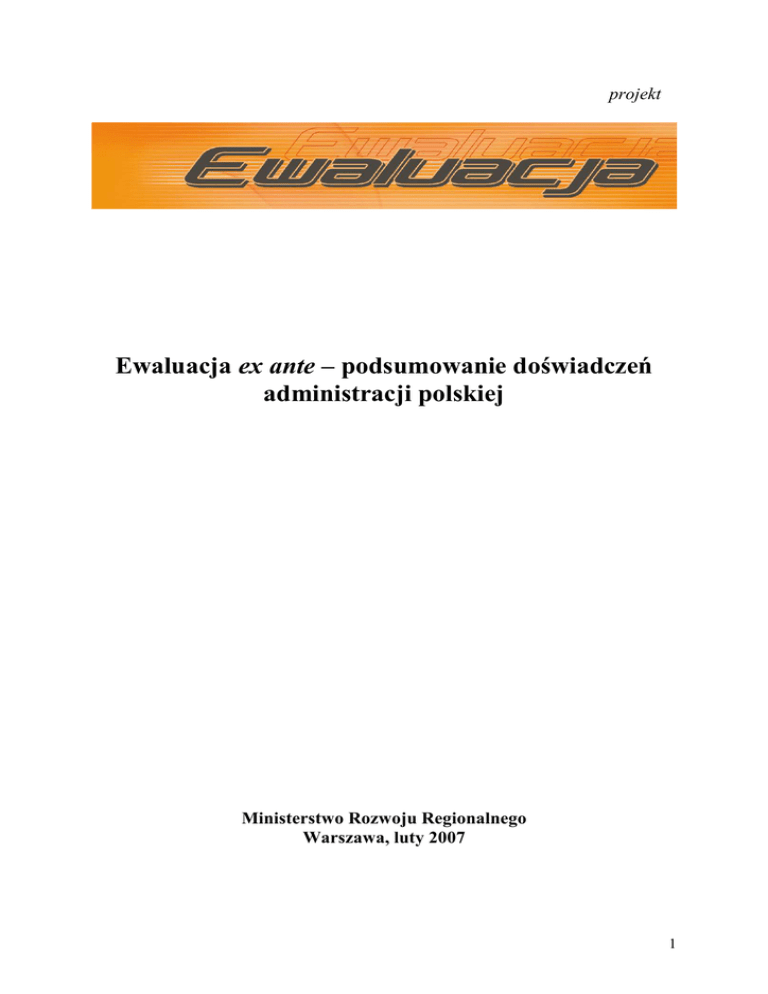 projekt Ewaluacja ex ante – podsumowanie doświadczeń administracji polskiej Ministerstwo Rozwoju Regionalnego Warszawa, luty 2007 1 Spis treści: Wstęp ............................................................................................................ 3 Leszek Korporowicz - Cele ewaluacji ex ante. Myślenie o rozwoju......... 5 Jacek Szlachta - Ewaluacja ex ante funduszy strukturalnych w Polsce - rys historyczny ................................................................................................... 9 Jacek Szlachta - Ewaluacja ex ante dokumentów programowych na lata 2007-2013 - kluczowe zagadnienia. Organizacja procesu ewaluacji........ 15 Janusz Zaleski - Ewaluacja ex ante dokumentów programowych na lata 2007-2013 – kluczowe zagadnienia........................................................... 22 Leszek Korporowicz - Metodologia badań ewaluacyjnych. O potrzebie integracji i kumulacji doświadczeń............................................................ 29 Jarosław Górniak - Diagnoza oraz strategia i jej kwantyfikacja (cele, priorytety, wskaźniki)................................................................................. 34 Andrzej Kowalczyk - Prognoza oddziaływania na środowisko .............. 44 Jacek Szlachta- Podsumowanie................................................................ 53 2 Wstęp Proces ewaluacji ex ante zainicjowany został przez administrację polską zgodnie z wymaganiami Komisji Europejskiej zawartymi w Rozporządzeniu Rady (WE) nr 1260/1999 z dnia 21 czerwca 1999 roku. Ewaluacje Narodowych Strategicznych Ram Odniesienia oraz programów operacyjnych na lata 2007-13 wykonane zostały w roku 2006 przez zewnętrznych ewaluatorów wybranych w procedurze zamówień publicznych. Stroną zlecającą ewaluacje ex ante było Ministerstwo Rozwoju Regionalnego: Krajowa Jednostka Oceny w przypadku Narodowych Strategicznych Ram Odniesienia, departamenty pełniące funkcje Instytucji Zarządzających programami operacyjnymi w przypadku programów wdraŜanych centralnie oraz Krajowa Jednostka Oceny we współpracy z Departamentem Koordynacji Programów Regionalnych w przypadku Regionalnych Programów Operacyjnych i Programu Operacyjnego Rozwój Polski Wschodniej. W celu koordynacji całego procesu ewaluacji ex ante z inicjatywy Krajowej Jednostki Oceny w ramach Ministerstwa Rozwoju Regionalnego powołany został Zespół koordynacyjny ds. ewaluacji ex ante dokumentów programowych na lata 2007-2013. Na forum Zespołu prezentowane były załoŜenia metodologiczne badań ewaluacyjnych oraz wyniki przeprowadzonych ocen jak równieŜ dyskutowane były sformułowane przez ewaluatorów wnioski i rekomendacje. W prace Zespołu zaangaŜowani zostali eksperci stanowiący wsparcie merytoryczne w zakresie organizacji procesu ewaluacji, oceny przyjmowanych raportów, oraz wykorzystania rekomendacji z przygotowanych ocen. Do współpracy z Zespołem zaproszeni zostali wybitni specjaliści posiadający wiedzę i doświadczenie w obszarach będących przedmiotem ewaluacji ex ante: Pan prof. Jarosław Górniak, Pan prof. Leszek Korporowicz, Pan prof. Andrzej Kowalczyk, Pan prof. Jacek Szlachta oraz Pan prof. Janusz Zaleski. Głównym celem niniejszej publikacji jest przedstawienie dotychczasowych doświadczeń Polski w przeprowadzaniu ewaluacji ex ante dokumentów programowych realizowanych w ramach polityki spójności UE oraz dokonanie krytycznej, zewnętrznej oceny procesu ewaluacji ex ante dokumentów programowych na lata 2007-13. Opracowanie będzie jednocześnie stanowiło przewodnik, który pomoŜe przyszłym instytucjom zarządzającym w lepszym i skuteczniejszym przeprowadzeniu procesu ewaluacji w ramach kolejnej perspektywy finansowej. Autorami opracowań w ramach publikacji są ww. eksperci uczestniczący w pracach Zespołu koordynacyjnego ds. ewaluacji ex ante dokumentów programowych na lata 20072013. Opracowania mają charakter subiektywnych ocen autorów w zakresie organizacji procesu ewaluacji ex ante oraz przedstawianych przez wykonawców raportów metodologicznych oraz raportów końcowych z ewaluacji. Ministerstwo Rozwoju Regionalnego jako zlecający wykonanie niniejszej publikacji nie ingerowało w Ŝadnym zakresie w jej treść pozostawiając ekspertom pełną swobodę w formułowaniu wniosków i ocen. 3 Publikacja składa się z trzech głównych części: − Części pierwszej stanowiącej teoretyczne wprowadzenie do problematyki ewaluacji ex ante przygotowanej przez prof. Leszka Koroprowicza. − Części drugiej będącej nakreśleniem rysu historycznego w zakresie doświadczeń administracji polskiej w obszarze ewaluacji ex ante przygotowanej przez prof. Jacka Szlachtę. − Części trzeciej będącej krytyczną oceną procesu ewaluacji ex ante dokumentów programowych na lata 2007-13 w róŜnych aspektach w obszarach kompetencji poszczególnych ekspertów (część złoŜona z pięciu niezaleŜnych opracowań przygotowanych przez prof. Jacka Szlachtę, prof. Janusza Zaleskiego, prof. Jarosława Górniaka, prof. Leszka Korporowicza oraz prof. Andrzeja Kowalczyka). 4 Prof. Leszek Korporowicz Cele ewaluacji ex ante. Myślenie o rozwoju Jeden z najwybitniejszych współczesnych ewaluatorów Michael Quinn Patton, stwierdził kiedyś w czasie licznych swych seminariów, iŜ zainteresowanie ewaluacją wynika z uświadomienia sobie jak ogromna jest rozbieŜność pomiędzy technokratyczną frazeologią i biurokratyczną procedurą realizacji wielu programów a rzeczywistą wartością ich efektów, czy choćby sposobów ich wdraŜania. JakŜe trafnie słowa te pasują do coraz bardziej koniecznej zmiany perspektywy patrzenia na planowanie publicznych i niepublicznych przedsięwzięć, których znaczenie nie wynika z przyznanych im kwot, jak równieŜ z samego faktu ich wdraŜania. To nie programy są wartością samą dla siebie, nie podejmowane w ich ramach działania, ale ich faktyczne oddziaływanie, procesy, które został