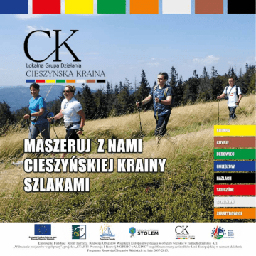 Stowarzyszenie Lokalna Grupa Działania „Cieszyńska Kraina” Lokalna Grupa Działania „Cieszyńska Kraina” leży na terenie Śląska Cieszyńskiego, a dokładnie w południowozachodniej części województwa śląskiego. Obejmuje on Beskid Śląski, Pogórze Cieszyńskie, a także kotlinę Ostrawską i Oświęcimską – łącznie 449 km kw. Obszar ten jest wyjątkowo ciekawy pod względem środowiska naturalnego, a także roztaczających się krajobrazów. Z tego względu Cieszyńska Kraina to idealne miejsce do uprawiania turystyki i wypoczynku. Powstało tu wiele tras rowerowych, szlaków tematycznych, a także ścieżek dydaktycznych. Na obszarze „Cieszyńskiej Krainy” można spotkać liczne rośliny będące pod ochroną. Począwszy od kwiatów, traw i ziół po ogromne drzewa zaliczane do pomników przyrody na czele z 800-letnią jodłą na Kotarzu. Pozostałe drzewa i rośliny można spotkać w rezerwatach przyrody m.in. na górze Tuł w Lesznej Górnej, gdzie rośnie ponad 250 gatunków storczyków, w rezerwacie „Rotuz” w Chybiu słynącym z unikalnej roślinności bagiennej, albo w rezerwacie Zadni Gaj w Cisownicy z pięknymi olbrzymimi cisami. Naturalne bogactwo Cieszyńskiej Krainy to nie tylko roślinność. Żyje tu wiele gatunków zwierząt wśród nich sarny, dziki, lisy i zające. Zalety NORDIC WALKING Nie sposób wymienić wszystkie zalety płynące z uprawiania nordic walking. Na pewno poprawia sprawność fizyczną, dostarczając jednocześnie ogromną przyjemność. Największą jednak zaletą, jest fakt, że nordic walking może uprawiać każdy. Bez względu na wiek, kondycję fizyczną, a nawet przebyte choroby. Oprócz tego nie trzeba przejmować się specjalistycznym sprzętem, wystarczą kijki i dobre buty. Nie należy się też martwić o miejsce do treningu – każde jest dobre. Park, ulica, las, góry, plaża, im bardziej urozmaicony teren, tym lepiej. Gmina BRENNA Gmina Brenna otoczona jest z kilku stron górami. Jest to miejsce szczególnie cenione przez osoby lubiące spokój i ciszę. Wspaniałe górskie krajobrazy towarzyszą na szlakach pieszych i rowerowych. Ilość obiektów sportowych dodatkowo zachęca miłośników aktywnego wypoczynku. W Dolinie Brennicy nie brakuje także ciekawych atrakcji kulturalnych. Niemal, co tydzień odbywają się tu koncerty w amfiteatrze. Dużym zainteresowaniem cieszą się coroczne zawody rowerowe, a Artystyczne Lato u Kossaków zaspokoi nawet najbardziej wybrednych wielbicieli sztuki. Atrakcji nie brakuje ani w sezonie letnim, ani zimowym. Stara Karczma w Brennej GMINA ZEBRZYDOWICE GMINA HAŻLACH HAŻLACH GMINA STRUMIEŃ GMINA CHYBIE GMINA DĘBOWIEC GMINA SKOCZÓW GMINA GOLESZÓW GMINA BRENNA Warto zobaczyć: Kościół p.w. św. Jana Chrzciciela Kościół powstał w latach 1793-1796 w miejscu, gdzie stała dawna drewniana kaplica wybudowana przez Jezuitów. Wnętrze charakteryzuje się stylem barokowym i klasycystycznym. Ołtarz główny zdobi obraz Stanisława Jastrzębskiego, malarza z Cieszyna, przedstawiający scenę chrztu Jezusa Chrystusa w Jordanie. Muzeum Biograficzne im. Zofii Kossak-Szatkowskiej Kościół Parafialny p w św Jana Chrzciciela w Brennej Muzeum Biograficzne im. Zofii Kossak-Szatkowskiej „Dwór Kossaków’’ w Górkach Wielkich W muzeum można obejrzeć przedmioty należące do pisarki i jej najbliższej rodziny. Wnętrze zdobią obrazy Wojciecha i Juliusza Kossaków, a także Stanisława Witkacego. Zachowały się także meble, z których korzystała pisarka, wszystko to tworzy wyjątkową atmosferę obecności pisarki. Oprócz wystawy stałej organizowane są ekspozycje czasowe. Dwór Kossaków W częściowo odrestaurowanych murach dworu mieści się Centrum Kultury i Sztuki „Dwór Kossaków”. Organizowane co roku Artystyczne Lato u Kossaków przyciąga miłośników sztuki z całej Polski. Dwór tętni życiem przez cały rok, odbywają się tutaj liczne koncerty, przedstawienia teatralne, plenery malarskie oraz różnego rodzaju warsztaty. Cały obiekt został doceniony przez internautów, dzięki którym zwyciężył IV edycję konkursu „Polska Pięknieje” – 7 Cudów Funduszy Europejskich. Rzeka Brennica Gdzie maszerować Trasa 1 Długość trasy: 16 km, ok 3,5 h Oznakowanie: kolor czarny Trasa rozpoczyna się przy kościele pw. św. Jana Chrzciciela. Dalej prowadzi w kierunku Transbeskidzkiego Szlaku Konnego. Prowadzi leśnymi drogami wzdłuż szlaku turystycznego. Trasa trudna, jednak bogata w widoki. Przebieg szlaku: 1.Kościół pw. Jana Chrzciciela 2.Ulice: Rudolfa Juroszka w kierunku Huta, Malinowa, Sportowa w kierunku Transbeskidzkiego Szlaku Konnego. 3. Wzdłuż Transbeskidzkiego Szlaku, dalej ulica Grabowa, Leśnica w kierunku Kobyla Horzelica, Wyzwolenia, Leśna, Malinowa. Trasa kończy się przy kościele Jana Chrzciciela. TRASA 2 Długość trasy: 9,6 km, ok 2 h Oznakowanie: kolor czerwony Trasa rozpoczyna się przy Urzędzie Gminy Brenna. Prowadzi ulicami i szlakami leśnymi. Przebieg trasy: 1. Urząd Gminy Brenna. 2. Ulice: Wyzwolenia, Leśna, Leśnica. 3. Dalej: w prawo leśnym traktem w górę ok. 1,7 km do ostrego skrętu w prawo, 1,3 km aż do ul. Śniegociny. 4. Ulice: Śniegociny, przejście przez most na Brennicy, ul. Leśników, Jatny, Wyzwolenia. Trasa kończy się przy Urzędzie Gminy Brenna. TRASA 3 Trasa rozpoczyna się przy Centrum Kultury i Sztuki „Dwór Kossaków”. Prowadzi ulicami, częściowo nad brzegiem Brennicy. Na trasie kilka atrakcji architektoniczno-kulturalnych. Długość trasy ok. 11 km, ok. 2 godz. Oznakowanie: kolor zielony Przebieg trasy: 1. Centrum Kultury i Sztuki “Dwór Kossaków” 2. Ulice: Stary Dwór, Rzemieślnicza, Spółdzielcza, dh. Aleksandra Kamińskiego, Miczów, Zofii Kossak, Sportowa. 3. Zabytkowy kościół Wszystkich Świętych w Górkach Wielkich 4. Ulice: Lipa, Kretowskie, Barujec. 5. Skręt w lewo i przejście Brennicy po moście, dalej ulice: Górecka, Breńska. 6. Chlebowa Chata. 7. Sk